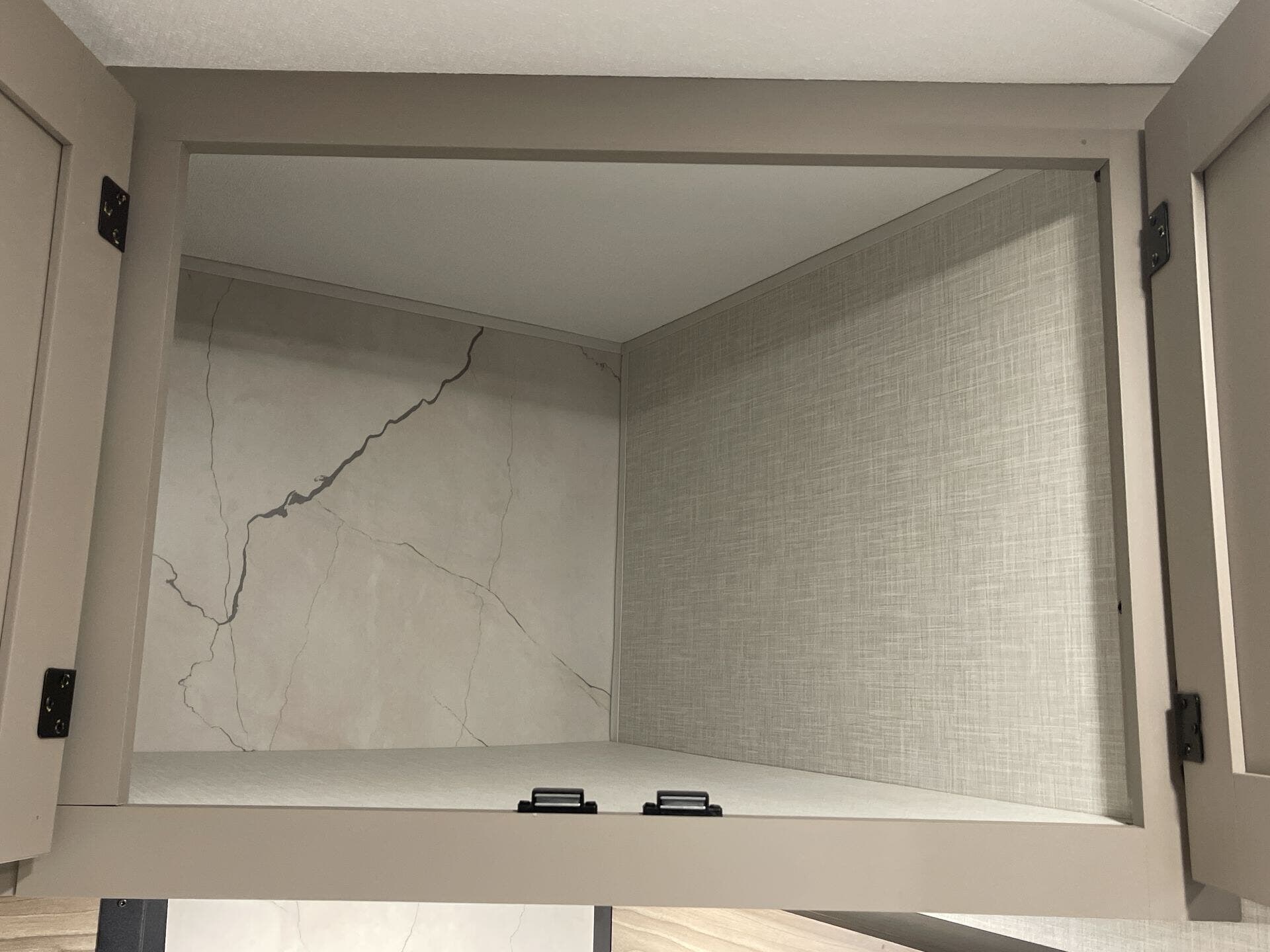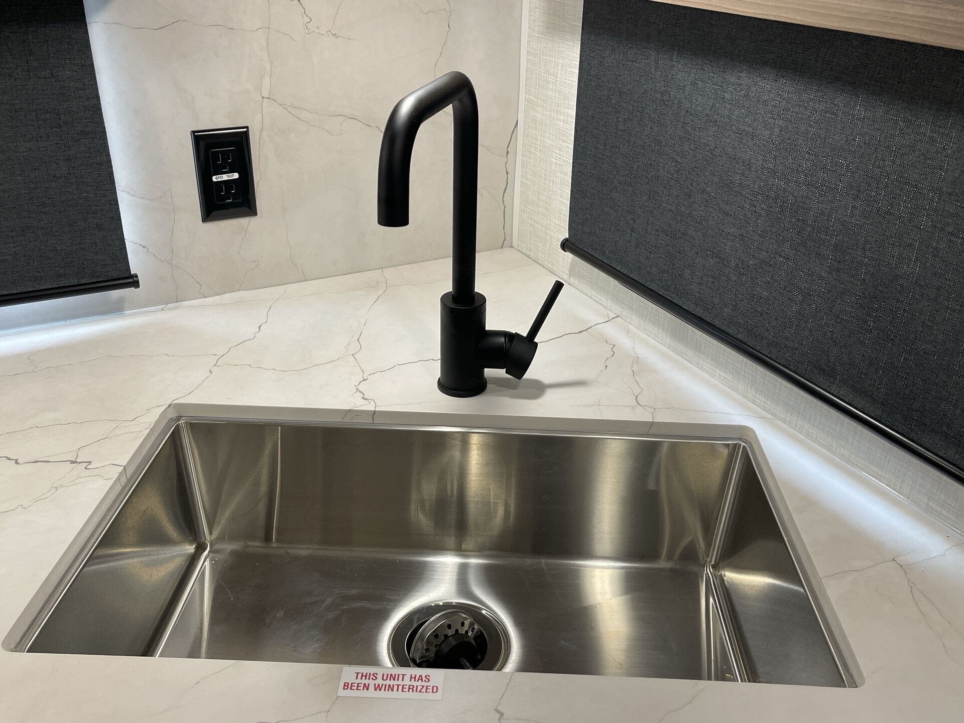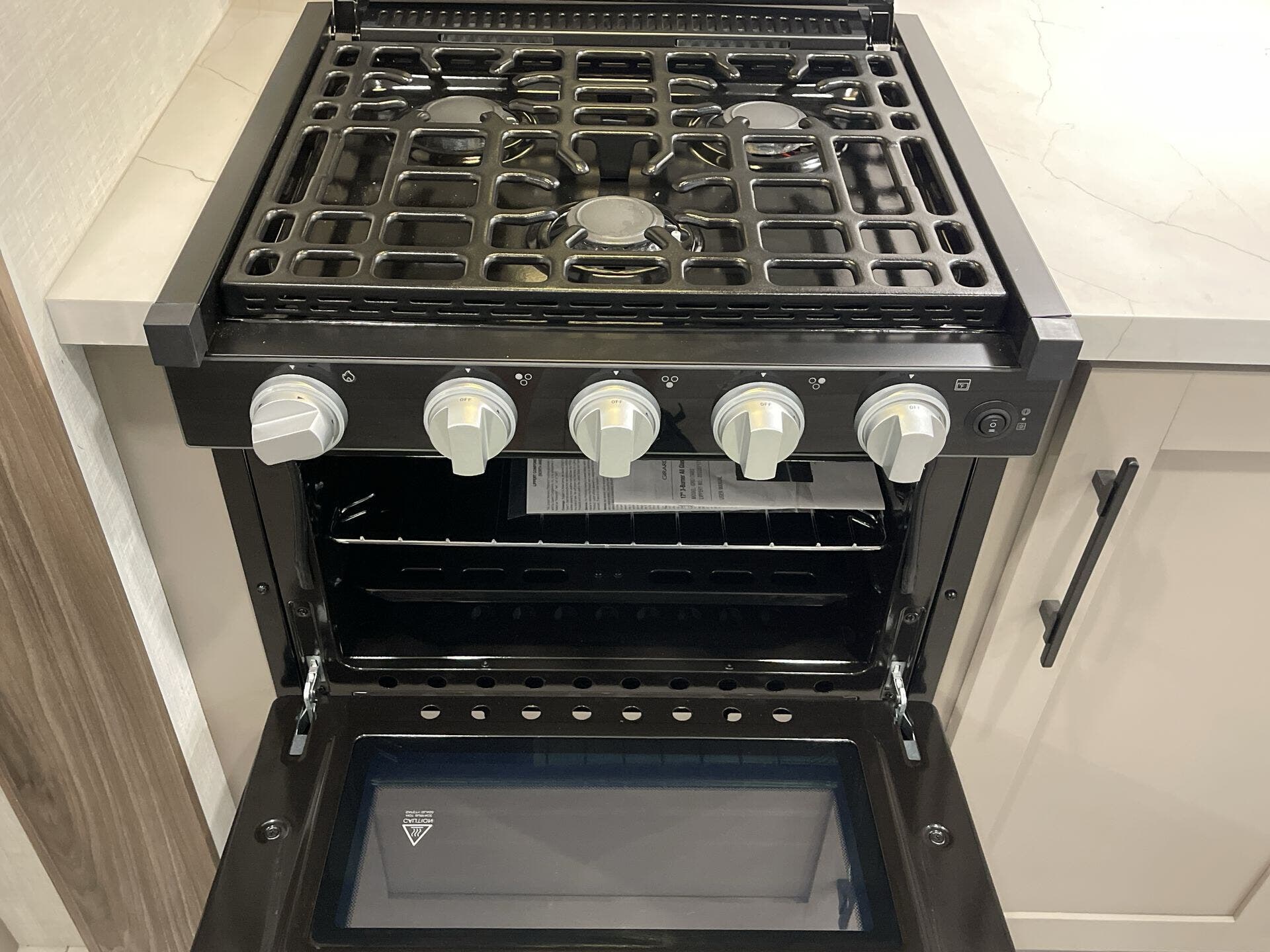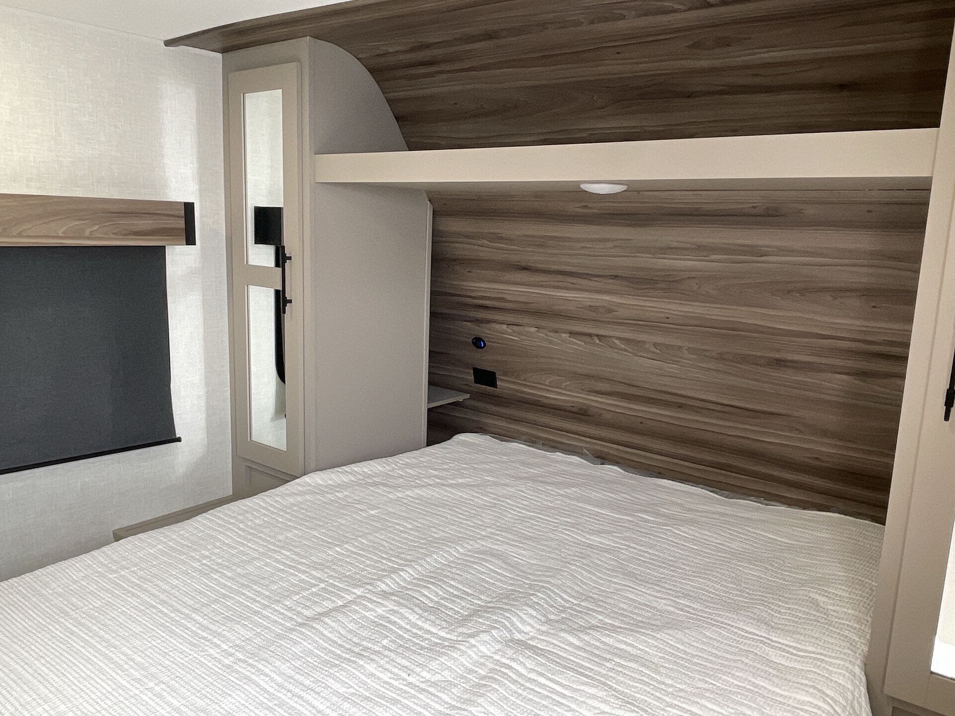 Inside, the 211MKSE offers a spacious rear kitchen layout featuring a 10 cu. ft. 12V refrigerator, three-burner cooktop, oven, microwave, and seamless countertops with a deep stainless steel sink. The slide-out houses a jackknife sofa and a booth dinette, both of which can convert into additional sleeping areas. The front bedroom includes a queen-size bed with dual wardrobes and overhead storage.
