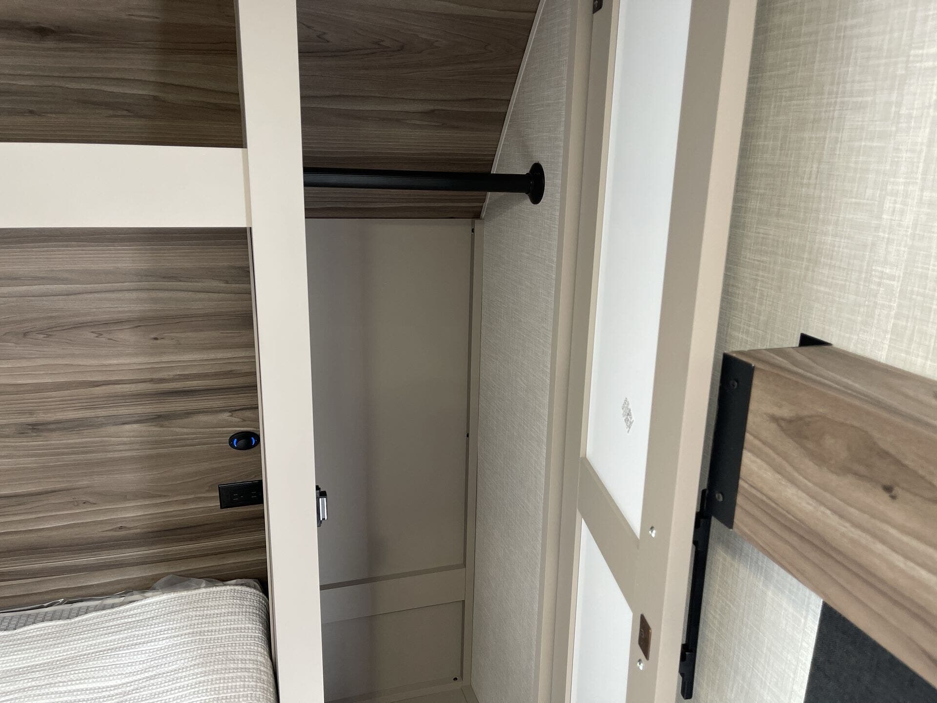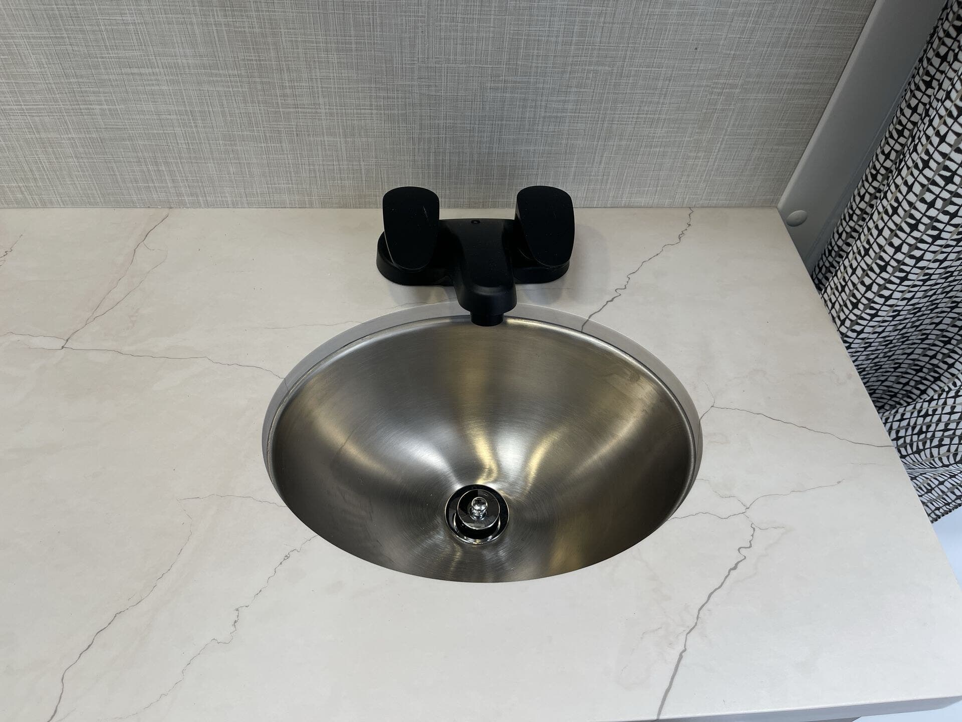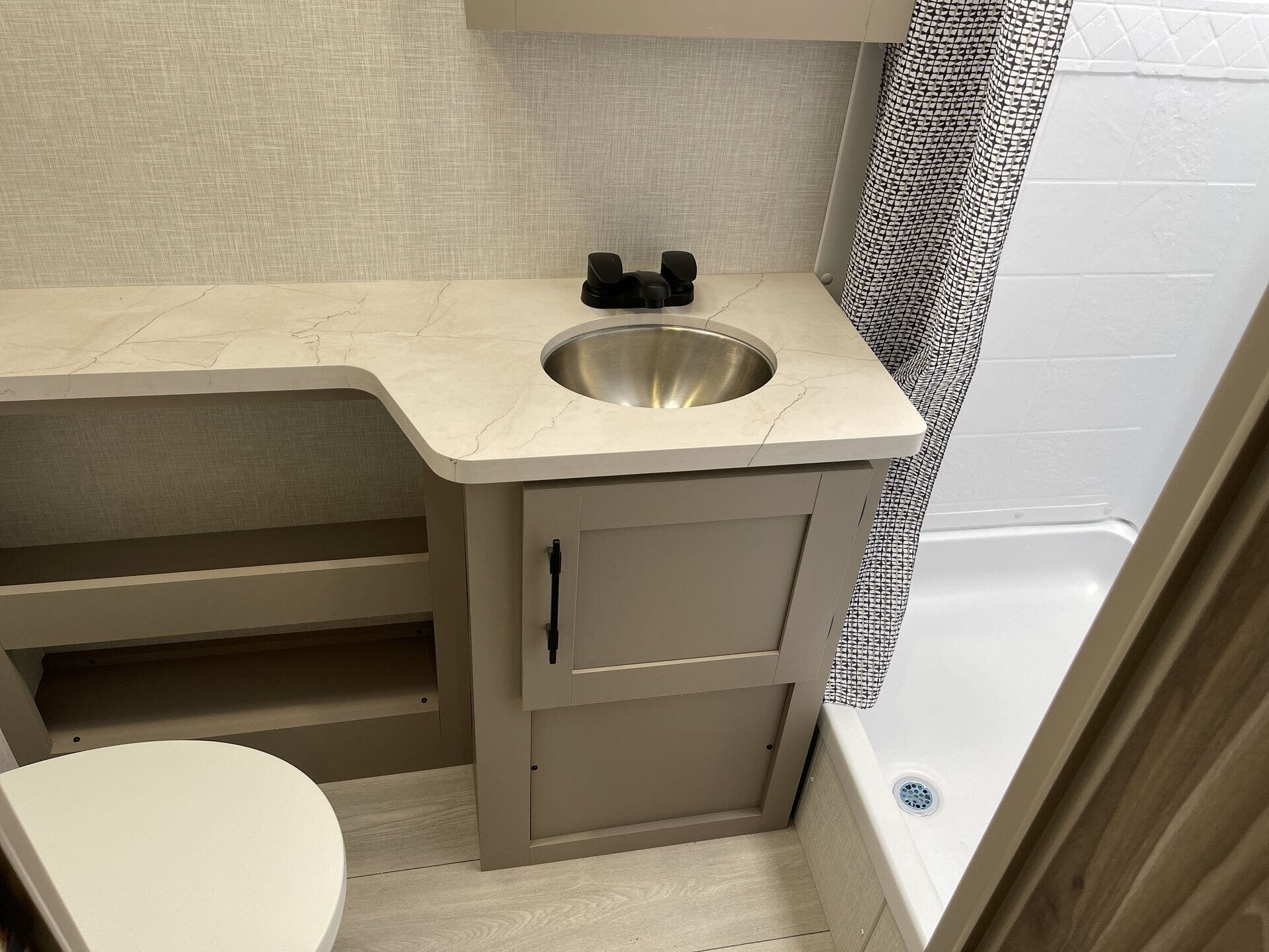 The bathroom is equipped with a 30" x 36" shower, foot-flush toilet, and vanity with a mirrored medicine cabinet. Additional features include an 18-foot power awning with LED lighting, exterior docking station, and pass-through storage.