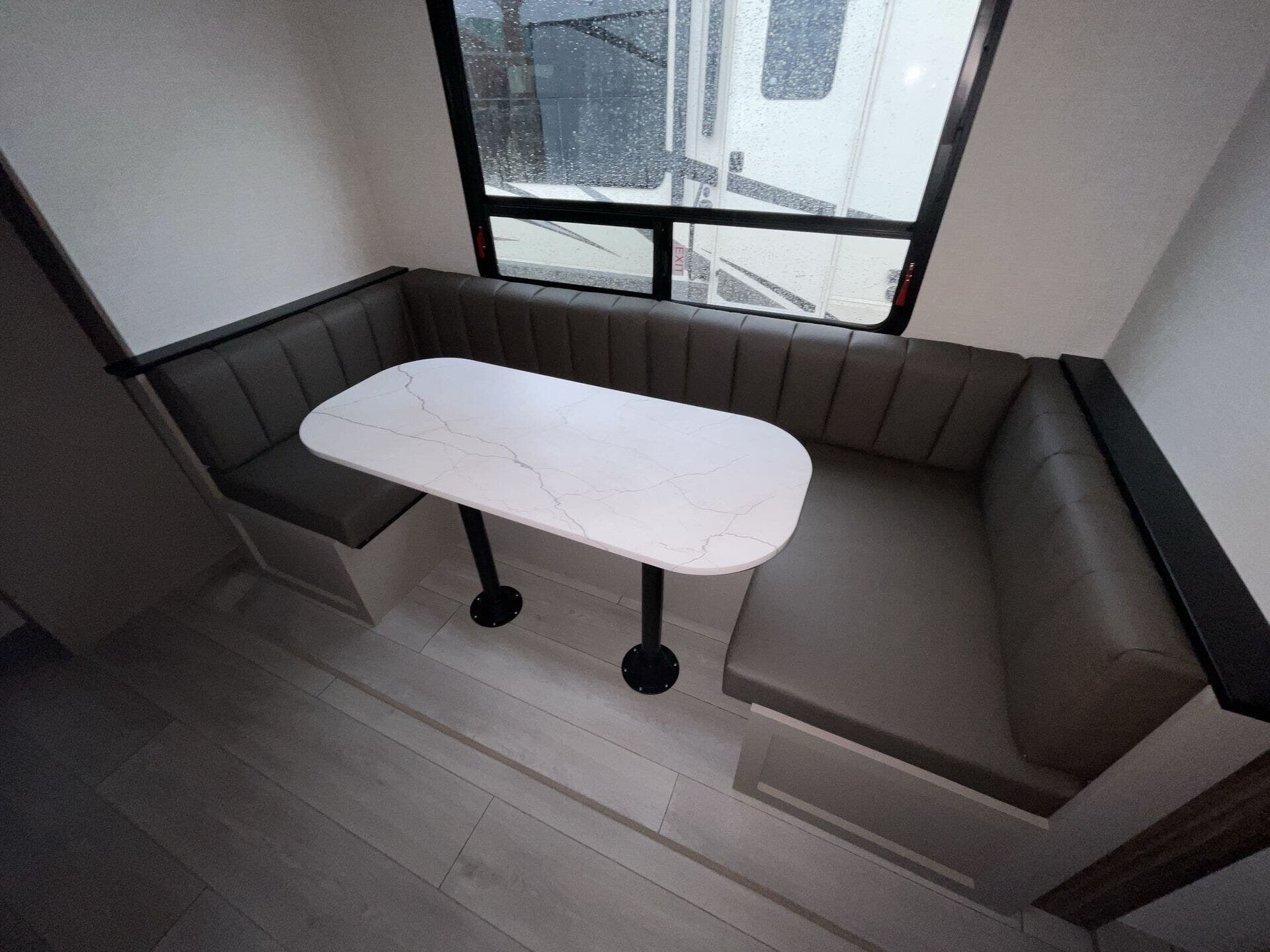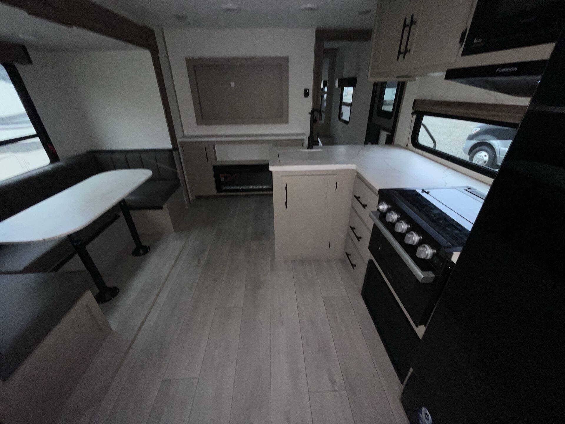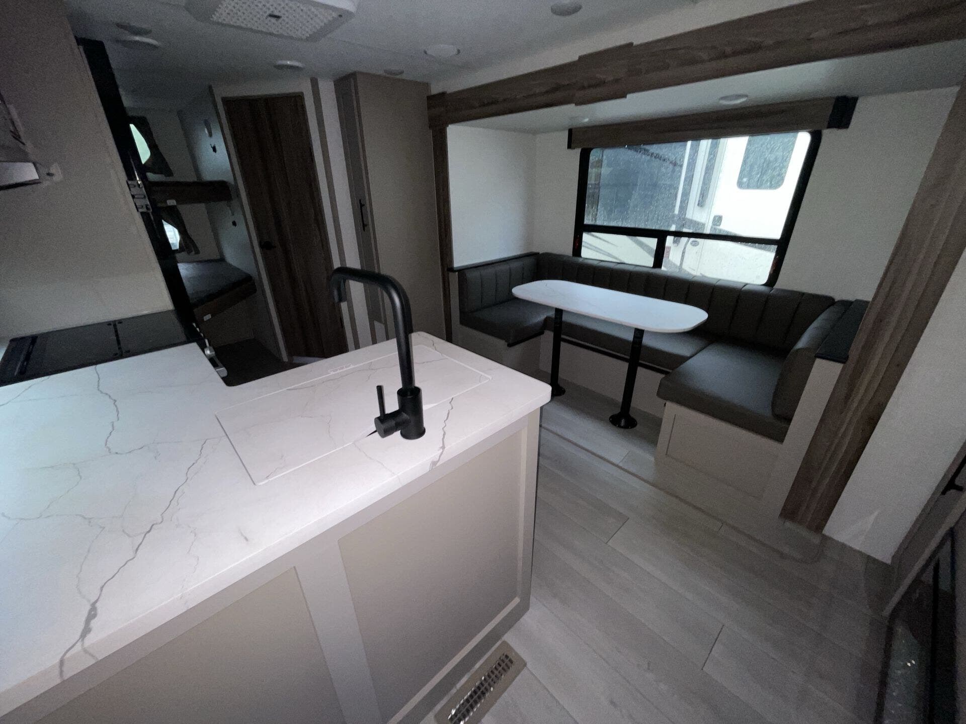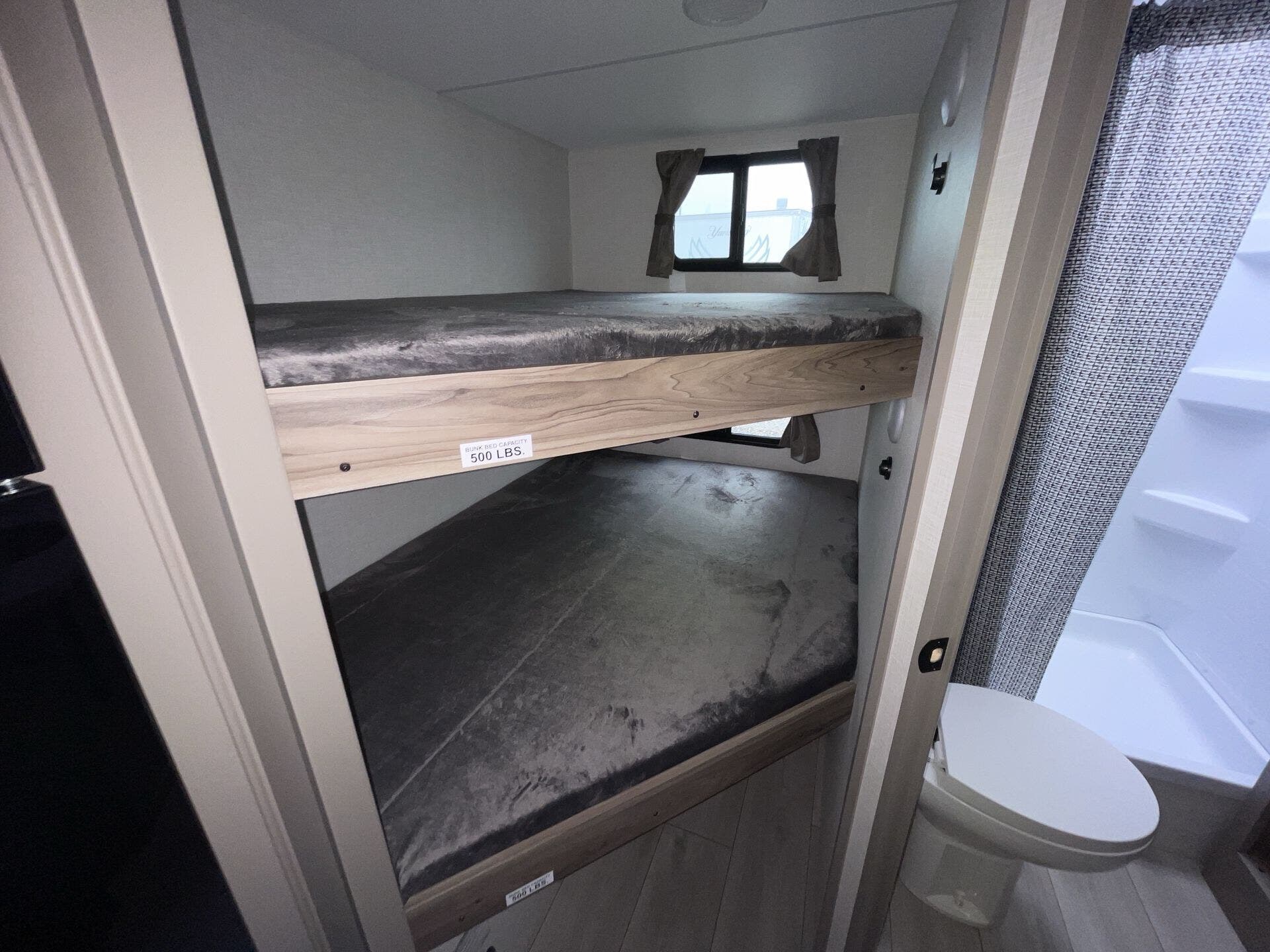 Inside, you’ll find a smart layout that maximizes space without sacrificing comfort. The double-over-double rear bunks provide plenty of room for the kids or guests, while the front private bedroom with a walk-around queen bed offers a cozy retreat for parents. The well-equipped kitchen includes stainless steel appliances, a large refrigerator, and a walk-in pantry—perfect for meal prep on the go. The U-shaped dinette gives everyone a place to gather for meals or game night, and it also converts for additional sleeping space.