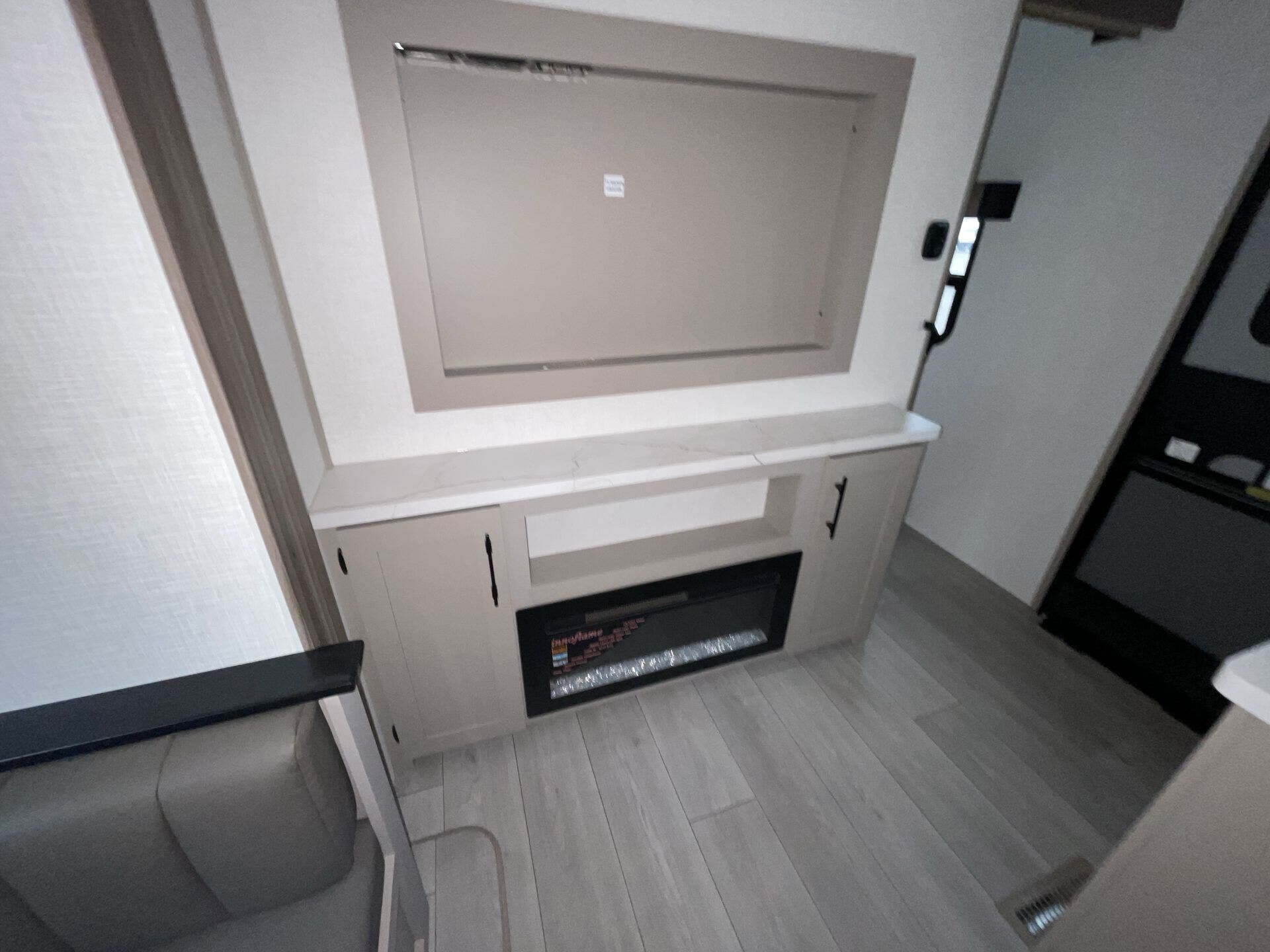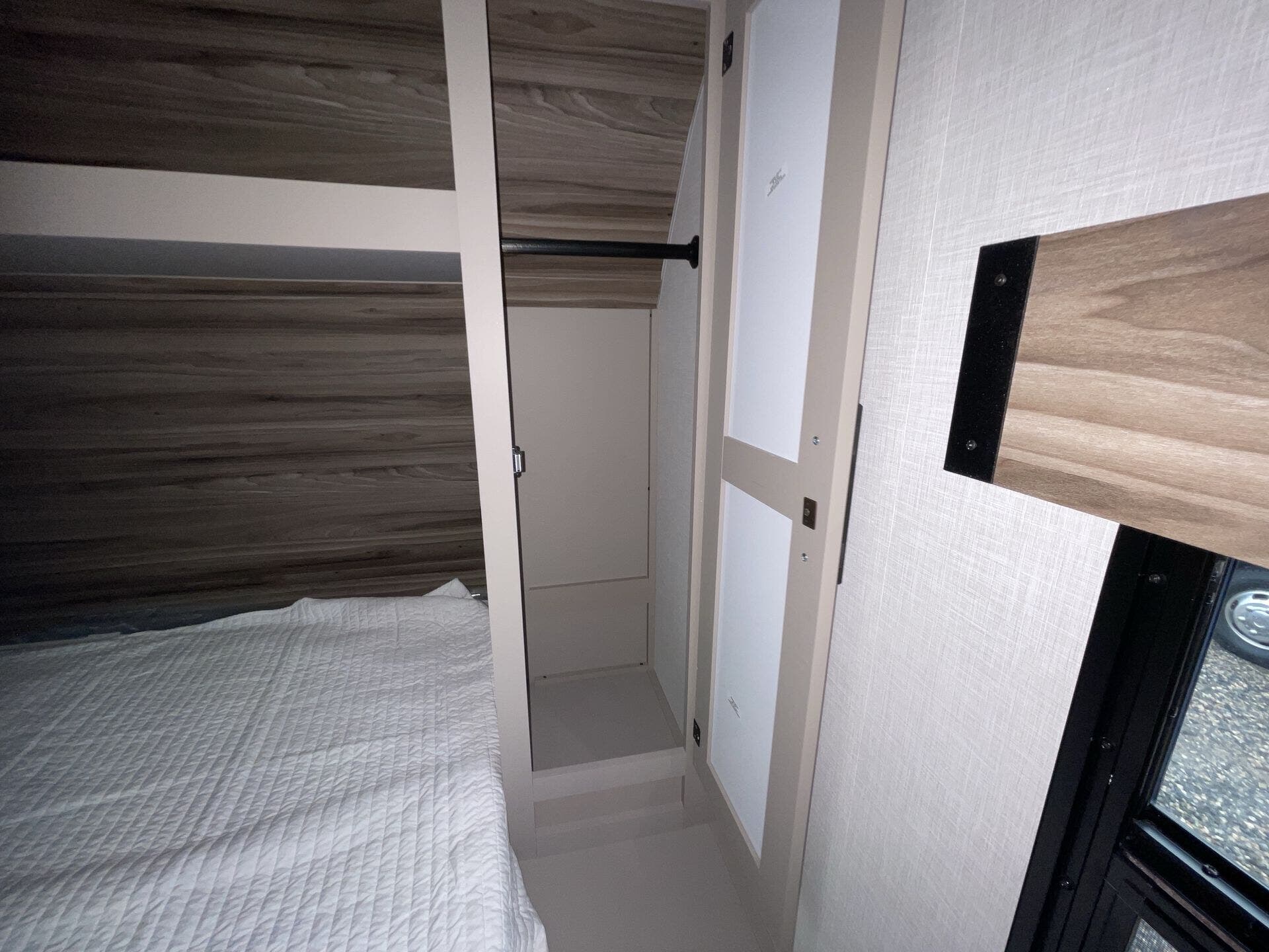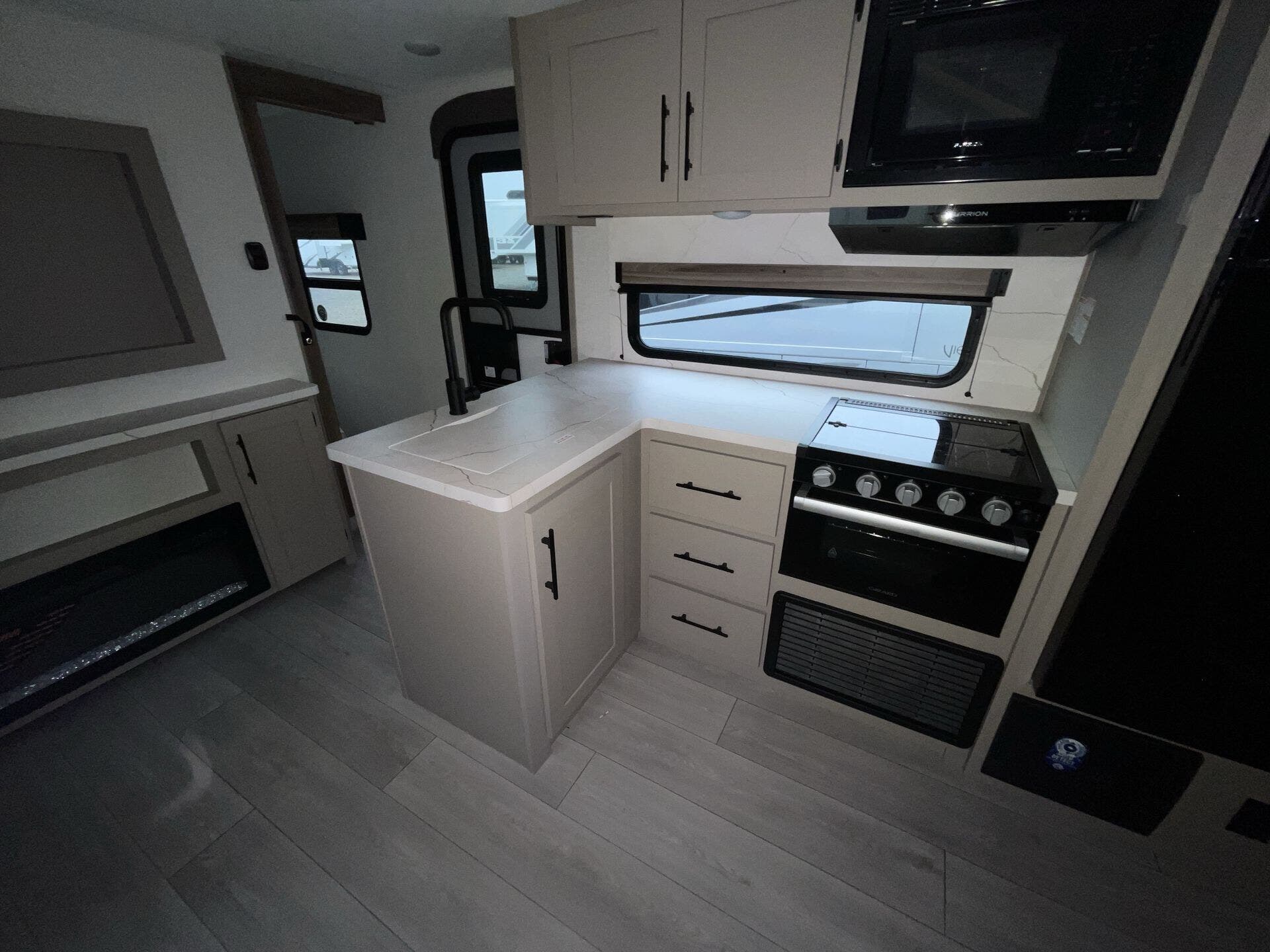 Inside, you’ll find a smart layout that maximizes space without sacrificing comfort. The double-over-double rear bunks provide plenty of room for the kids or guests, while the front private bedroom with a walk-around queen bed offers a cozy retreat for parents. The well-equipped kitchen includes stainless steel appliances, a large refrigerator, and a walk-in pantry—perfect for meal prep on the go. The U-shaped dinette gives everyone a place to gather for meals or game night, and it also converts for additional sleeping space.