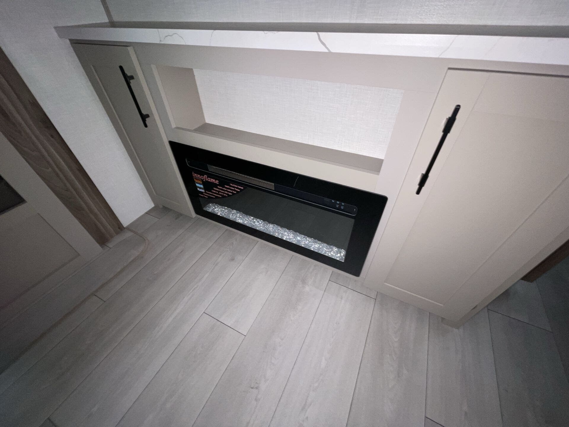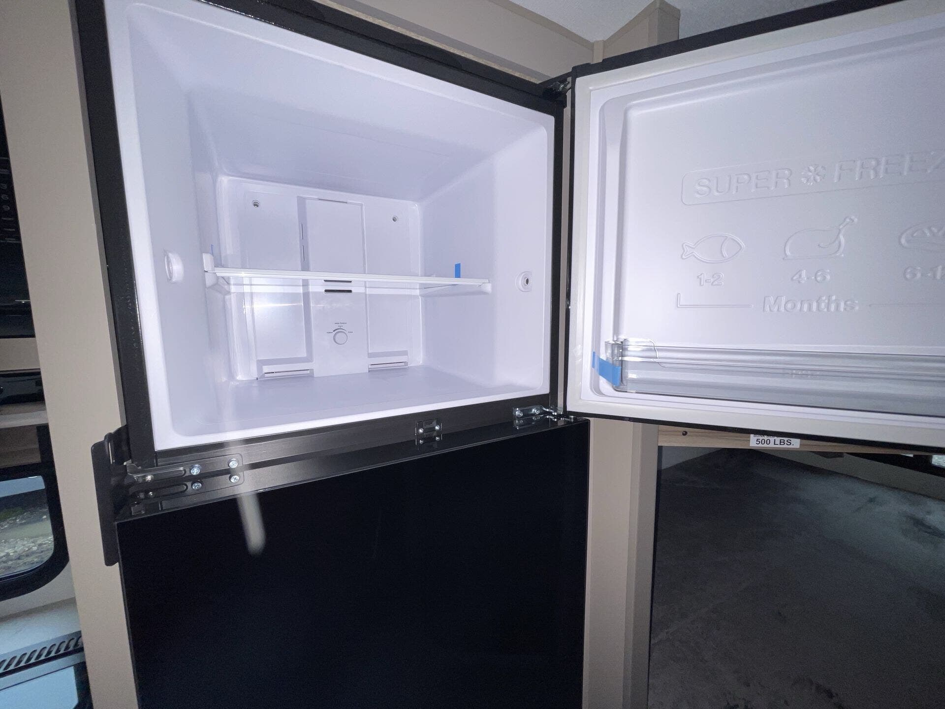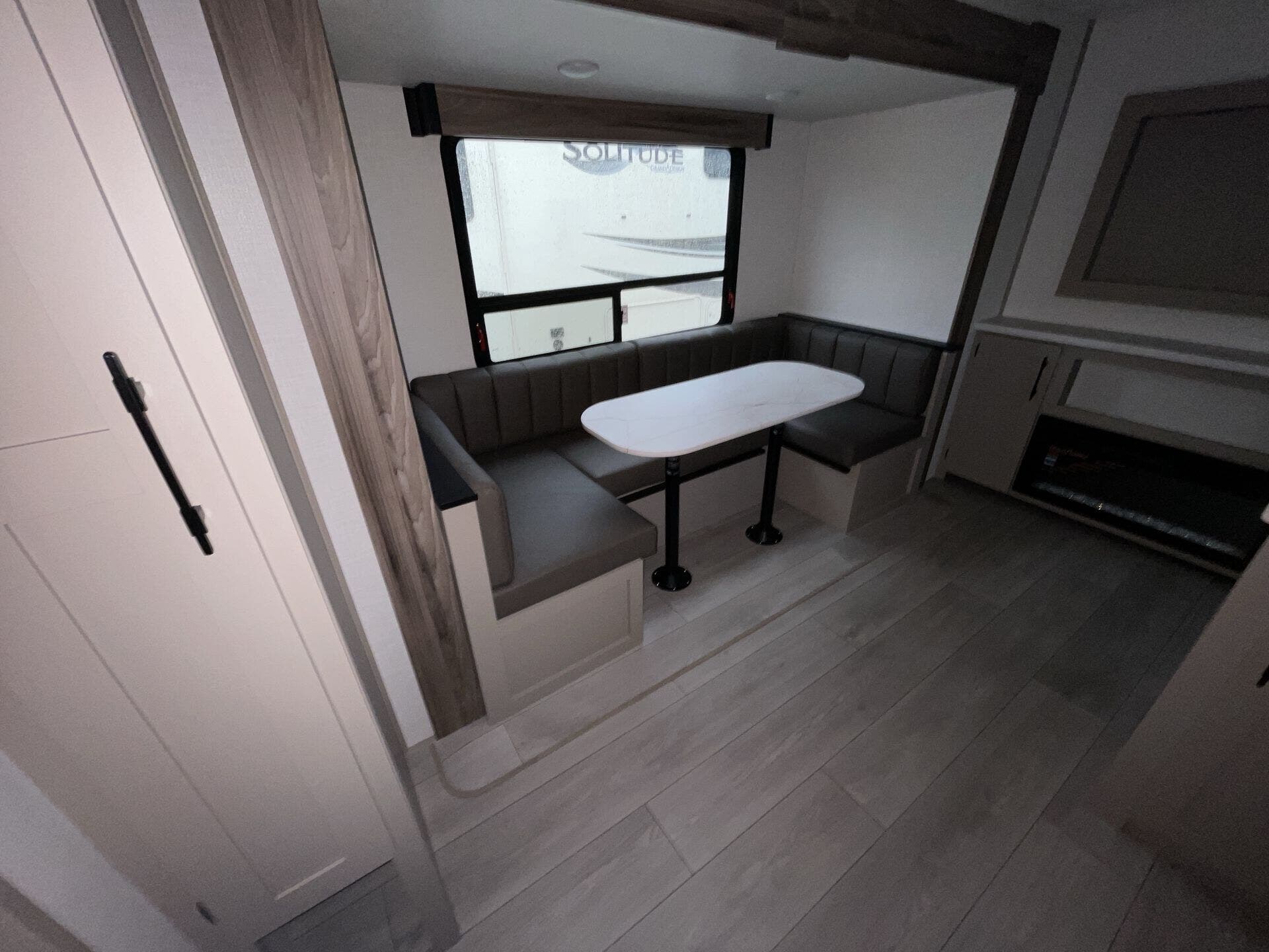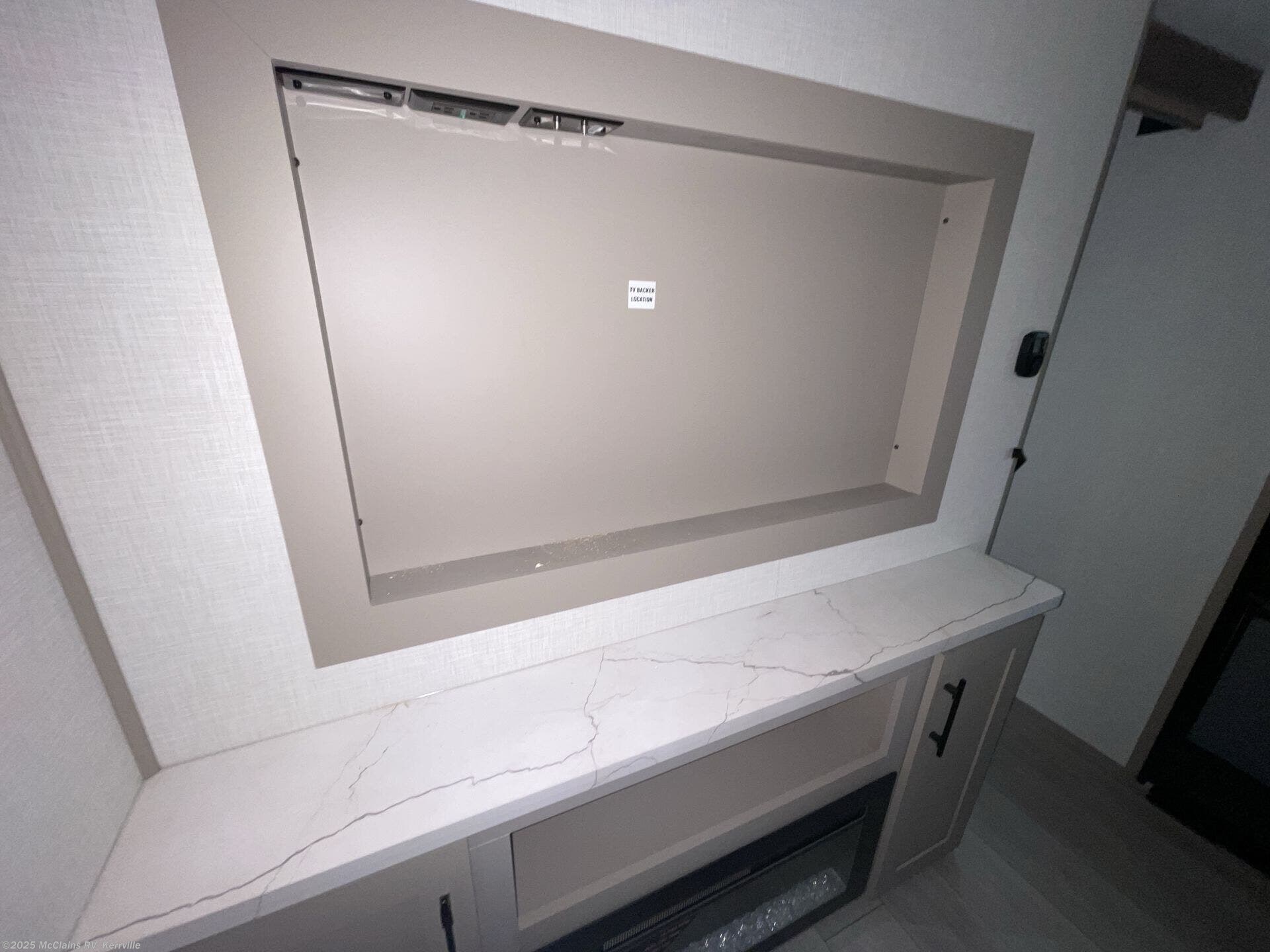 Inside, you’ll find a smart layout that maximizes space without sacrificing comfort. The double-over-double rear bunks provide plenty of room for the kids or guests, while the front private bedroom with a walk-around queen bed offers a cozy retreat for parents. The well-equipped kitchen includes stainless steel appliances, a large refrigerator, and a walk-in pantry—perfect for meal prep on the go. The U-shaped dinette gives everyone a place to gather for meals or game night, and it also converts for additional sleeping space.