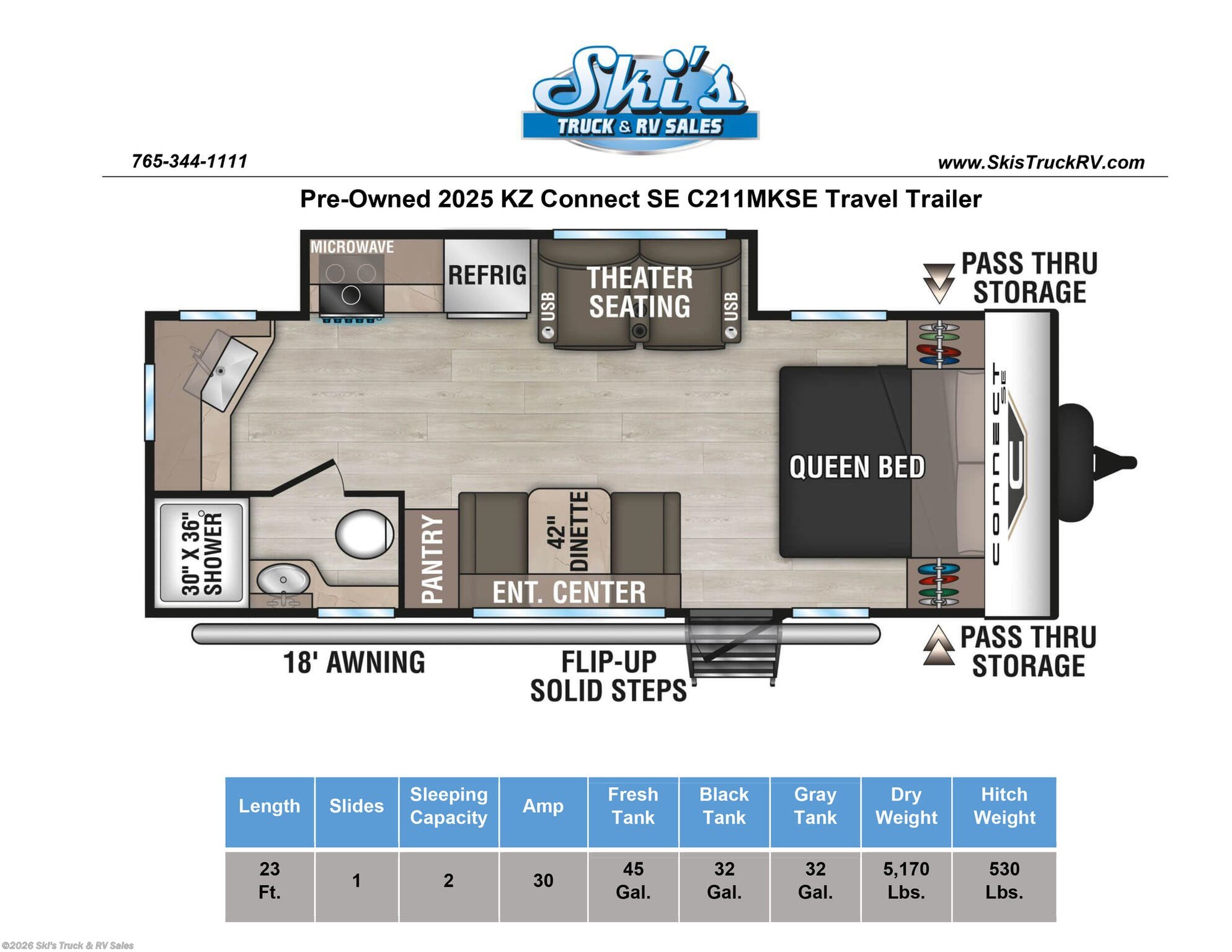 Pre-Owned 2025 KZ Connect SE C211MKSE Travel Trailer; 23 Foot; 1 Slide with Topper; Sleeps 2; Lightweight; Hitch Weight: 530 Lbs.; Dry Weight: 5170 Lbs.; 30 Amp; Power Tongue Jacks; Manual Stabilizer Jacks; 45 Gal. Fresh Water Cap.; 32 Gal. Black Water Cap.; 32 Gal. Gray Water Cap.; Two 20 Lbs. Propane Tanks; 15,000 BTU AC; 30,000 BTU Furnace; 10 C.F. (12V) Refrigerator; On Demand Water Heater; Microwave; 3-Burner Stove/Oven; One TV Jack; 32 In. TV; AM/FM; Speakers; Pantry; Stainless Steel Sink; Free Standing Dinette; Theater Seats; Queen Bed (Upgraded Mattress); One Bathroom with Shower; Porcelain Toilet; 18 Foot Power Awning; Backup Camera Prep.; Solar Prep.; Outside Shower; Exterior Storage; Foldup Steps; Grab Handle; Roof Ladder; Key Alike System; Magnetic Door Holders; Battery Disconnect; Black Tank Flush; Climate Package; Azdel Sidewalls; Screen Defender; Screenshot; Tinted Windows; Roller Shades; Goodyear Tires; Aluminum Wheels; Spare Tire; Trade In Unit: One Owner; Well Maintained; Financing Available; Good Pre-Owned Travel Trailer for the Price: $21,995. Call Skis Truck & RV Sales at 765-344-1111 or visit us at for more information.