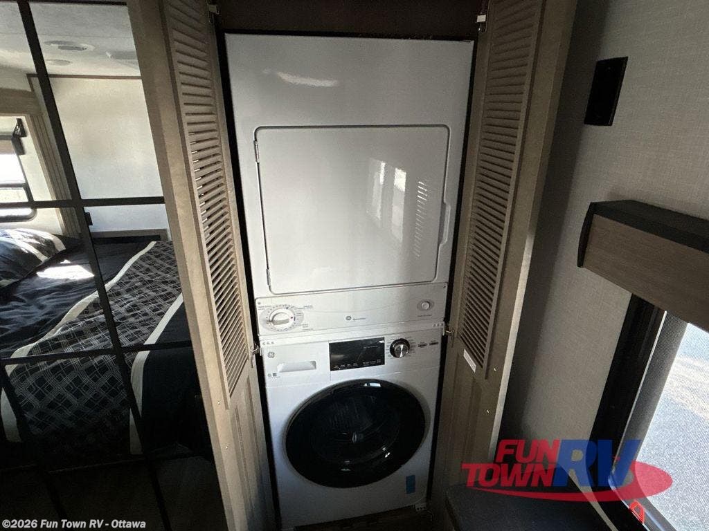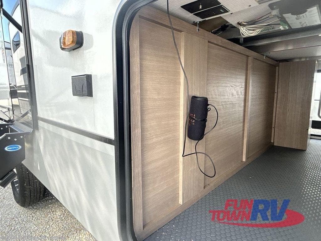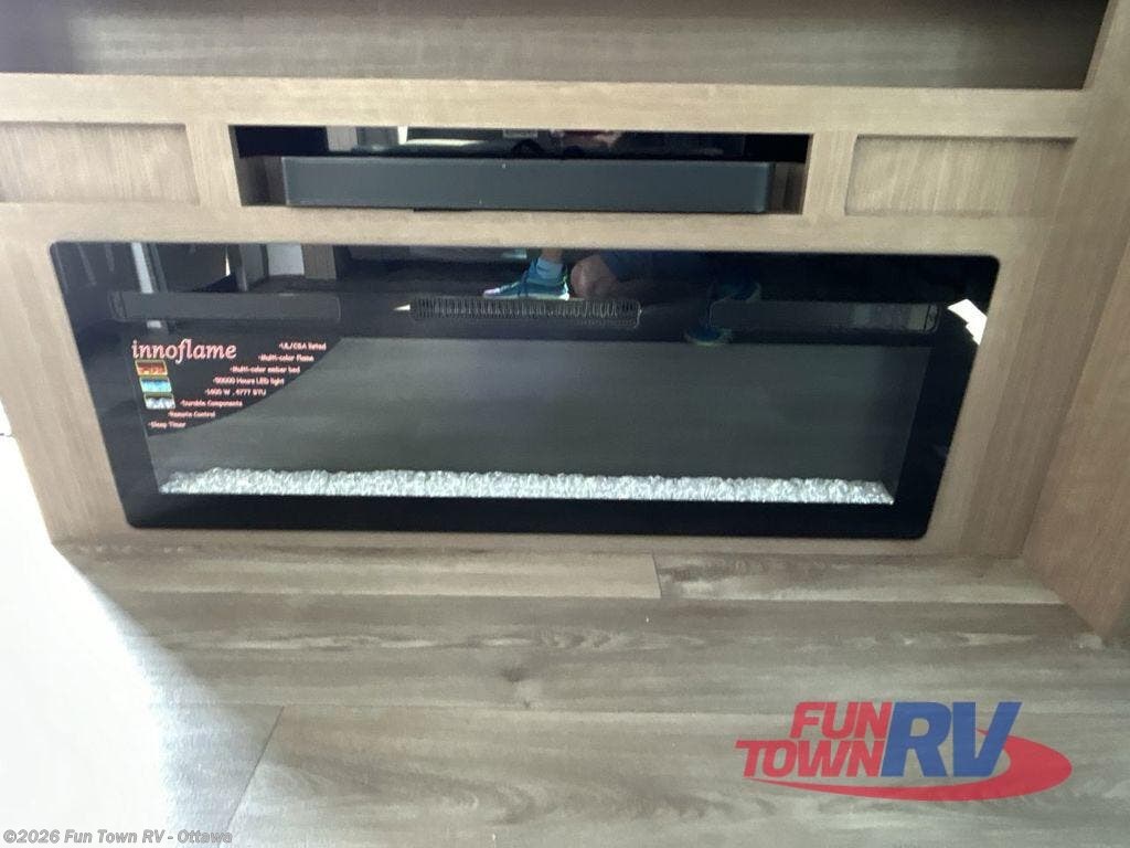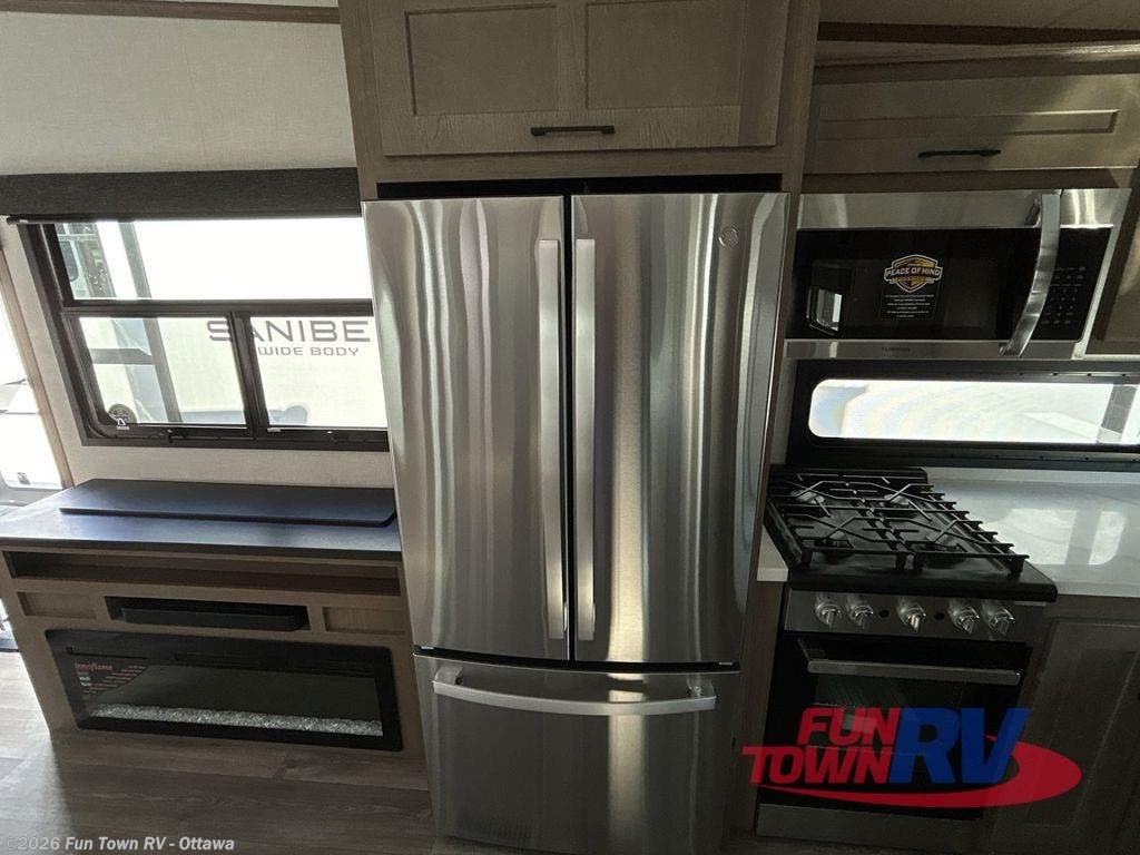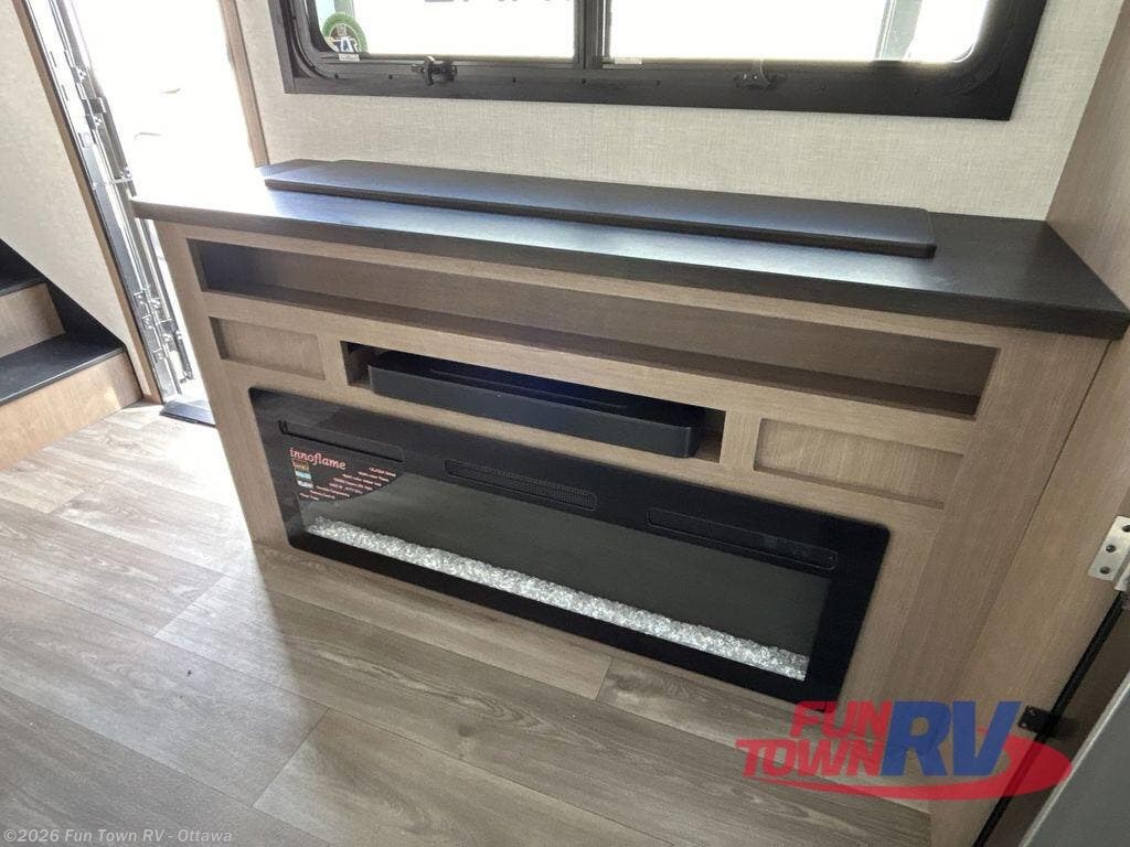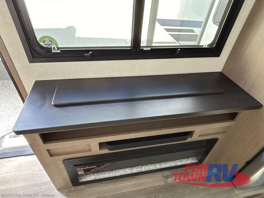 The chef will love cooking in the rear kitchen of this fifth wheel! They could even cook the catch of the day on the outside griddle while enjoying a cold beverage from the refrigerator. You can enjoy your meals in the legless table with chairs and bench at the kitchen then lay down on the hide-a-bed sofa after stuffing yourself full. There is even a 48" fireplace and a 50" LED TV on lift to enjoy movie nights! Freshen up each morning in the full bathroom with the 48" x 30" residential shower with a seat and easily grab your towel from the linen closet next to it. When you're ready to wind down your nights, head to the front private bedroom to change into your pajamas stored in the dresser or from the front wardrobe that includes washer and dryer prep. There is also a king bed slide out or you can choose the optional queen bed if you want more floor space. The hitch receiver comes with a four pin harness adds more security!