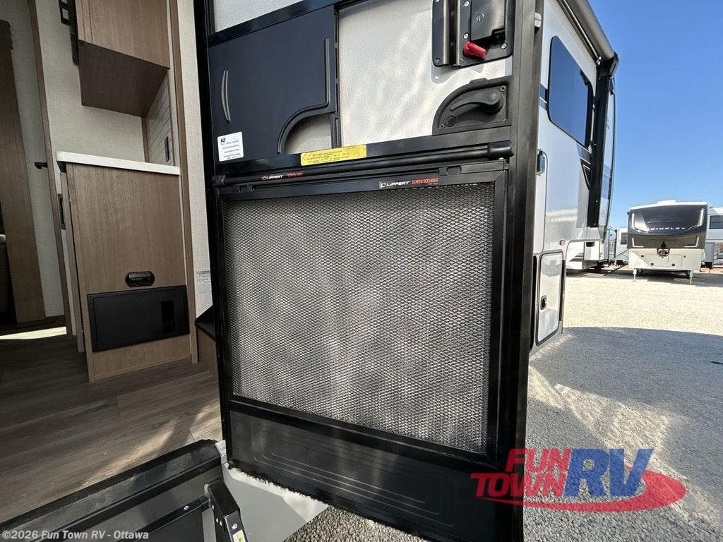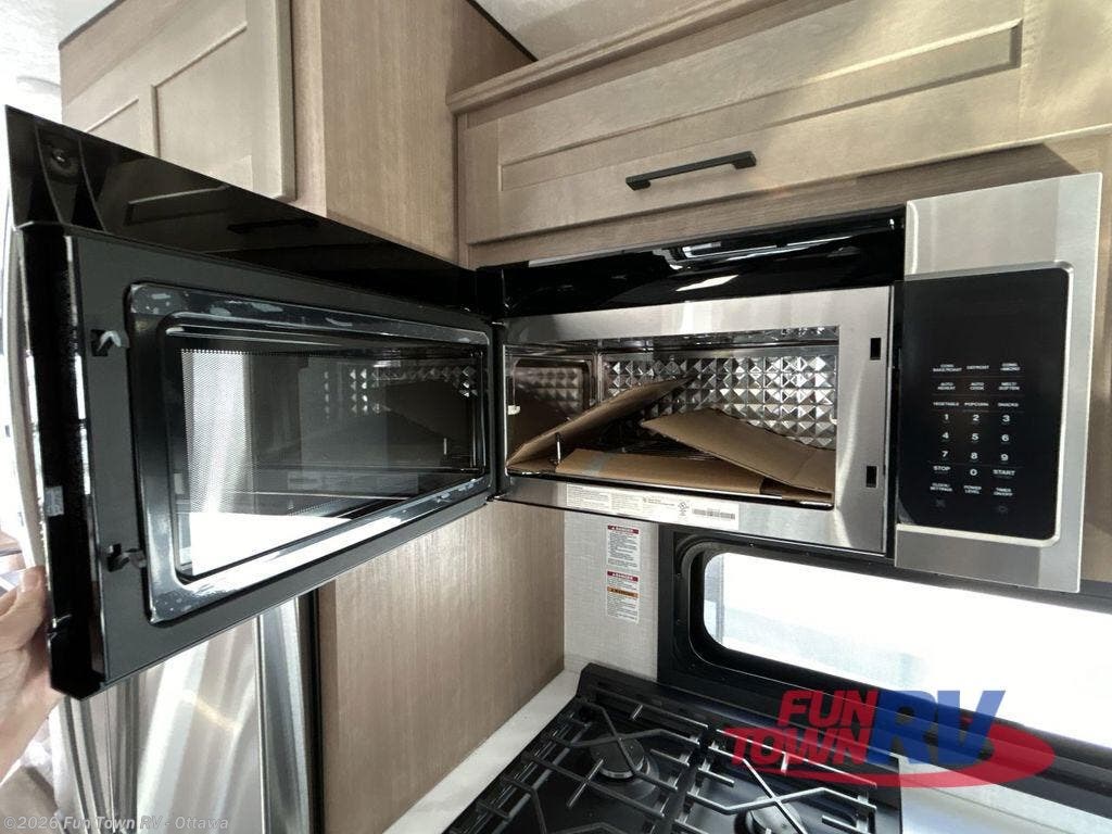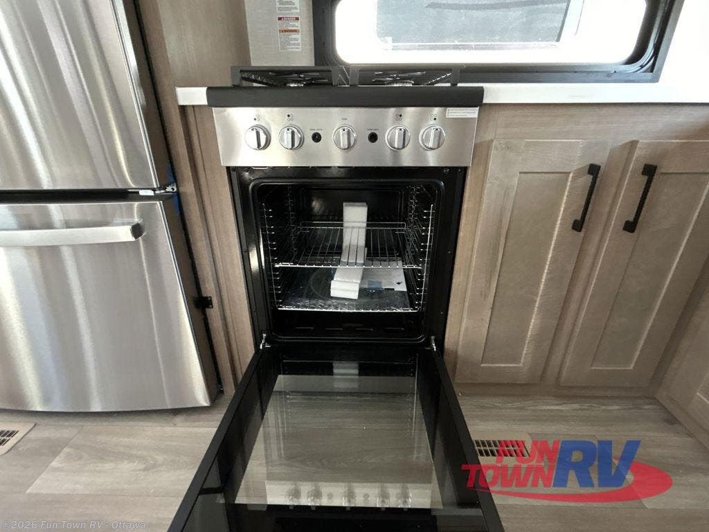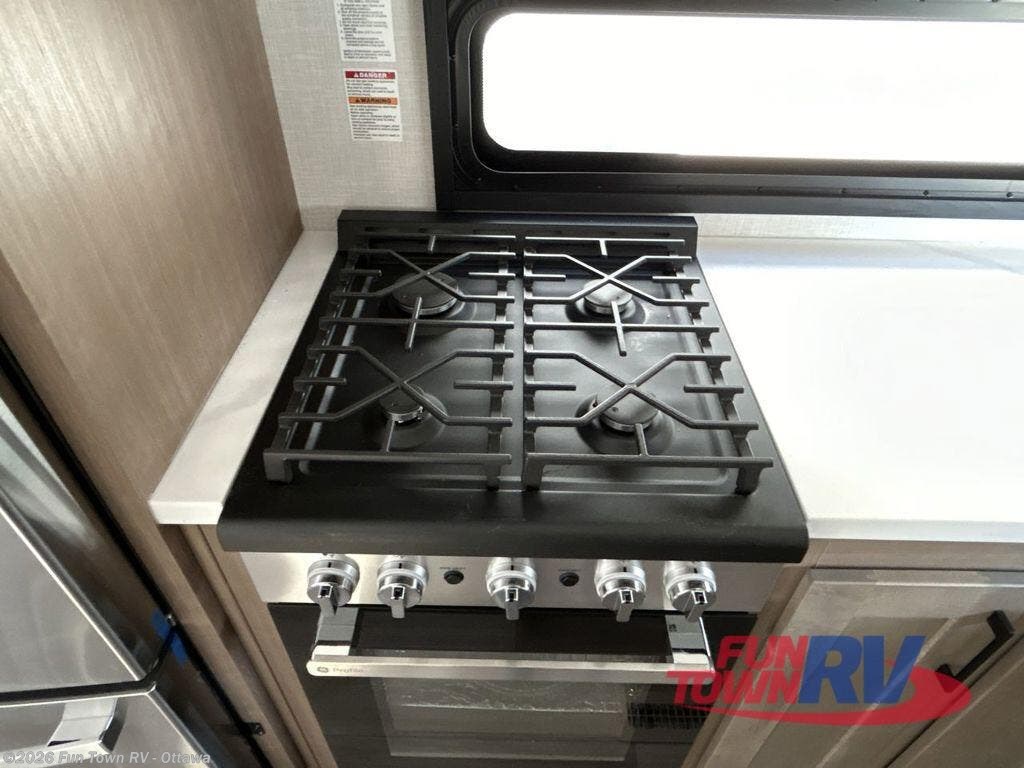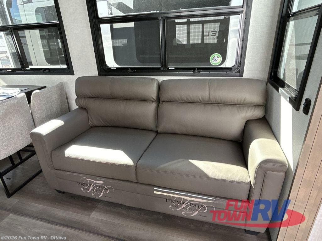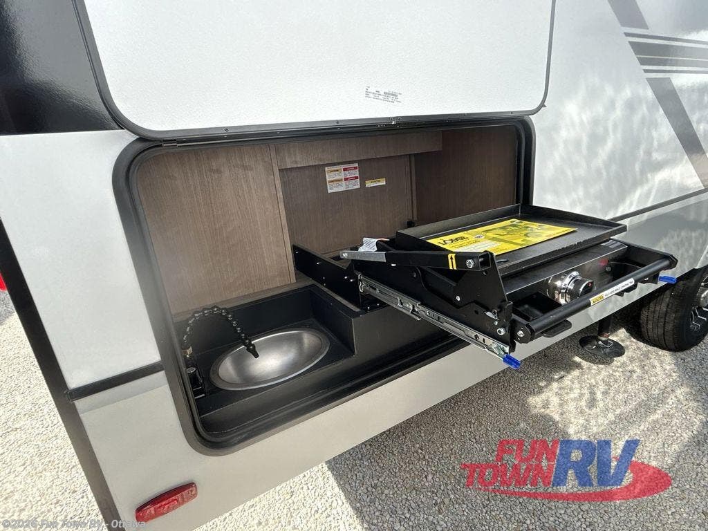 The chef will love cooking in the rear kitchen of this fifth wheel! They could even cook the catch of the day on the outside griddle while enjoying a cold beverage from the refrigerator. You can enjoy your meals in the legless table with chairs and bench at the kitchen then lay down on the hide-a-bed sofa after stuffing yourself full. There is even a 48" fireplace and a 50" LED TV on lift to enjoy movie nights! Freshen up each morning in the full bathroom with the 48" x 30" residential shower with a seat and easily grab your towel from the linen closet next to it. When you're ready to wind down your nights, head to the front private bedroom to change into your pajamas stored in the dresser or from the front wardrobe that includes washer and dryer prep. There is also a king bed slide out or you can choose the optional queen bed if you want more floor space. The hitch receiver comes with a four pin harness adds more security!