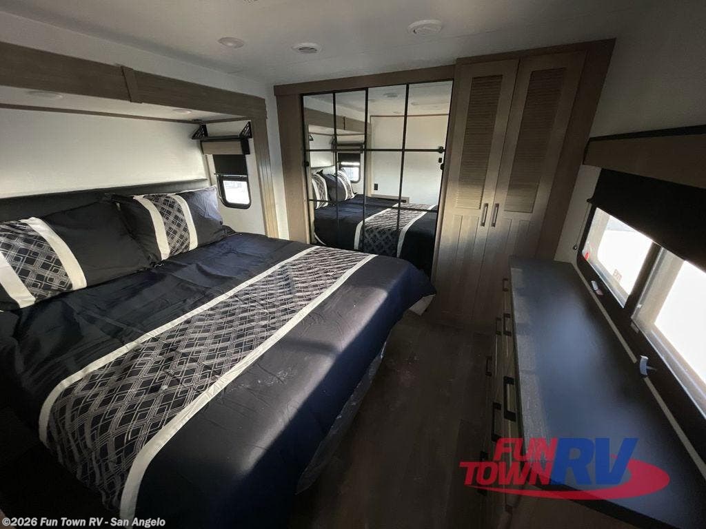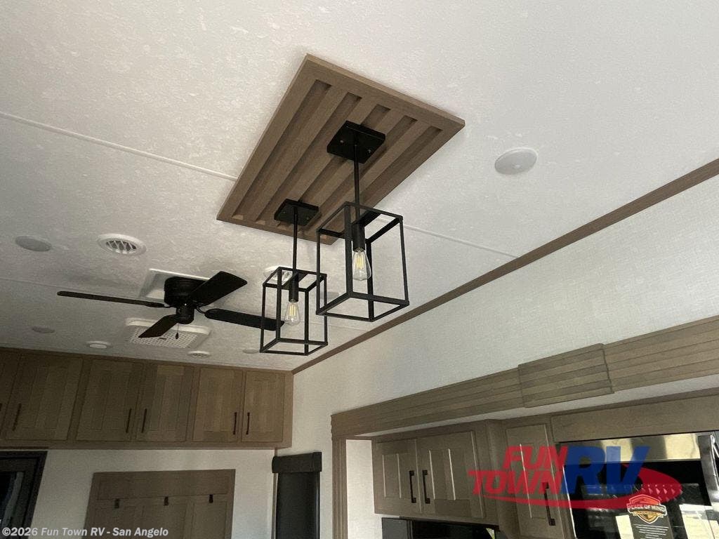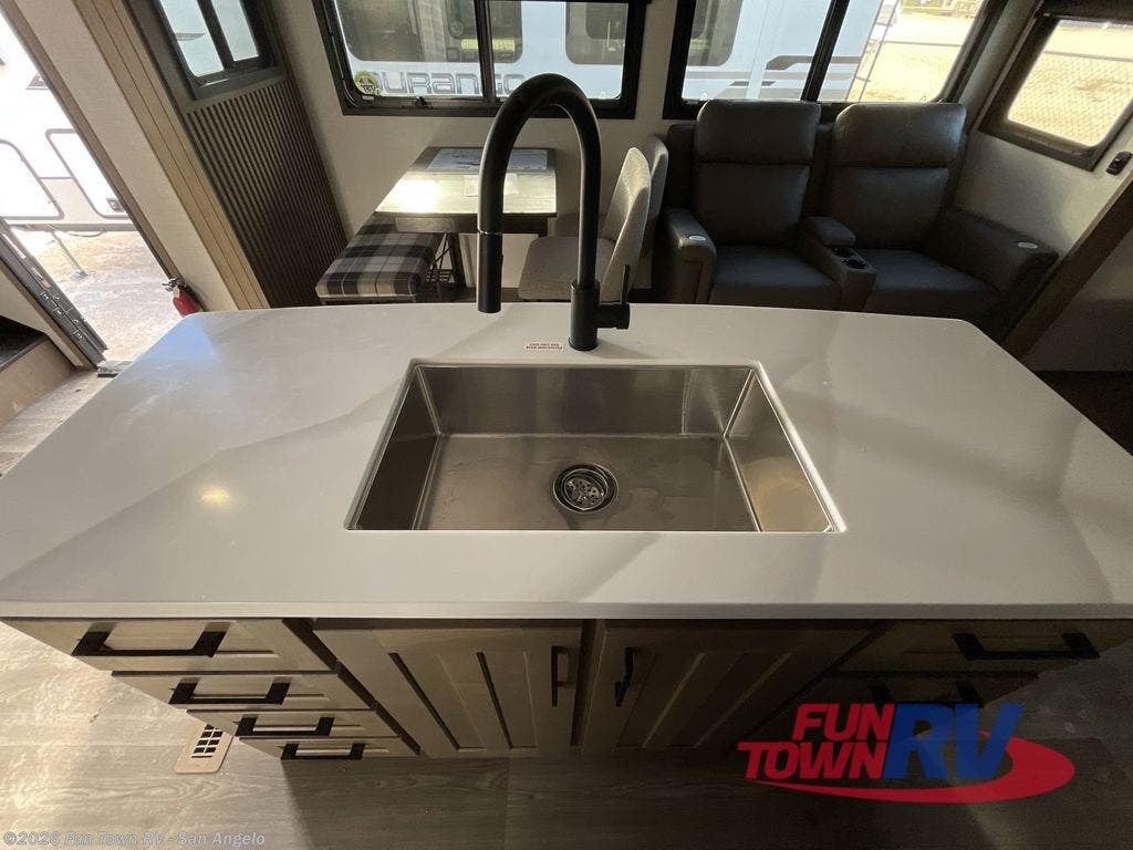 Experience the pinnacle of luxury fifth-wheel living! The front private bedroom has a king bed slide which can be switched for an optional queen instead, a dresser, and a front wardrobe with washer and dryer prep. Start feeling clean and fresh each morning after showering in the 48" x 30" residential shower with a seat in the full bathroom. The kitchen has an island that will make cooking time easy and allow you to mingle with the chef whipping up some scrambled eggs on the four-burner range. The hutch can store your dishes, the pantry can store your canned goods, and the 18 cu. ft. refrigerator will keep your perishables fresh. To experience a quiet time and relaxing time read a book on the rear hide-a-bed sofa or relax in the theater seating with USB charging. And the entertainment center with a fireplace and 50" smart LED TV will keep you entertained! Finally, this unit offers a flexible storage space ideal for keeping all organized and neat, and a patio deck, perfect for spending time outside connecting with nature.