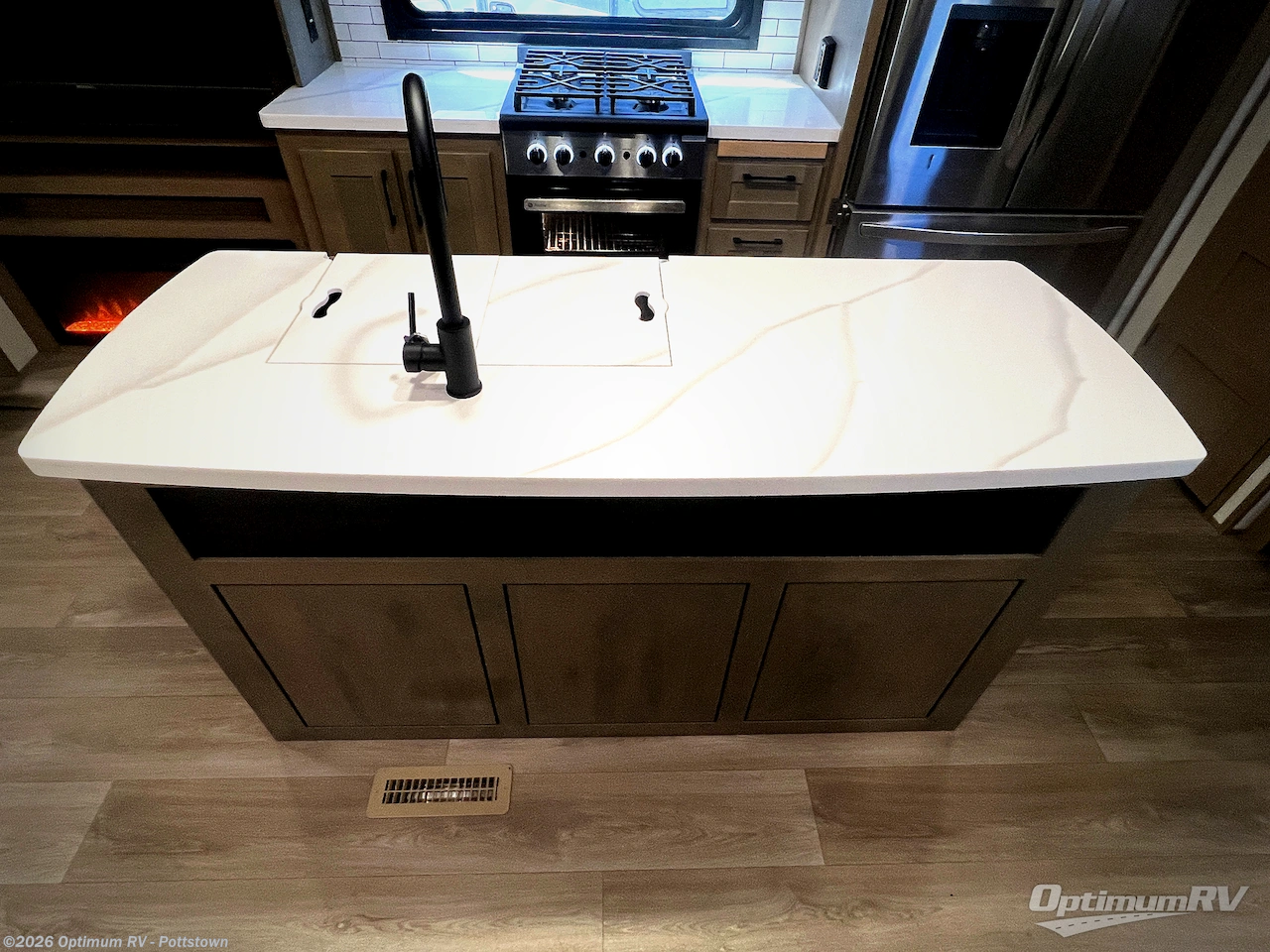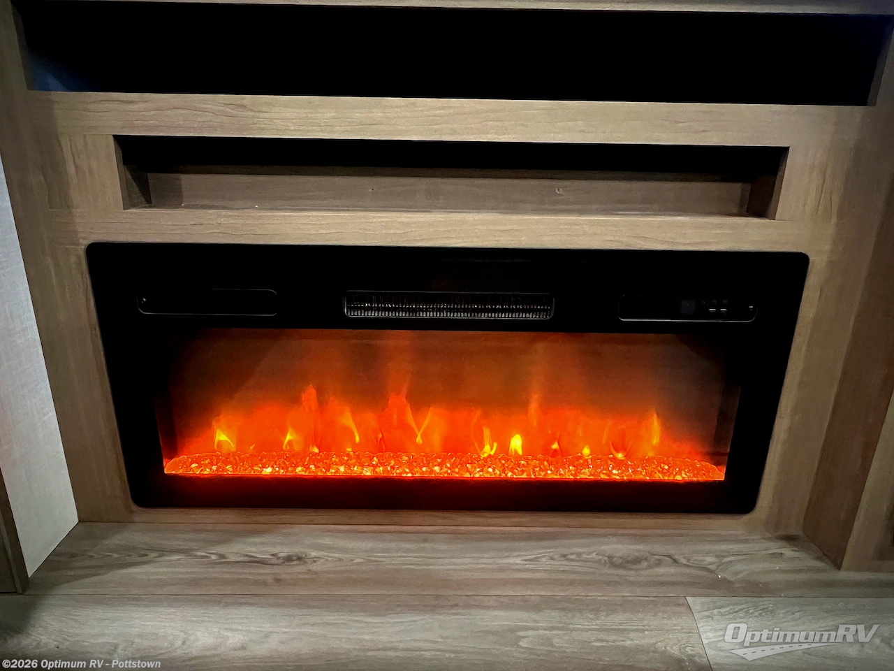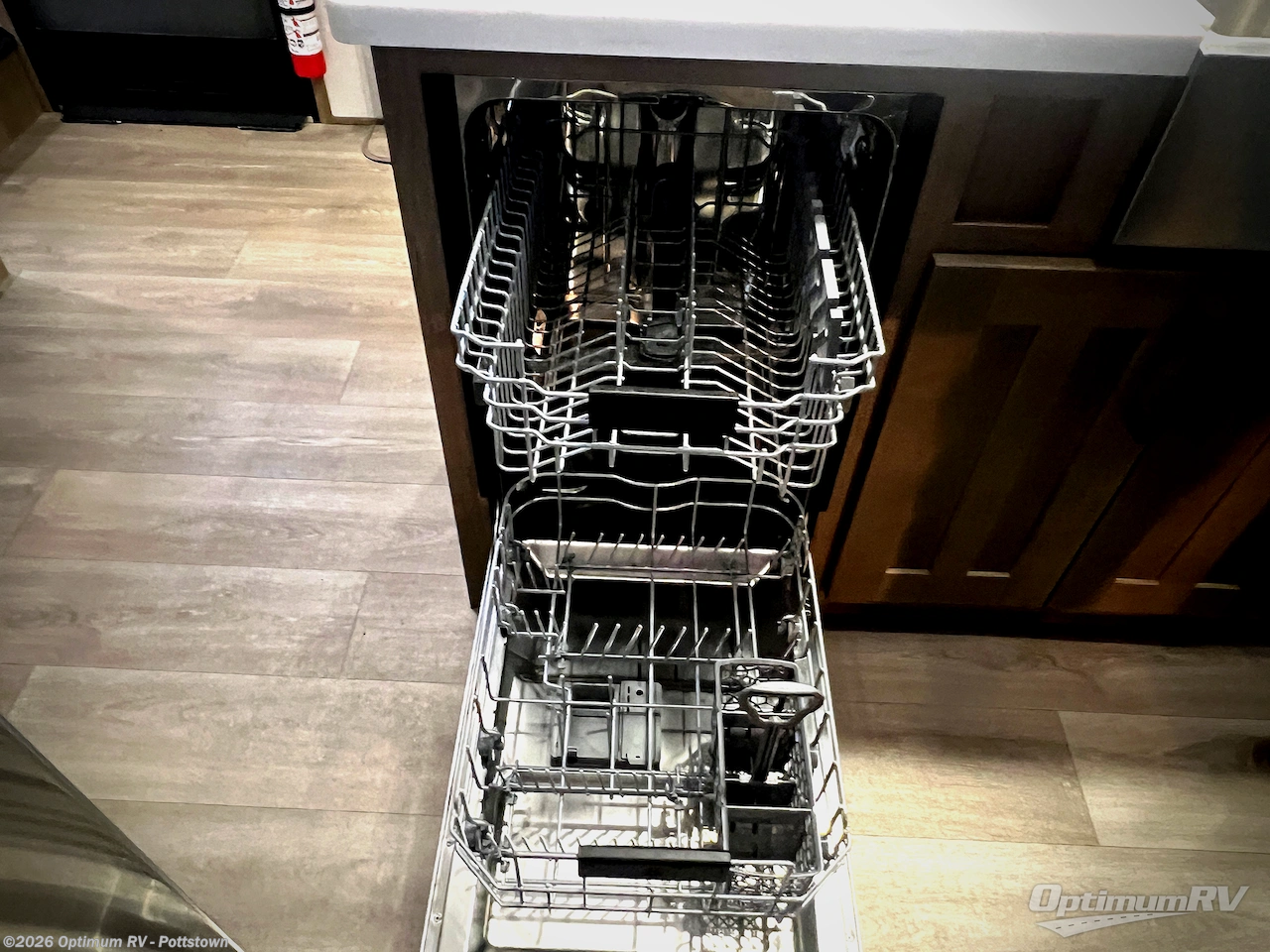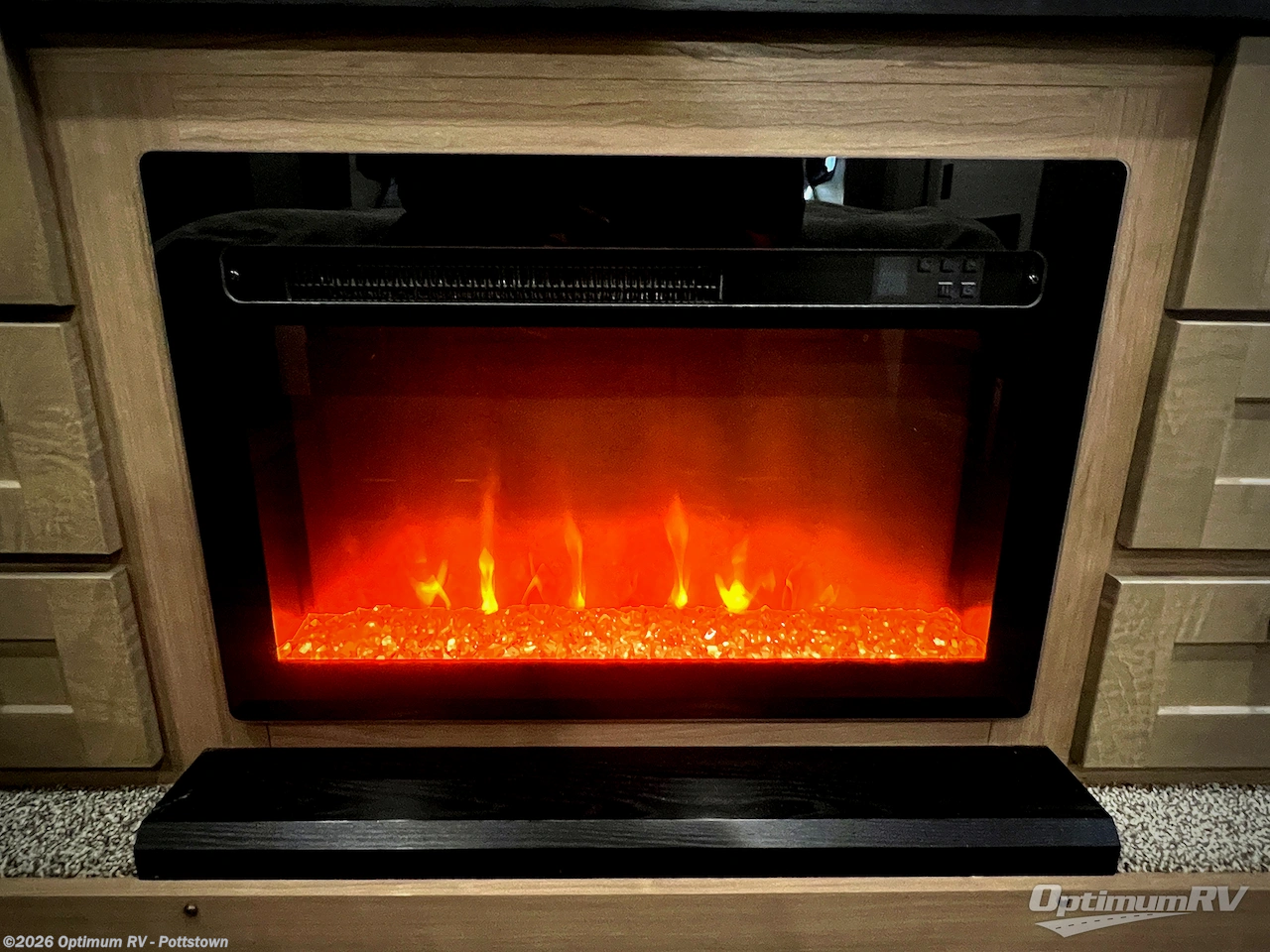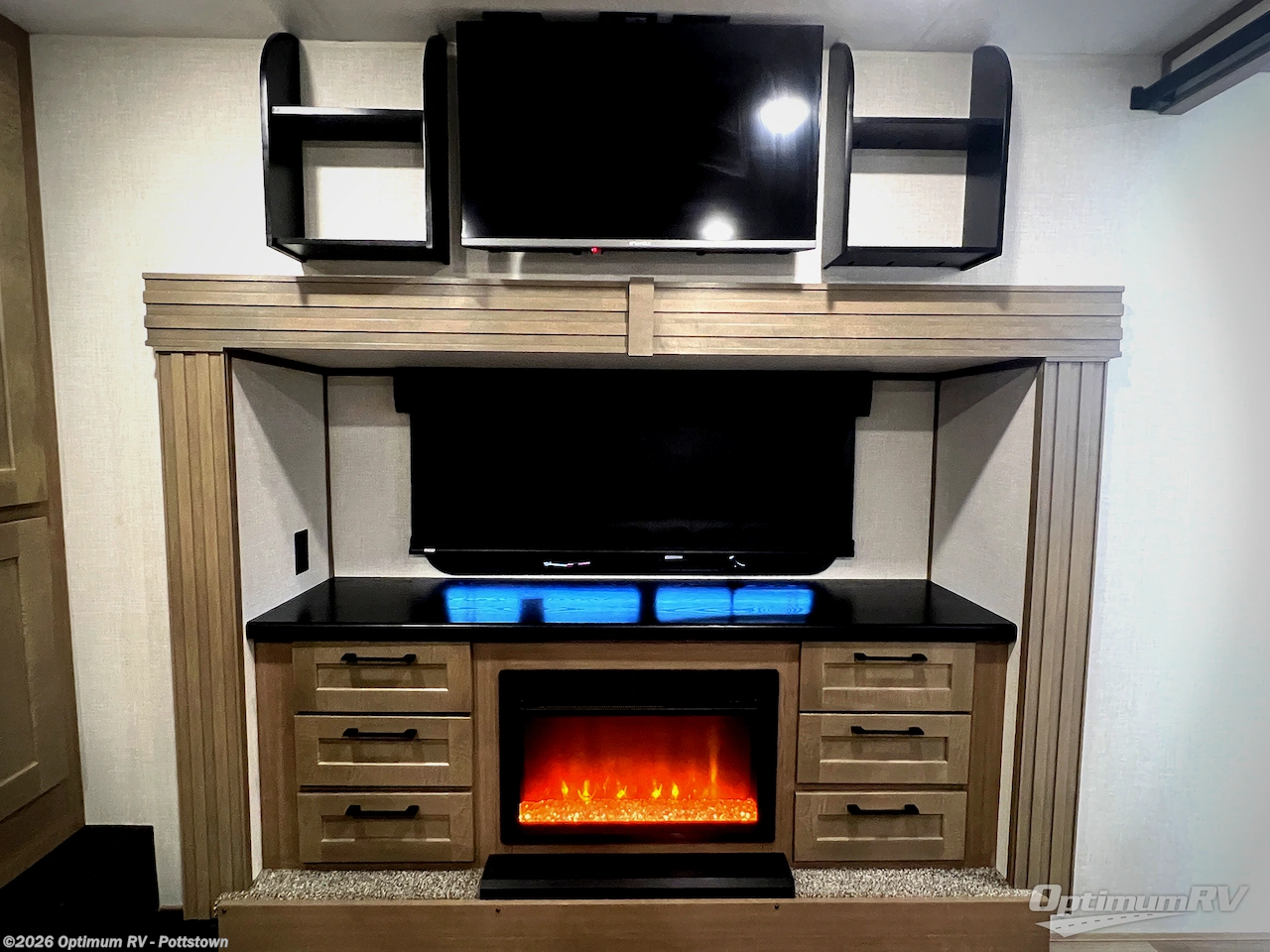 Camp wherever you want and stay as long as you desire with this full-time fifth wheel! You will love the spacious interior which includes a front bedroom with an electric tilt king bed slide with drawers underneath, a front wardrobe with washer and dryer prep, a closet with a built-in hamper, plus a slide out dresser with 32" Smart LED TV above. The full bathroom offers a residential shower with a seat plus linen storage, and the kitchen gives the cook a dream kitchen that includes a farmhouse stainless steel sink and dishwasher in the center island, a 26 cu. ft. house refrigerator with a 2,000W inverter, and more. The 50" Smart LED TV with a fireplace below can be seen from the sliding table / desk and chairs, the comfortable theater seats and the hide-a-bed sofa. Yet you might like to add the 10' 6" awning option, and there are more options to customize your Durango Gold.
