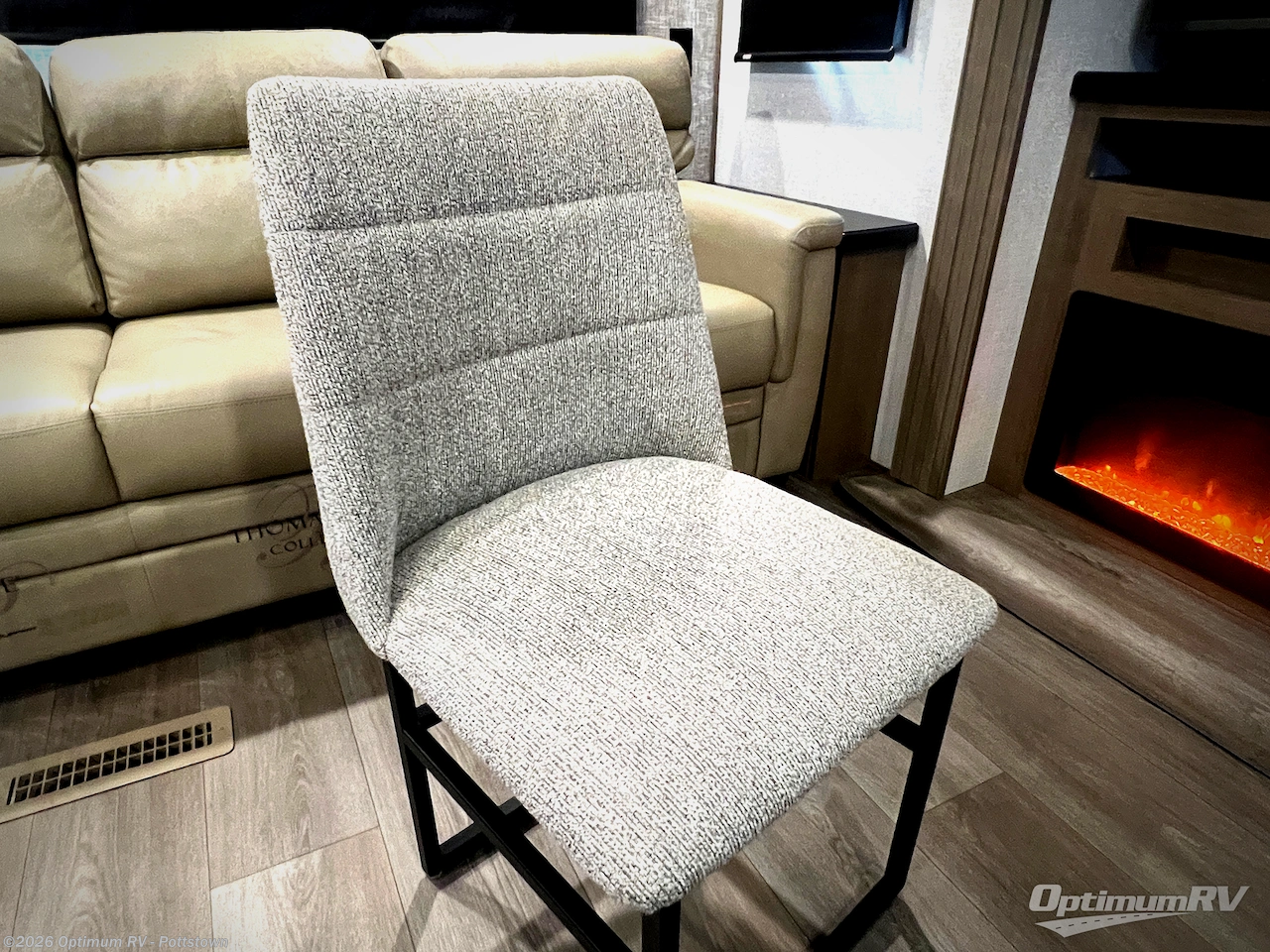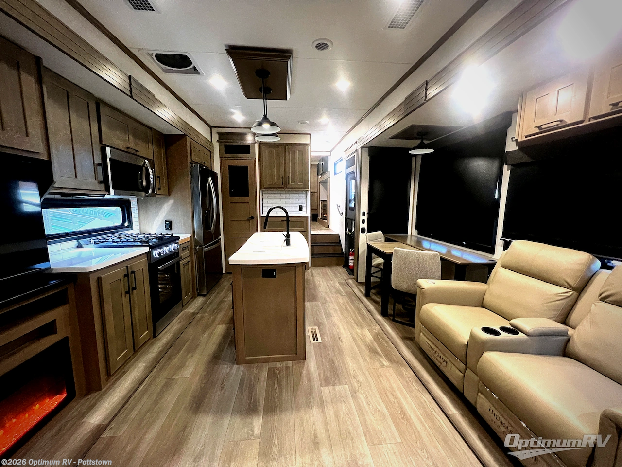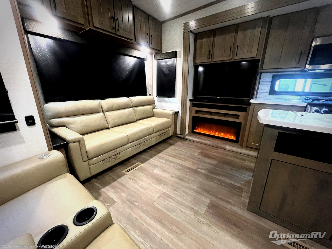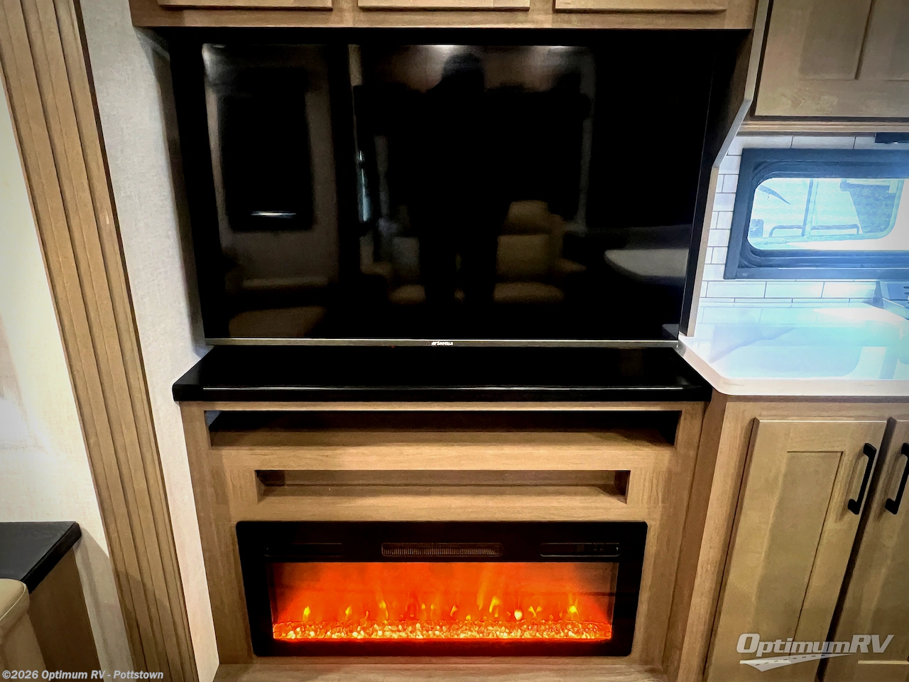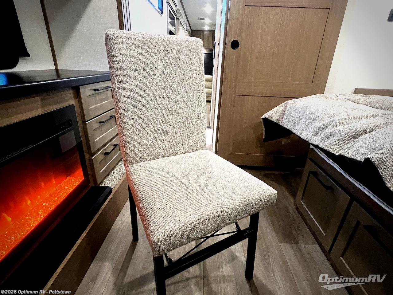 Camp wherever you want and stay as long as you desire with this full-time fifth wheel! You will love the spacious interior which includes a front bedroom with an electric tilt king bed slide with drawers underneath, a front wardrobe with washer and dryer prep, a closet with a built-in hamper, plus a slide out dresser with 32" Smart LED TV above. The full bathroom offers a residential shower with a seat plus linen storage, and the kitchen gives the cook a dream kitchen that includes a farmhouse stainless steel sink and dishwasher in the center island, a 26 cu. ft. house refrigerator with a 2,000W inverter, and more. The 50" Smart LED TV with a fireplace below can be seen from the sliding table / desk and chairs, the comfortable theater seats and the hide-a-bed sofa. Yet you might like to add the 10' 6" awning option, and there are more options to customize your Durango Gold.