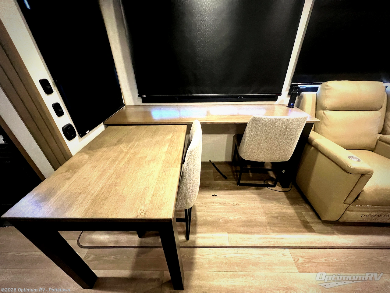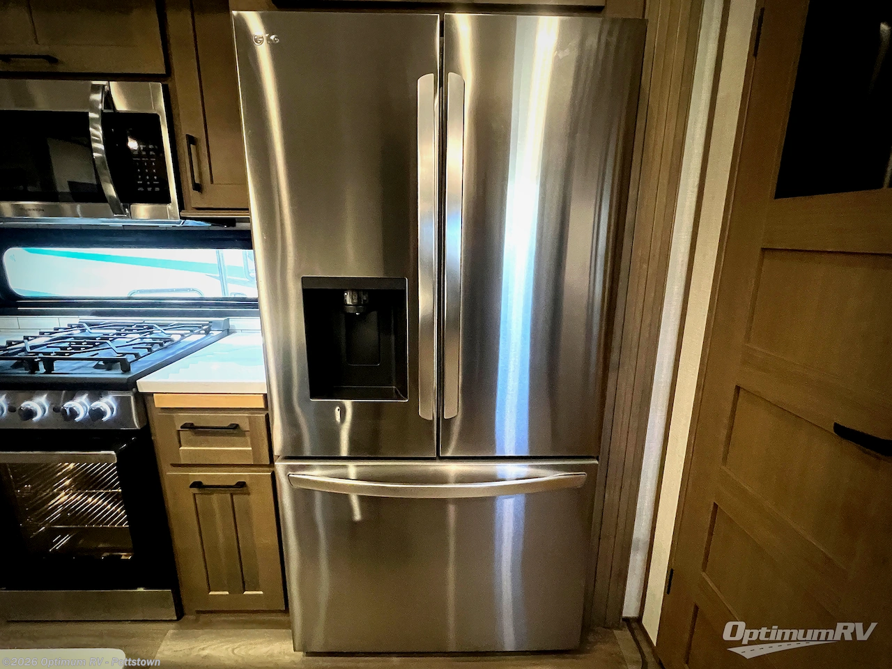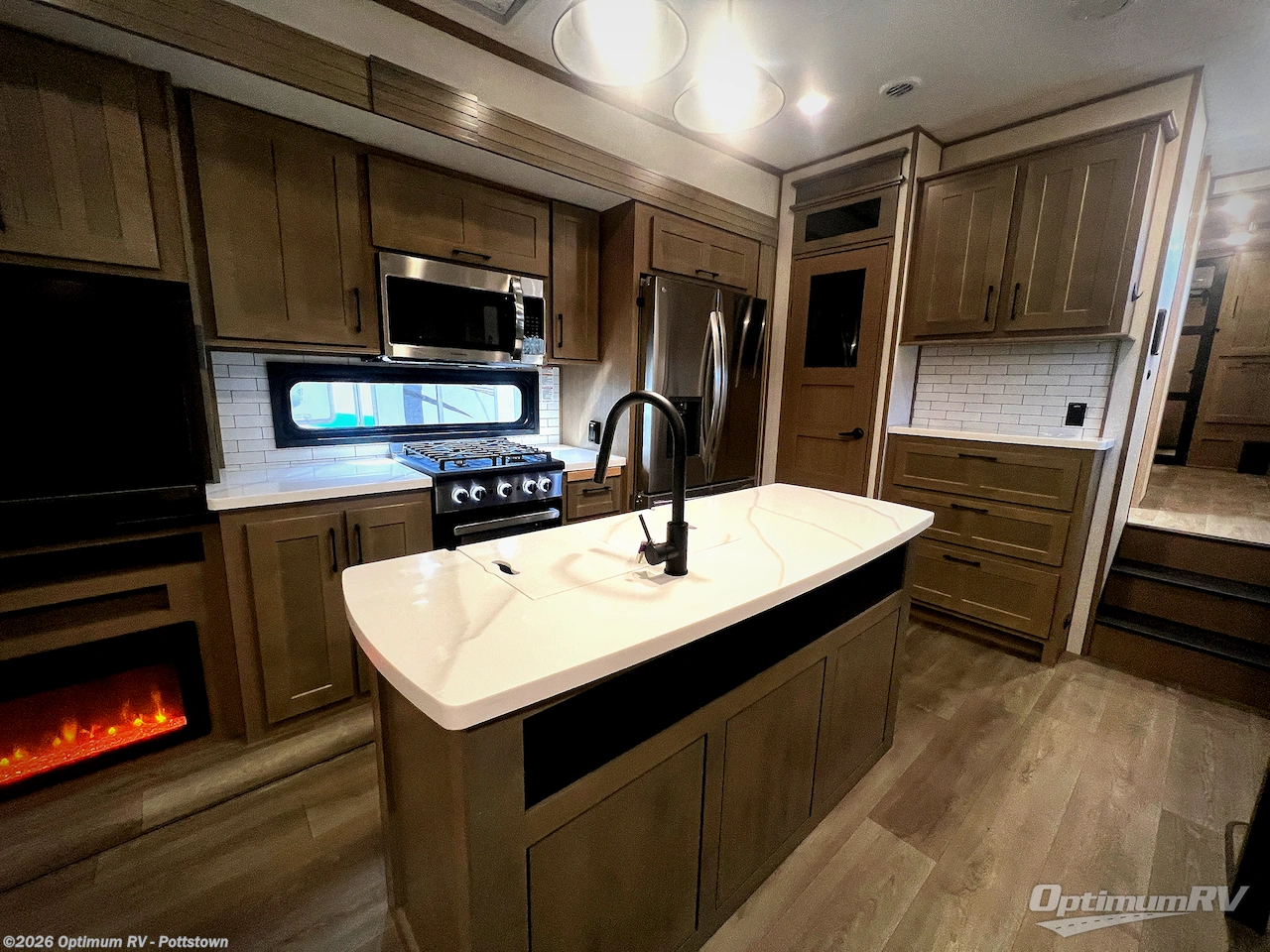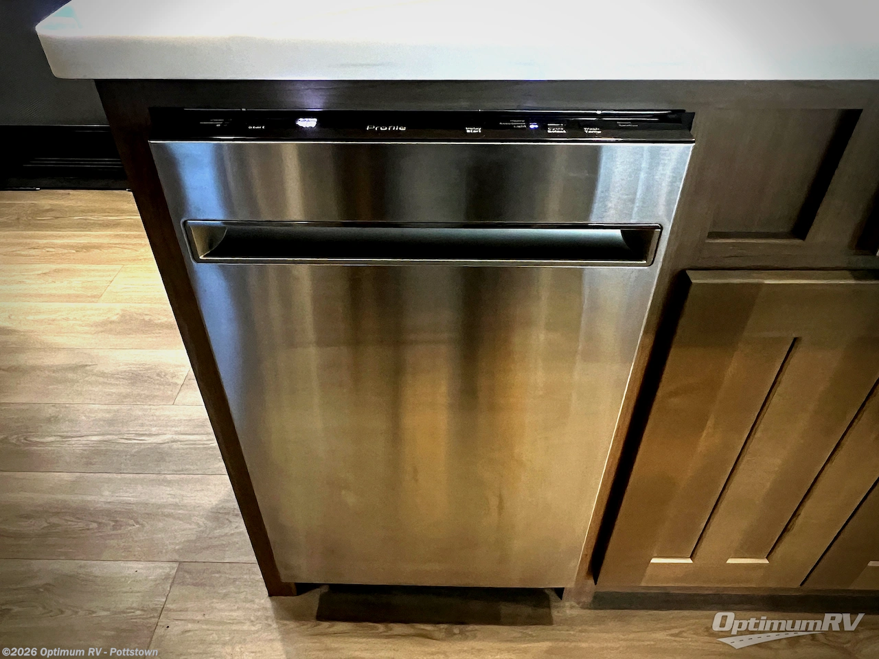 Camp wherever you want and stay as long as you desire with this full-time fifth wheel! You will love the spacious interior which includes a front bedroom with an electric tilt king bed slide with drawers underneath, a front wardrobe with washer and dryer prep, a closet with a built-in hamper, plus a slide out dresser with 32" Smart LED TV above. The full bathroom offers a residential shower with a seat plus linen storage, and the kitchen gives the cook a dream kitchen that includes a farmhouse stainless steel sink and dishwasher in the center island, a 26 cu. ft. house refrigerator with a 2,000W inverter, and more. The 50" Smart LED TV with a fireplace below can be seen from the sliding table / desk and chairs, the comfortable theater seats and the hide-a-bed sofa. Yet you might like to add the 10' 6" awning option, and there are more options to customize your Durango Gold.