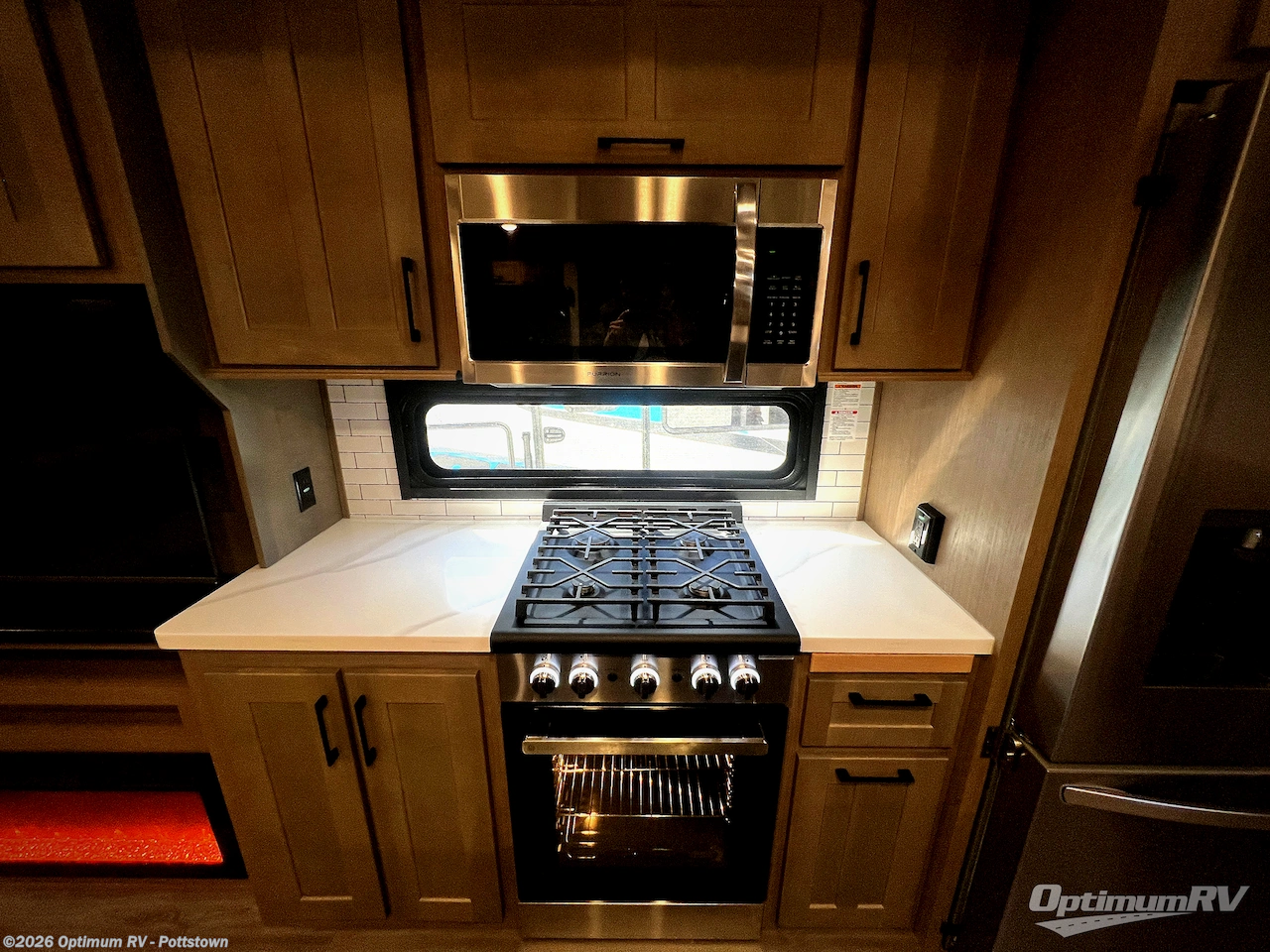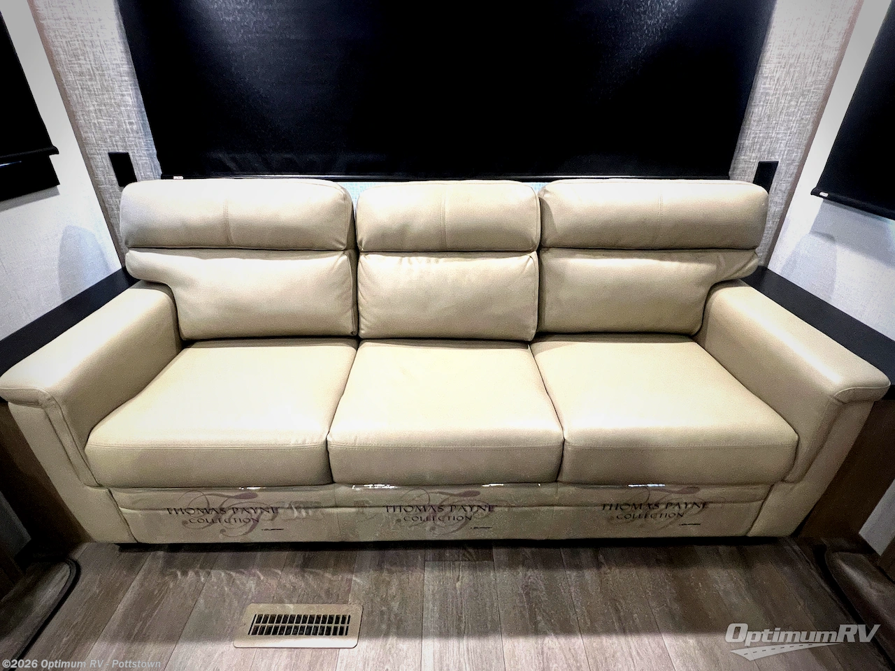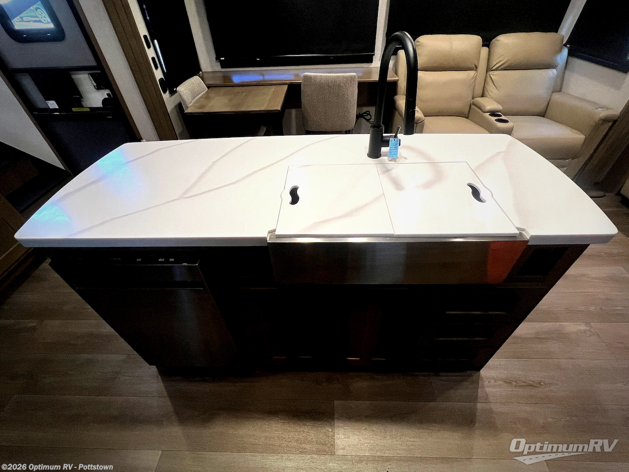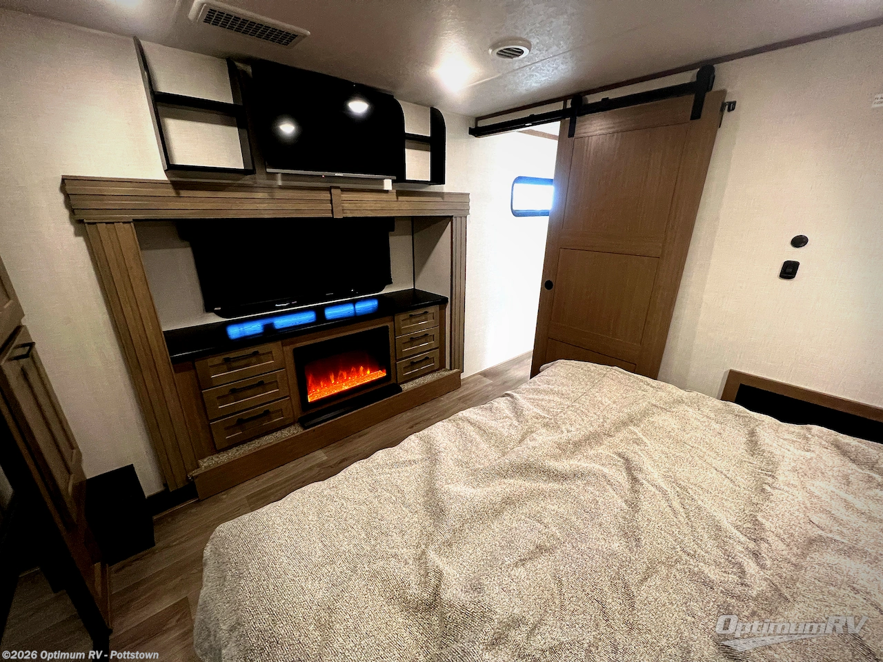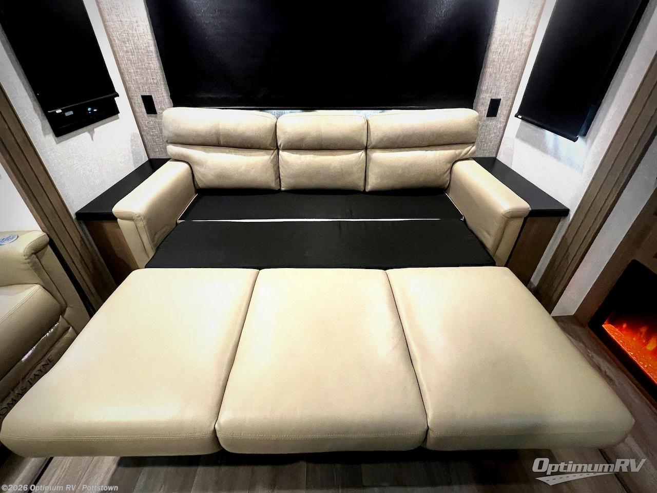 Camp wherever you want and stay as long as you desire with this full-time fifth wheel! You will love the spacious interior which includes a front bedroom with an electric tilt king bed slide with drawers underneath, a front wardrobe with washer and dryer prep, a closet with a built-in hamper, plus a slide out dresser with 32" Smart LED TV above. The full bathroom offers a residential shower with a seat plus linen storage, and the kitchen gives the cook a dream kitchen that includes a farmhouse stainless steel sink and dishwasher in the center island, a 26 cu. ft. house refrigerator with a 2,000W inverter, and more. The 50" Smart LED TV with a fireplace below can be seen from the sliding table / desk and chairs, the comfortable theater seats and the hide-a-bed sofa. Yet you might like to add the 10' 6" awning option, and there are more options to customize your Durango Gold.
