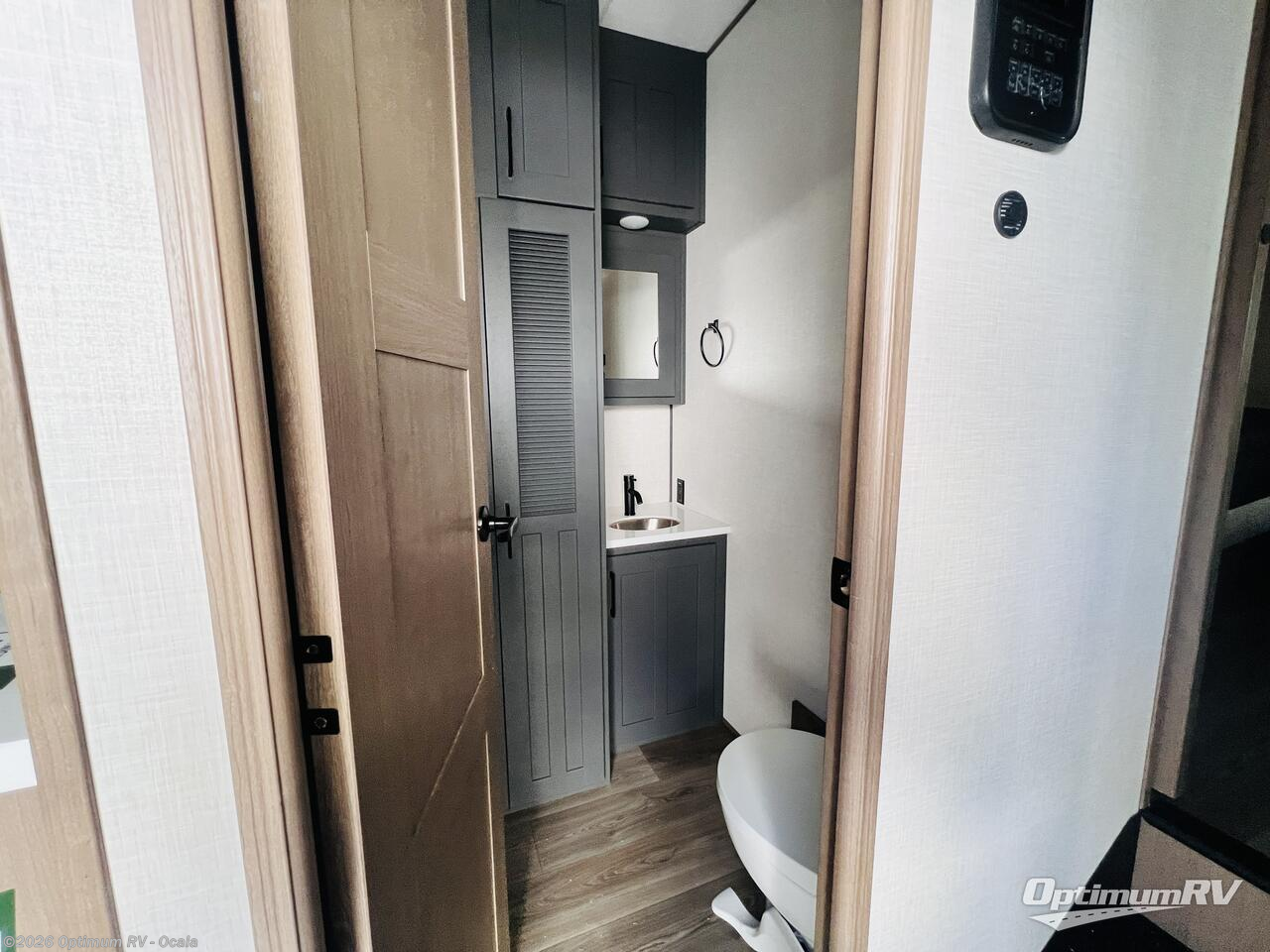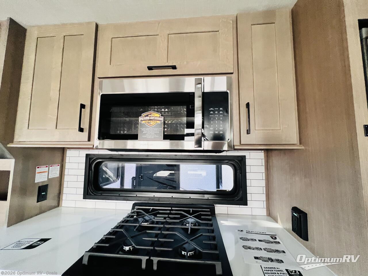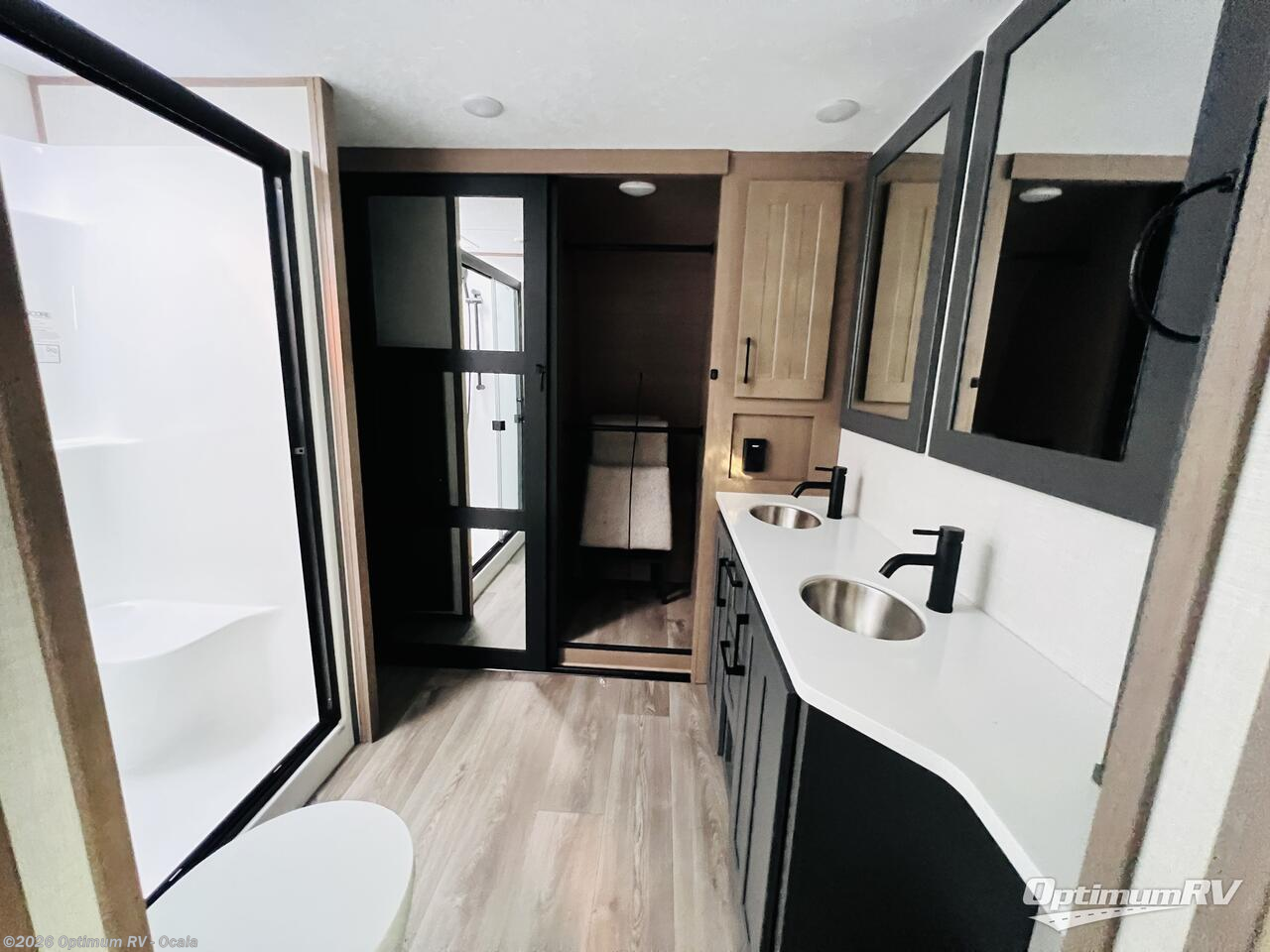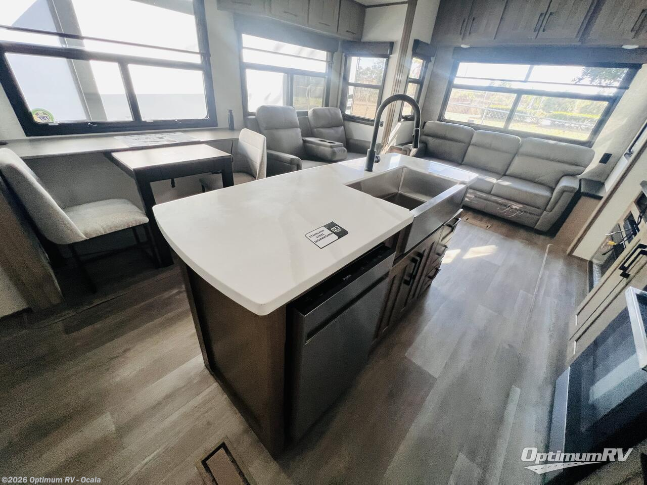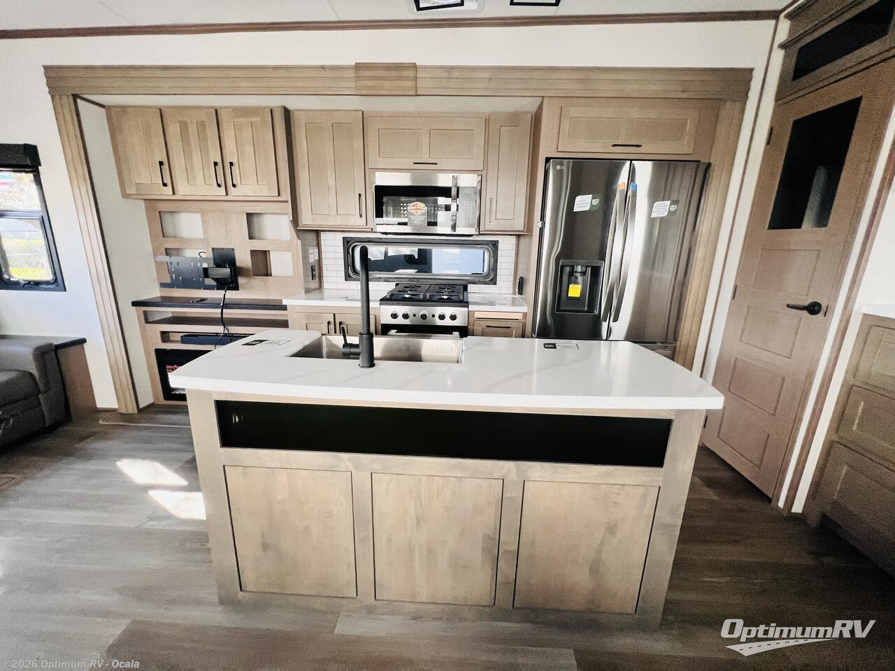 With a bath and a half, everyone will stay clean in this fifth wheel! The front full bathroom has a dual sink vanity for two to get ready at once, a 48" x 30" shower with a seat, and a front closet with washer and dryer prep if you want to add those appliances. You can enter into the master suite from the bathroom and relax on the electric tilt king bed slide, store your things in the underbed drawers, and watch a movie in bed with the Smart LED TV. The half bathroom is directly off of the kitchen for easy access while you are preparing dinner at the four burner cooktop with a 24" oven and kitchen island which also has a dishwasher for easy clean ups. Eat your meals at the legless table with chairs and then let your stomach settle while relaxing on the rear hide-a-bed sofa or theater seating across from the entertainment center with 40" fireplace!