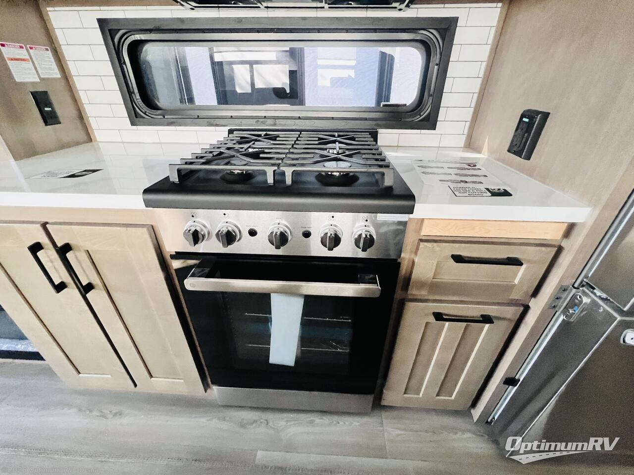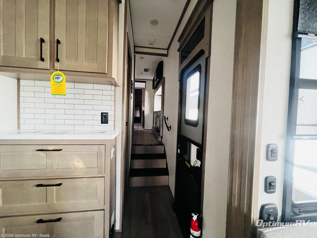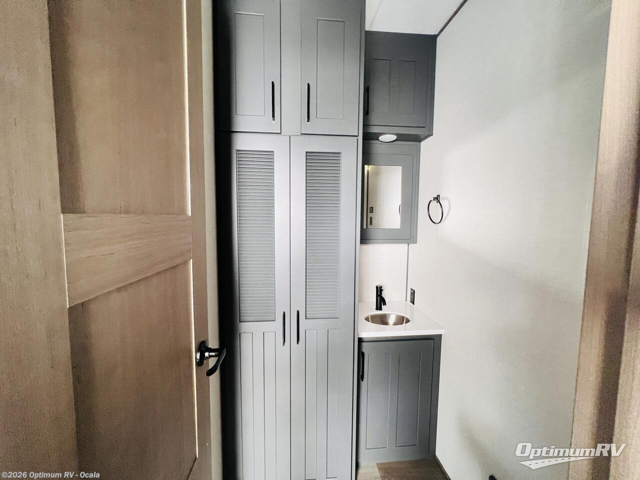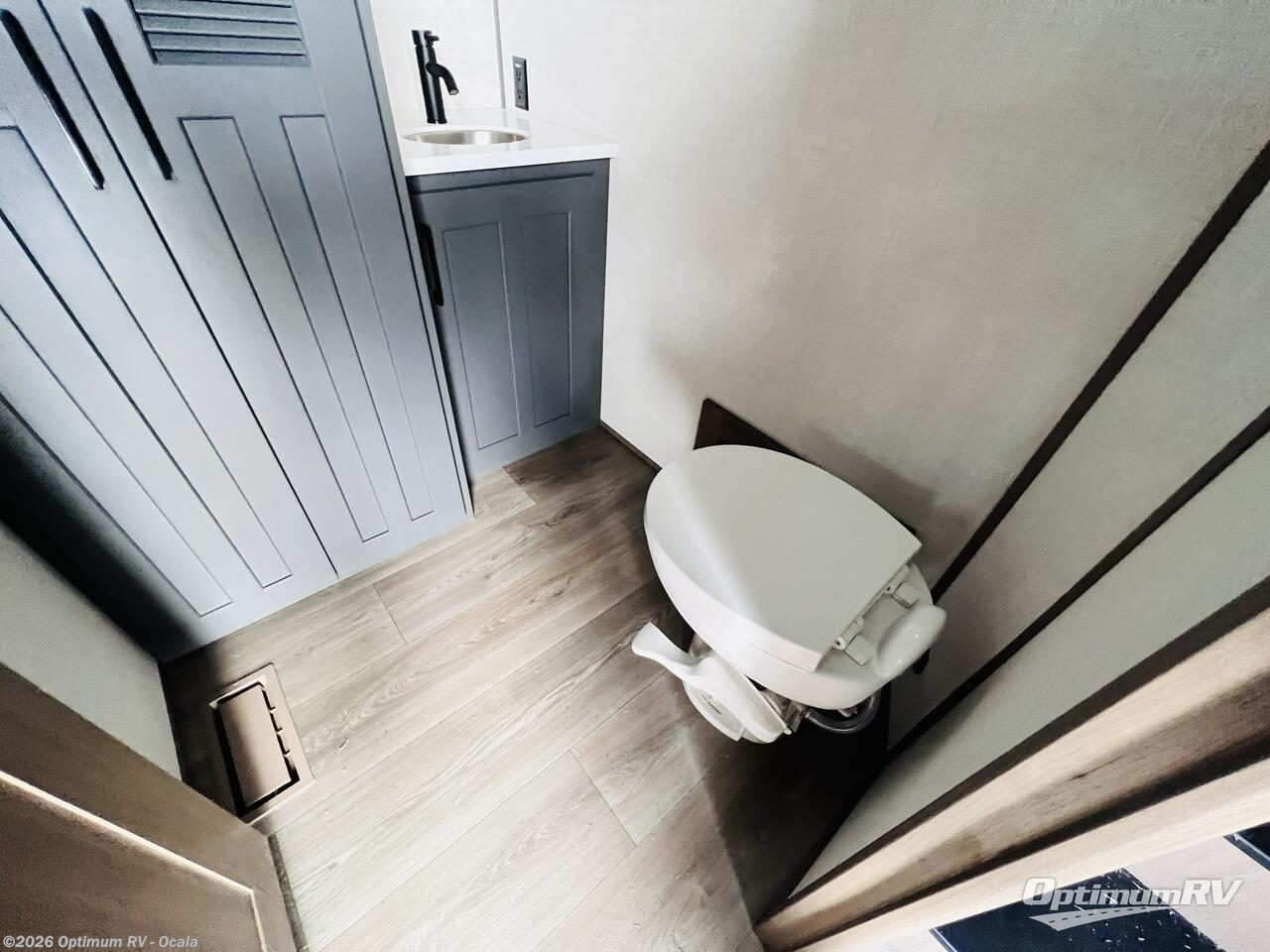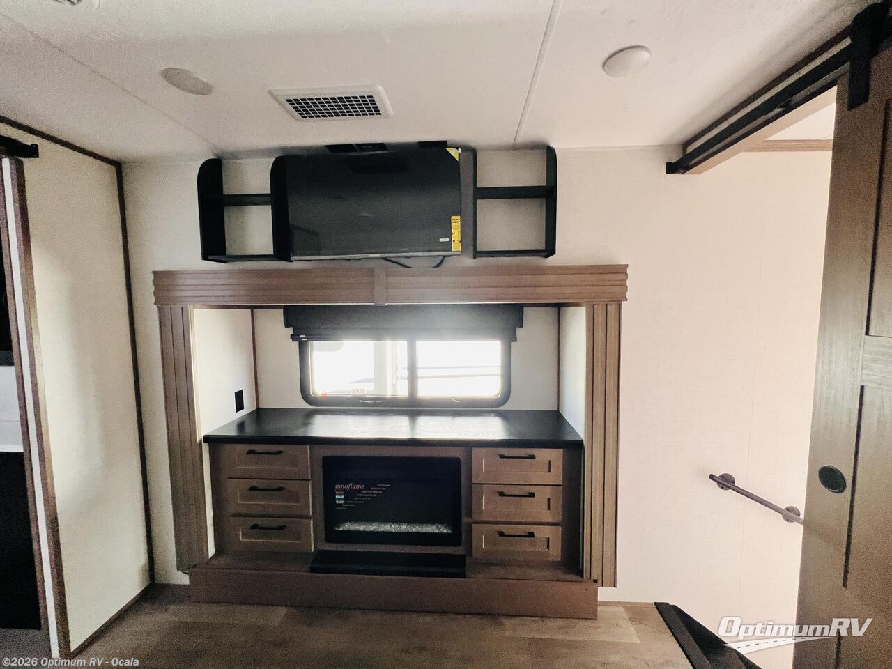 With a bath and a half, everyone will stay clean in this fifth wheel! The front full bathroom has a dual sink vanity for two to get ready at once, a 48" x 30" shower with a seat, and a front closet with washer and dryer prep if you want to add those appliances. You can enter into the master suite from the bathroom and relax on the electric tilt king bed slide, store your things in the underbed drawers, and watch a movie in bed with the Smart LED TV. The half bathroom is directly off of the kitchen for easy access while you are preparing dinner at the four burner cooktop with a 24" oven and kitchen island which also has a dishwasher for easy clean ups. Eat your meals at the legless table with chairs and then let your stomach settle while relaxing on the rear hide-a-bed sofa or theater seating across from the entertainment center with 40" fireplace!