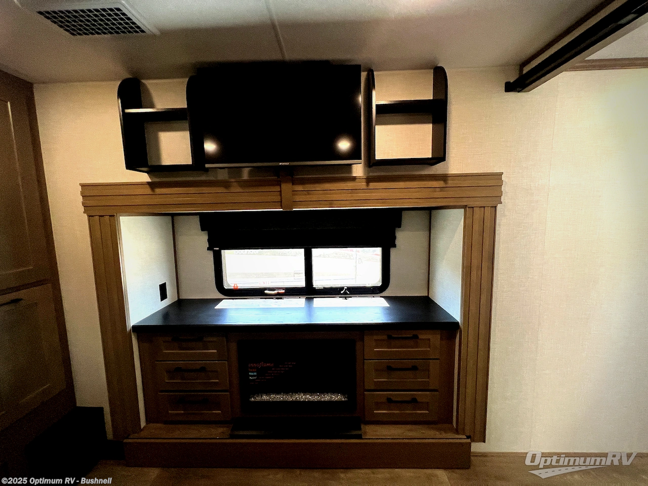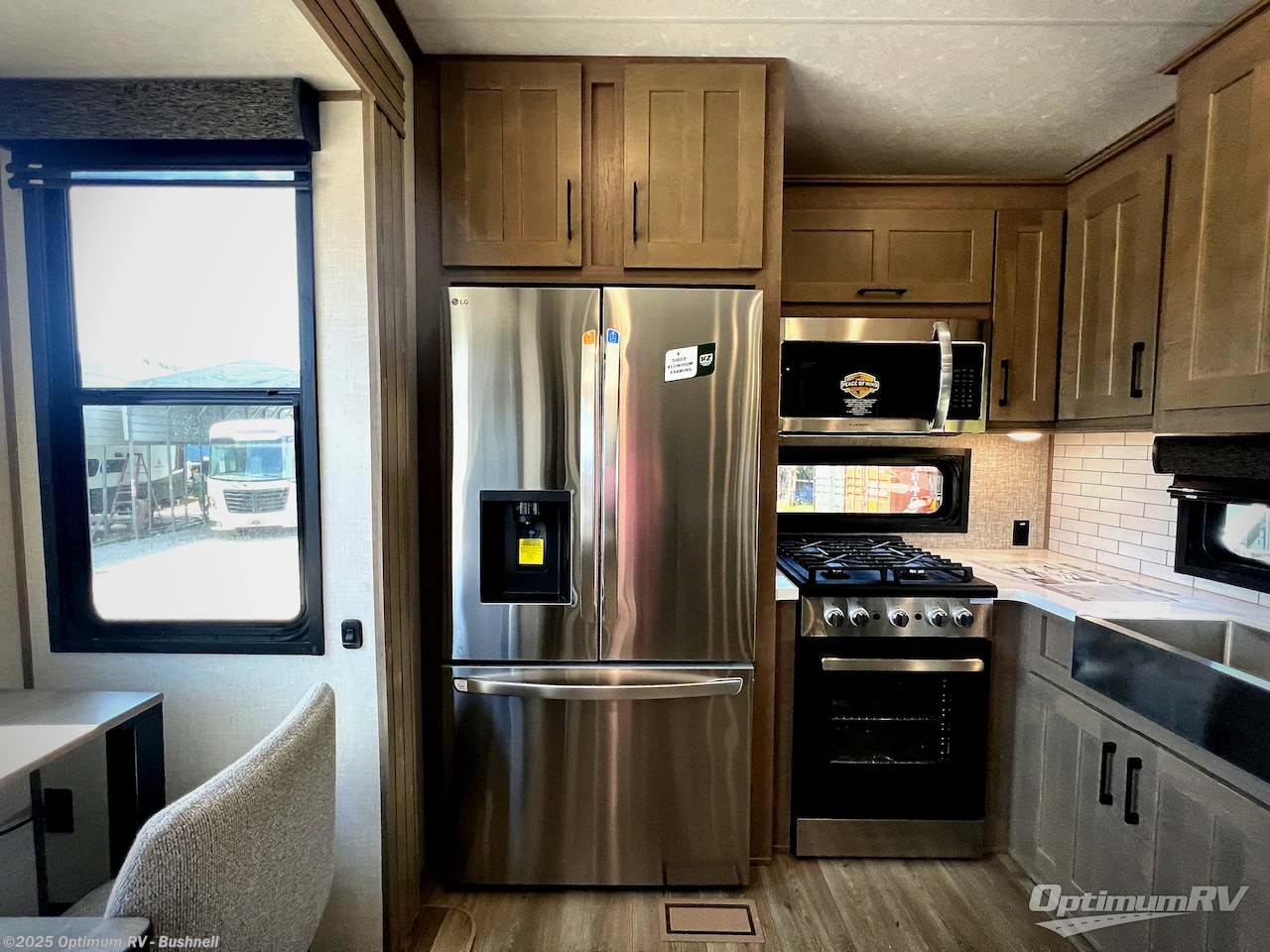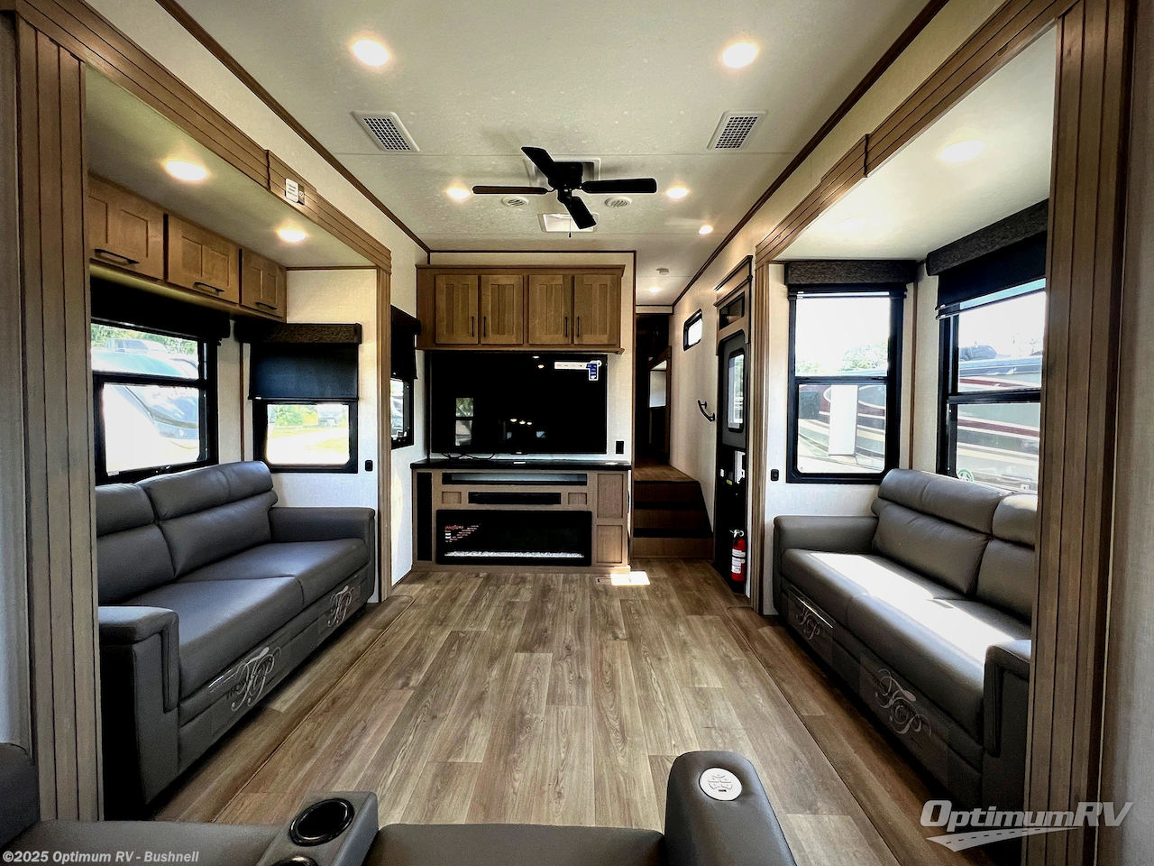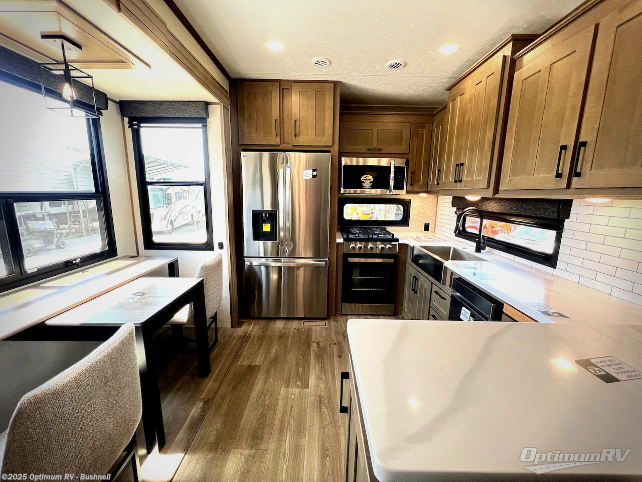 Any cook will love this fifth wheel's layout with a rear kitchen which includes residential appliances, a farmhouse stainless steel sink, a dishwasher, a pantry, and a view of the middle, separate living area. You can even see the 65" LED TV with a fireplace below from the slide out which includes the sliding table / desk with chairs. The theater seating with USB ports, and two hide-a-bed sofa slides widen this area so everyone can stretch out and relax. At night, retire to your own front bedroom with a slide out king electric tilt bed with drawers underneath, a front wardrobe including washer and dryer prep, a closet with a built-in hamper, plus a slide out dresser with a 32" Smart LED TV above it. And the full bathroom provides a residential shower with a seat plus linen storage, and two sinks for more convenience.