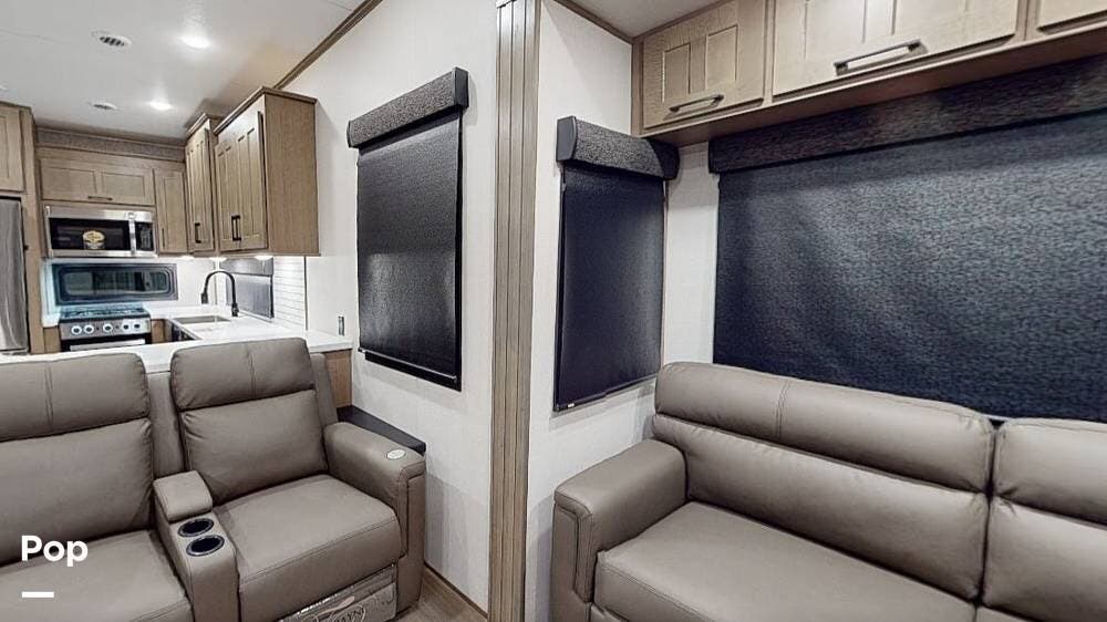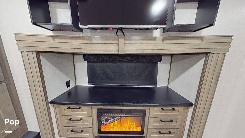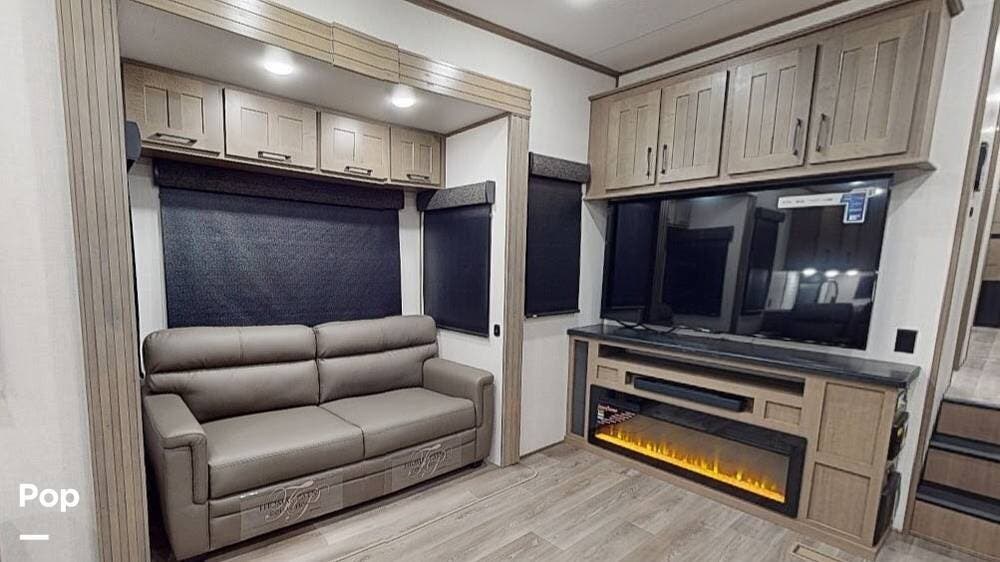 As you enter the door closer to the front, you are greeted by a spacious living area with two sleeper sofas and two stadium recliners, a large 65-inch TV, and an electric fireplace.