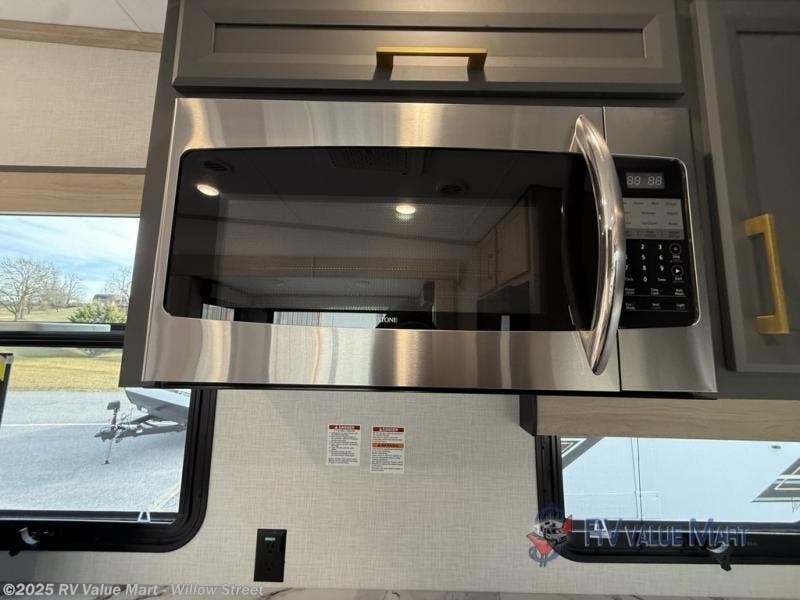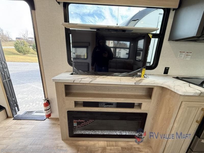 When you want to get away from it all, hitch up this spacious fifth wheel and head out! Once you arrive at the campground, you can make lunch in the rear kitchen that includes ample counter space, a 21" oven and 30" microwave, plus a pantry and French door refrigerator for food storage. Your crew can relax at the L-dinette with an EZ adjust table or on the theater seating across from the fireplace and Smart LED TV. And if you're needing additional sleeping space, just choose the optional hide-a-bed sofa in place of the theater seating! The dual entry bath features a spacious 42" x 30" residential shower, convenient towel hooks and a large slide out that is shared with the front master bedroom. You'll sleep soundly on the king bed here, and you can keep your things organized in the dresser and front closet. There is also washer and dryer prep if you want to add those appliances!