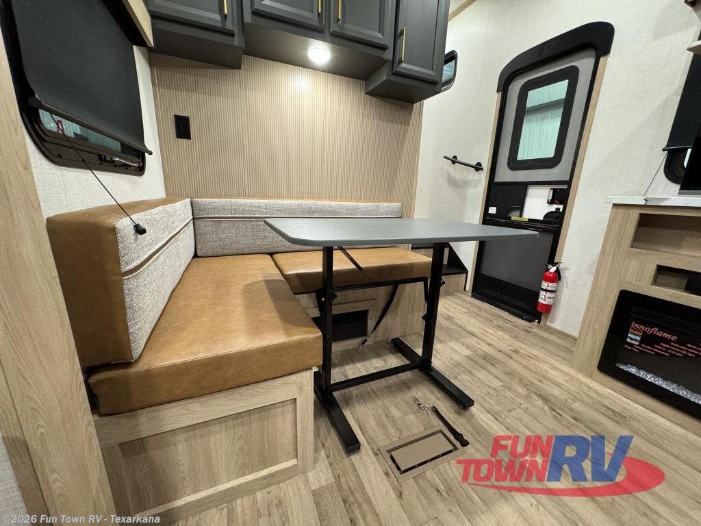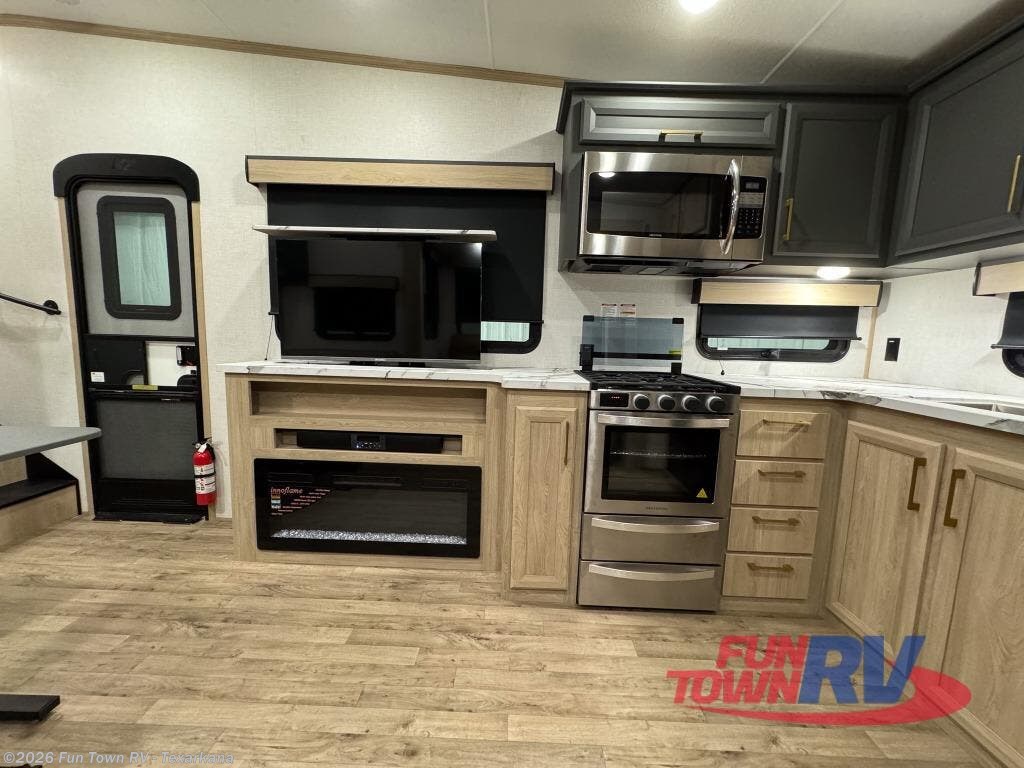 When you want to get away from it all, hitch up this spacious fifth wheel and head out! Once you arrive at the campground, you can make lunch in the rear kitchen that includes ample counter space, a 21" oven and 30" microwave, plus a pantry and French door refrigerator for food storage. Your crew can relax at the L-dinette with an EZ adjust table or on the theater seating across from the fireplace and Smart LED TV. And if you're needing additional sleeping space, just choose the optional hide-a-bed sofa in place of the theater seating! The dual entry bath features a spacious 42" x 30" residential shower, convenient towel hooks and a large slide out that is shared with the front master bedroom. You'll sleep soundly on the king bed here, and you can keep your things organized in the dresser and front closet. There is also washer and dryer prep if you want to add those appliances!