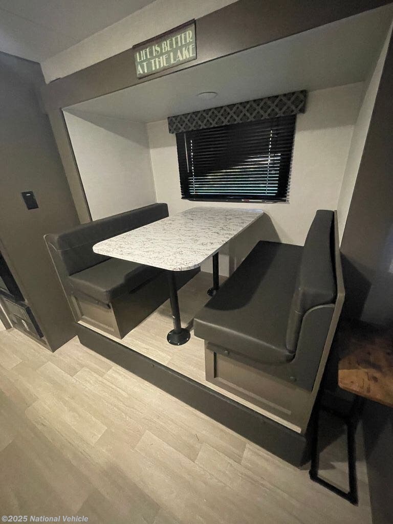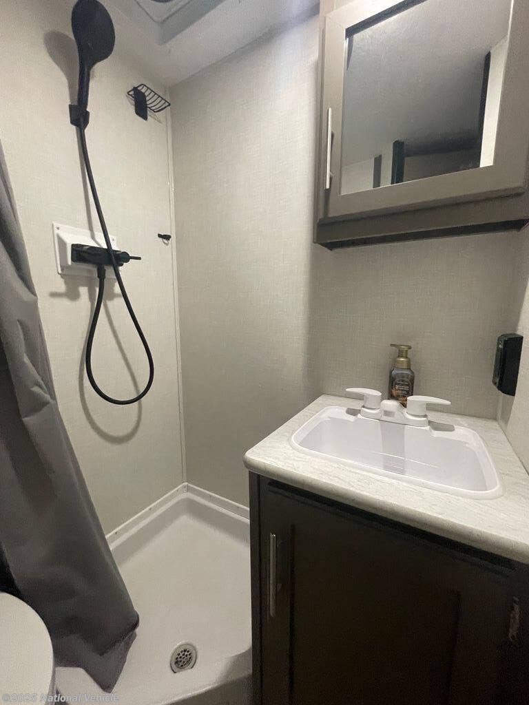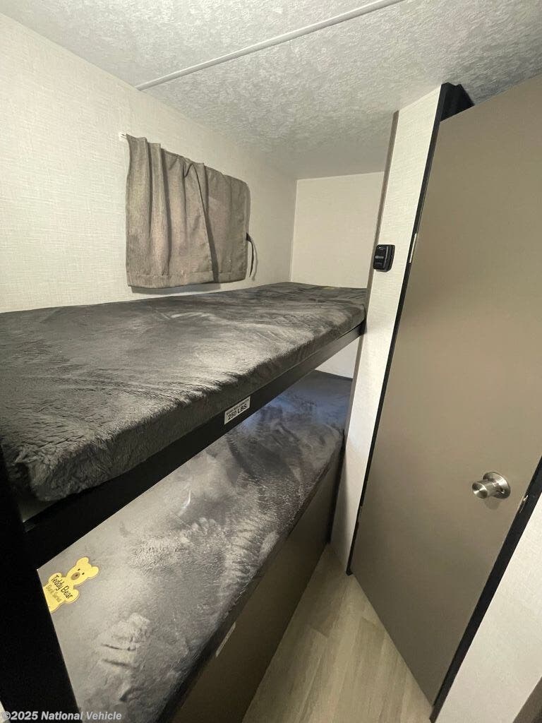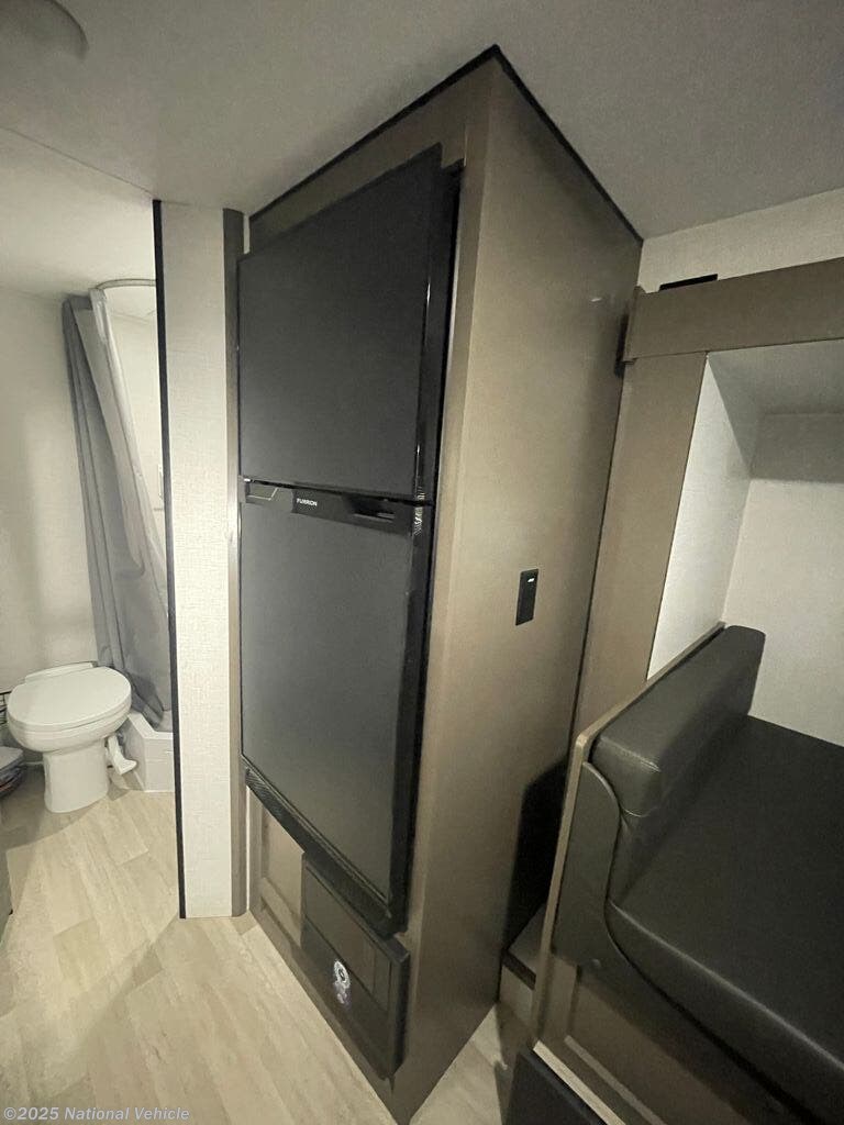 Inside, the thoughtfully designed floorplan includes a front queen bed, rear bunk beds, and a booth dinette that easily converts into extra sleeping space?perfect for families or guests. The well-equipped kitchen features a two-burner cooktop, microwave, refrigerator, and plenty of storage, making meal prep simple and efficient on the road. The full bathroom with a shower and vanity adds an extra layer of convenience for off-grid adventures.