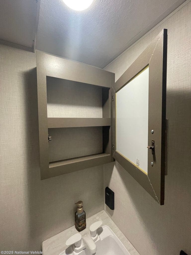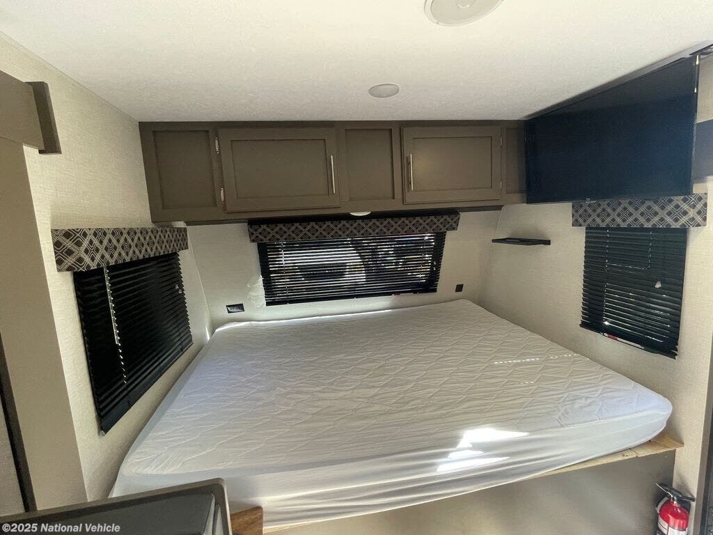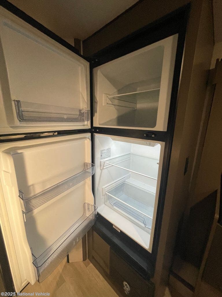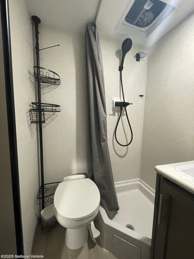 Inside, the thoughtfully designed floorplan includes a front queen bed, rear bunk beds, and a booth dinette that easily converts into extra sleeping space?perfect for families or guests. The well-equipped kitchen features a two-burner cooktop, microwave, refrigerator, and plenty of storage, making meal prep simple and efficient on the road. The full bathroom with a shower and vanity adds an extra layer of convenience for off-grid adventures.