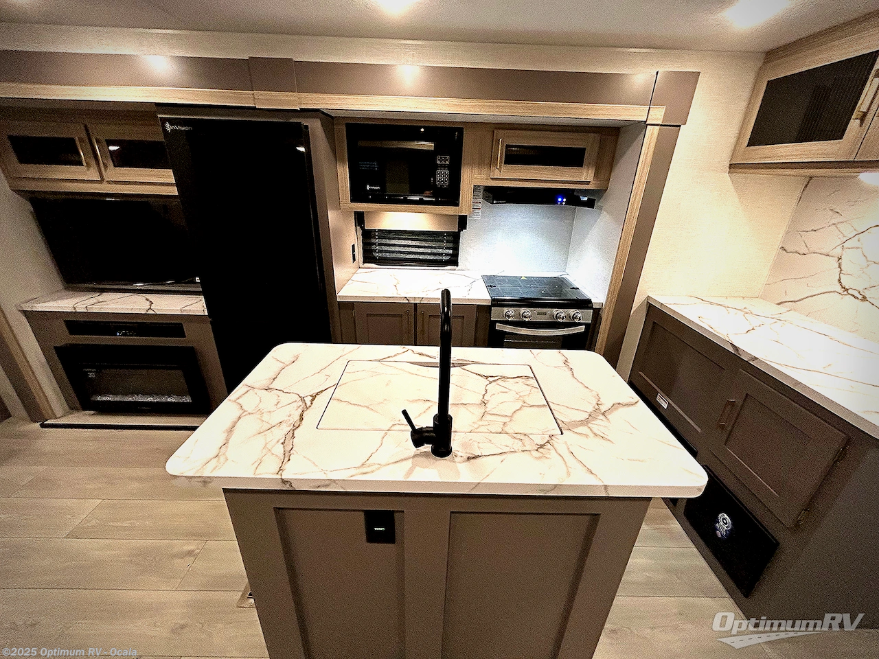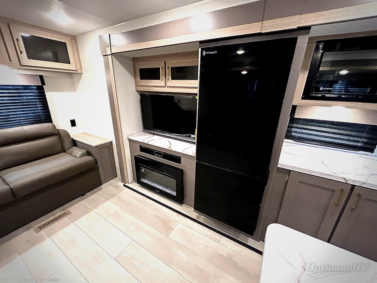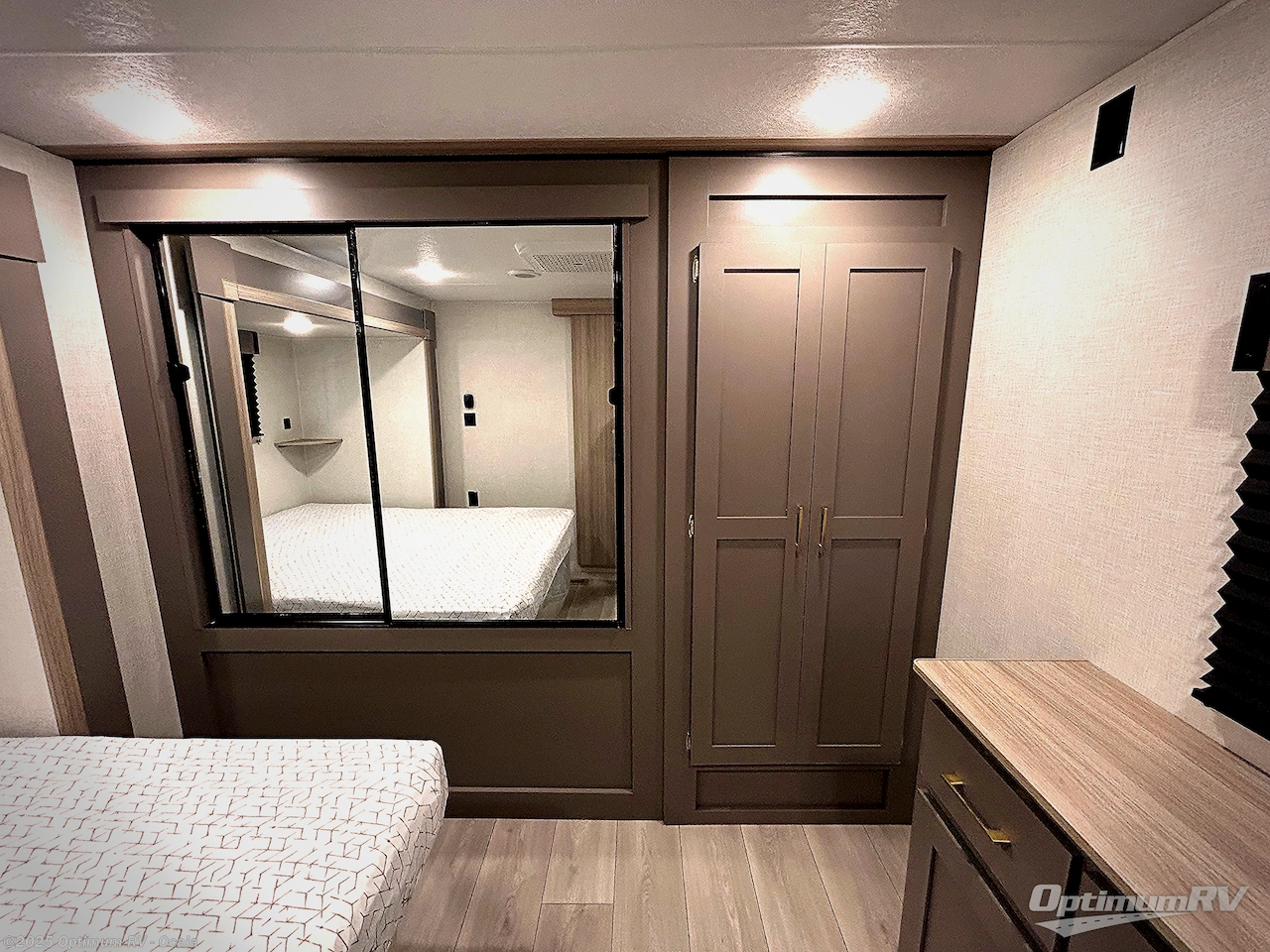 Wow! Check out the space you will have in this travel trailer with dual opposing slides in the rear living area, plus a slide out queen bed in the bedroom! The kitchen island will provide more counter space, along with the hutch/pantry that includes a microwave above. Your crew can relax on the theater seating, booth dinette, or 70" sofa after dinner is cleaned up, plus you have a 30" fireplace for a more at-home feel. This model also includes a 12' power awning so relax under during day!
