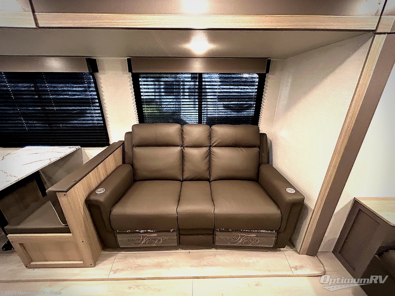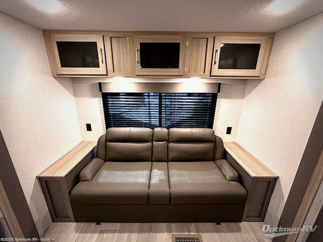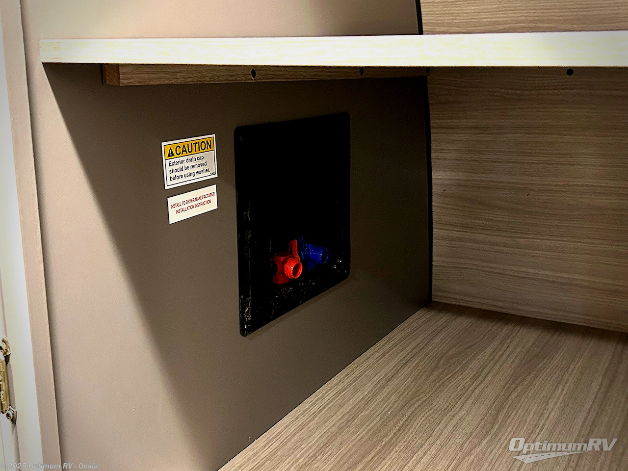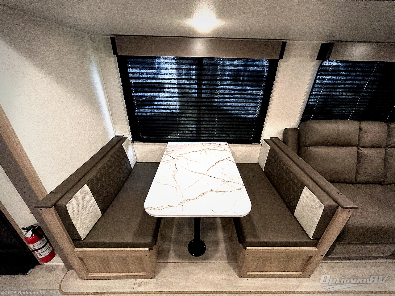 Wow! Check out the space you will have in this travel trailer with dual opposing slides in the rear living area, plus a slide out queen bed in the bedroom! The kitchen island will provide more counter space, along with the hutch/pantry that includes a microwave above. Your crew can relax on the theater seating, booth dinette, or 70" sofa after dinner is cleaned up, plus you have a 30" fireplace for a more at-home feel. This model also includes a 12' power awning so relax under during day!