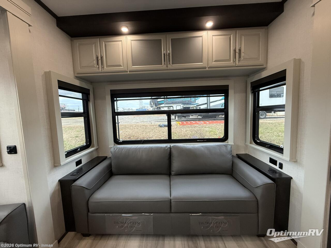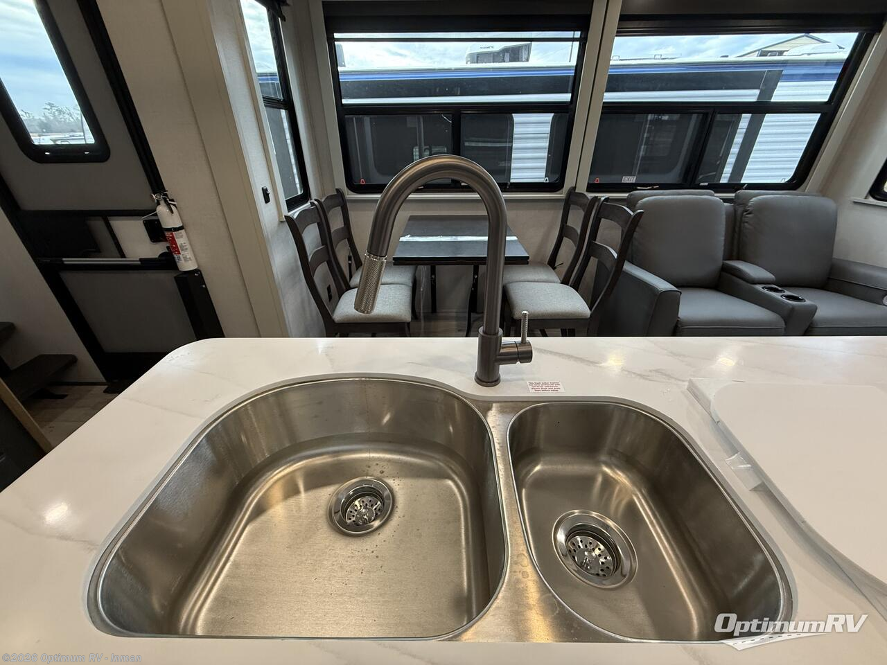 A great coach for an adventurous couple that loves to travel. This Alpine fifth wheel features wide open spaces thanks to triple slides with dual opposing slides in the main combined living and kitchen area. A center island with a sink is great for prep work, and you can easily entertain and have overnight guests with a hide-a-bed sofa sleeper. There is an entertainment center with a fireplace to enjoy when inside, and theater seating opposite for movie night. The chef will appreciate the full kitchen with an 18 cu. ft. residential refrigerator, a range hood, plus a convection microwave and a pull-out countertop to prep meals. Head up to the master suite which features a dual entry bath including a linen cabinet and large shower, plus a king bed that slides out and includes storage space underneath for extra blankets. There is also a master closet, a dresser with a Smart HDTV, and stackable washer and dryer prep if you plan to go full-time!