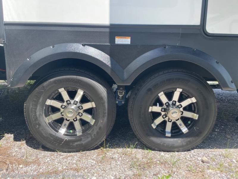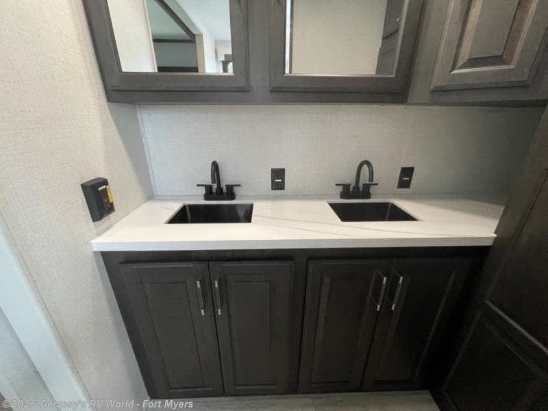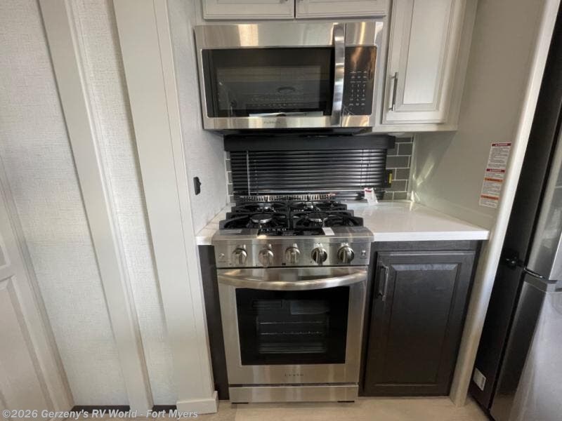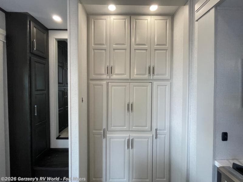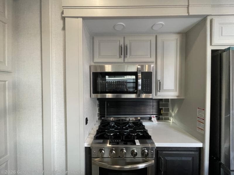 This fifth wheel is decked out in luxuries! The full rear bathroom has a walk-in shower to freshen up in each morning, a dual sink vanity for two to get ready at once, and an area prepped to add an optional washer and dryer. You will enjoy a good night's rest on the king bed slide inside the private bedroom and others can sleep on the opposing tri-fold sofa sleeper slides once they are converted. There are two kitchen pantries to hold everyone's favorite snacks, one of which is a walk-in pantry. The 18 cu. ft. residential refrigerator will keep your perishables fresh and you also have the option to switch it out for a 20 cu. ft. 12V refrigerator instead. The front living area has a front entertainment center with a 40" fireplace and a 50" TV, plus there is Thomas Payne theater seating with massage, heat, LED lights, and a USB charging station to keep your electronics charged while you relax!