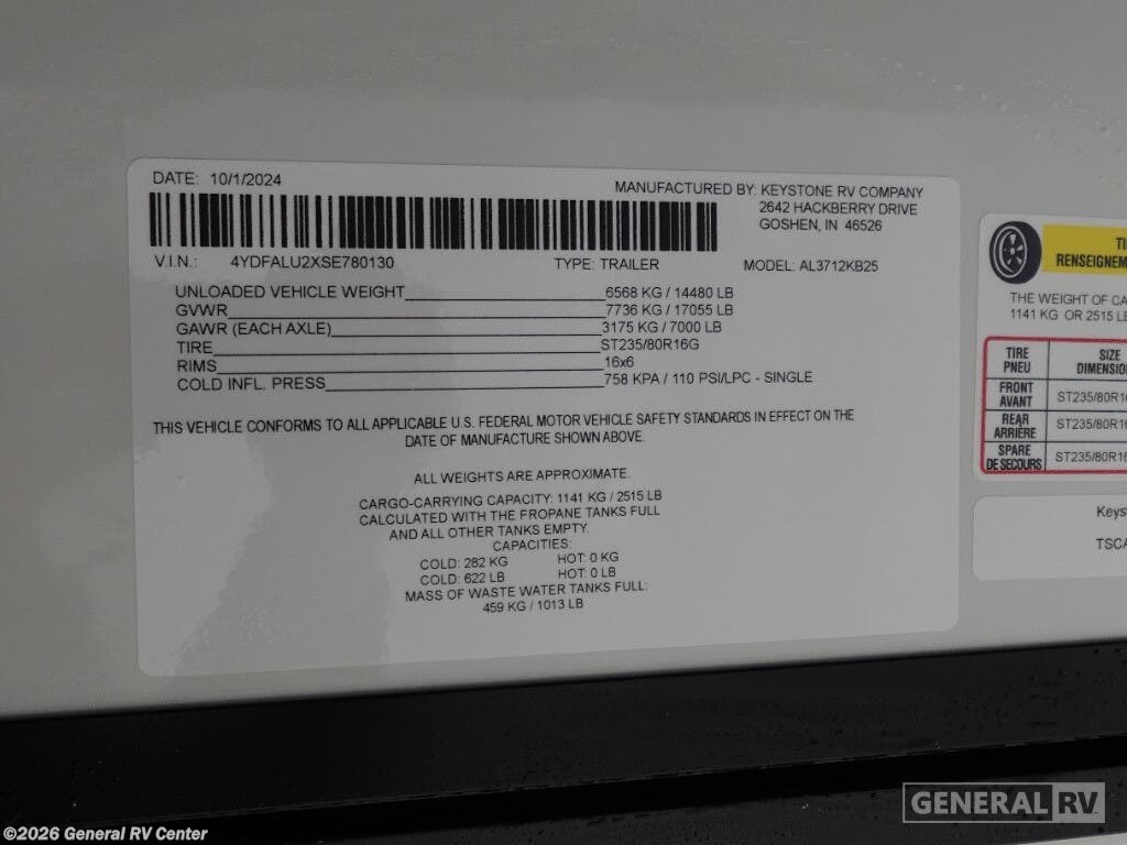 2025 Keystone Alpine 3712KB Specifications