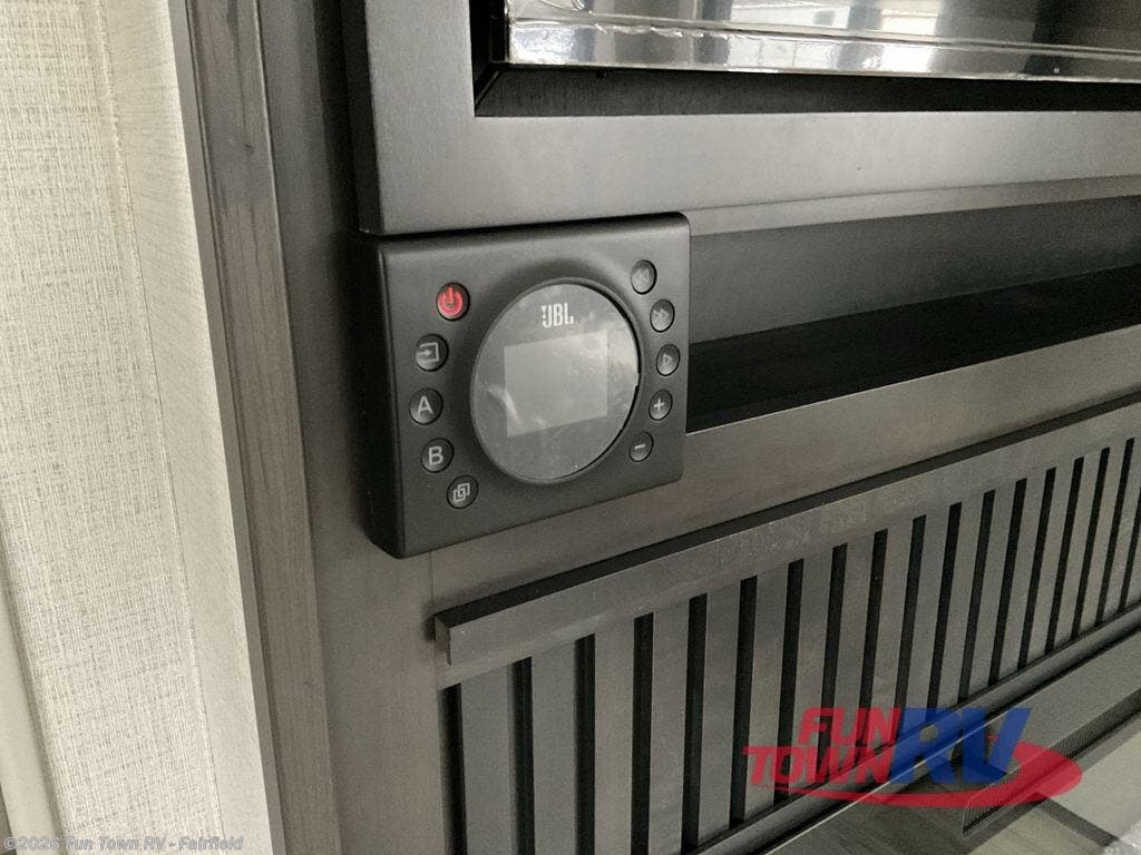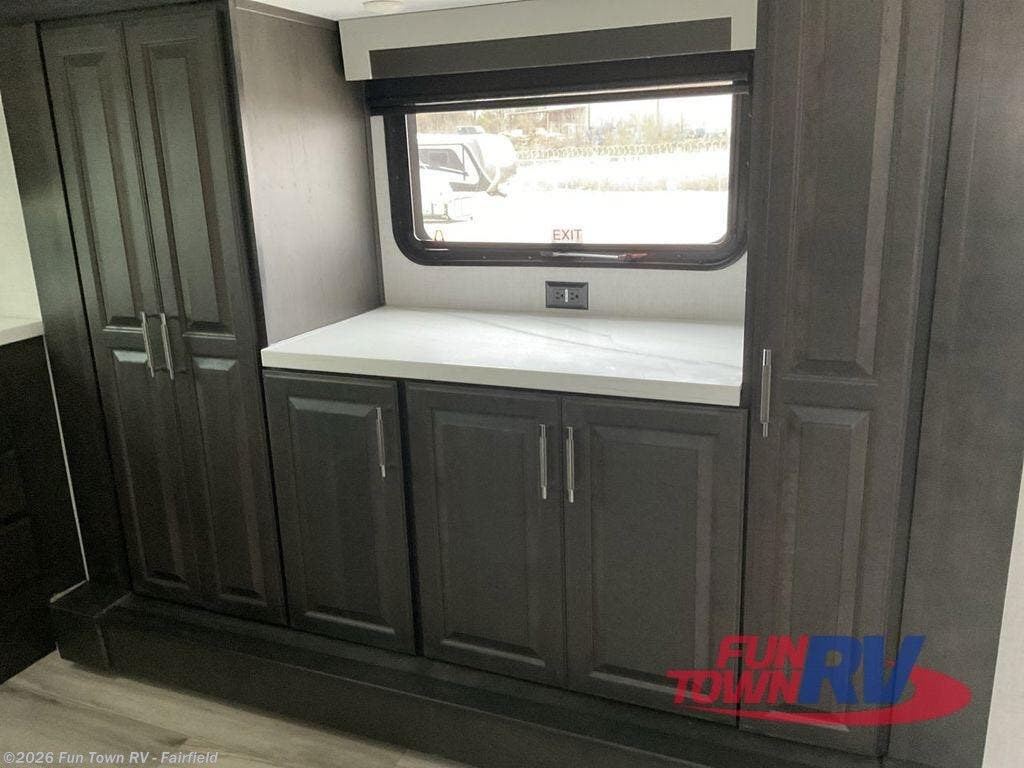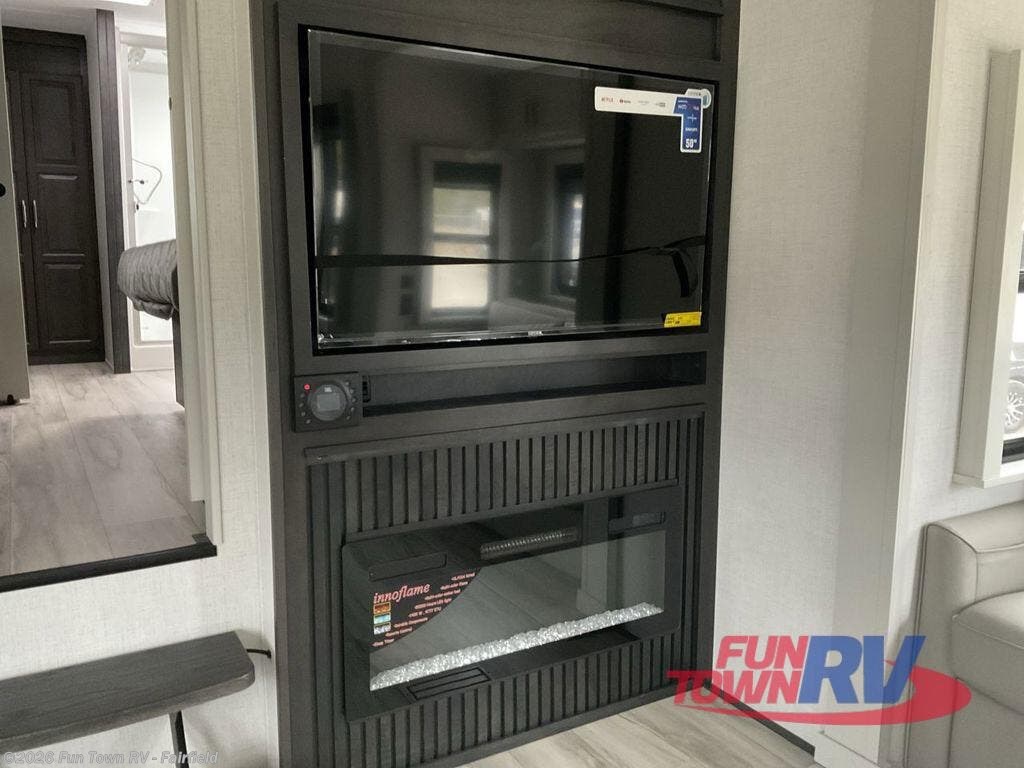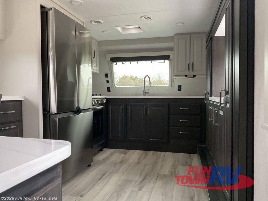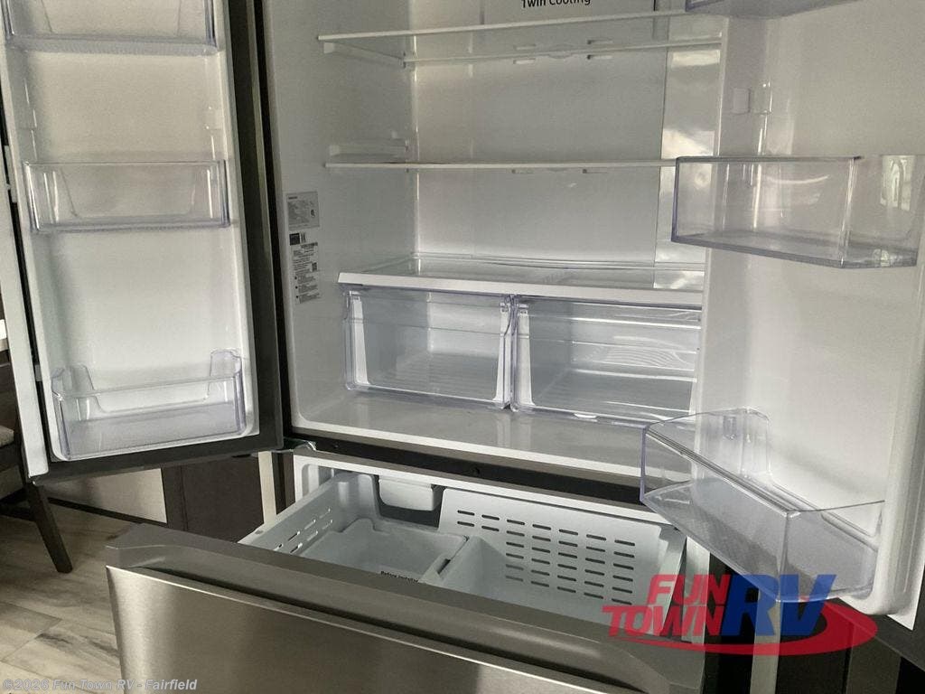 This fifth wheel is decked out in luxuries! The full rear bathroom has a walk-in shower to freshen up in each morning, a dual sink vanity for two to get ready at once, plus washer and dryer prep. You will enjoy a good night's rest on the king bed slide inside the private bedroom and others can sleep on the opposing tri-fold sofa sleeper slides in the living room. There is also a theater seating here, along with a fireplace and 50" LED TV for movie nights. The front kitchen is where it's really at in this fifth wheel; ample counter space, a bar top with stools, pull-out drawers, plus a pantry and closet for even more storage!