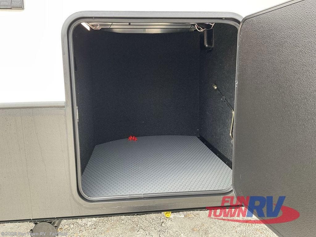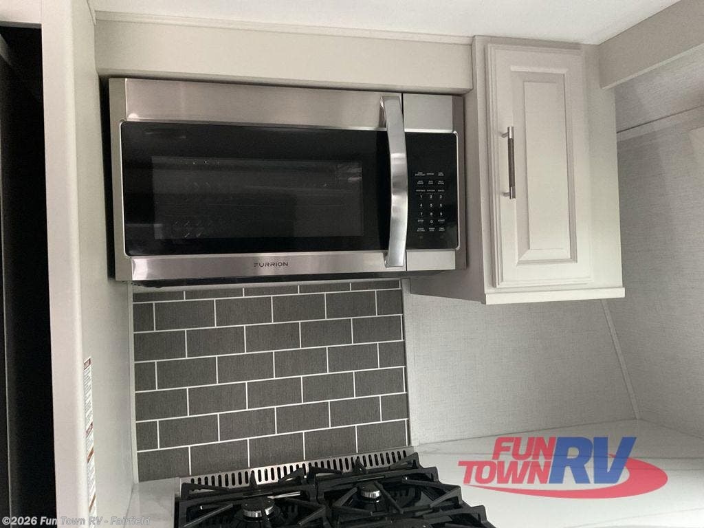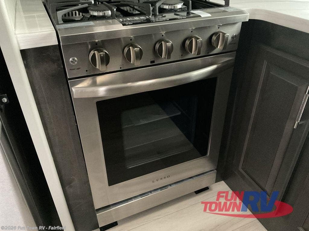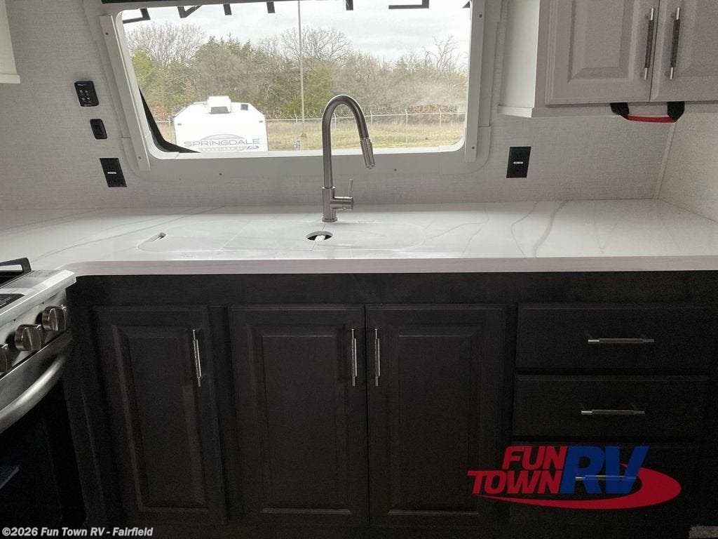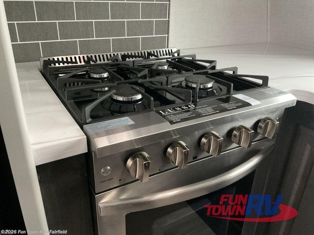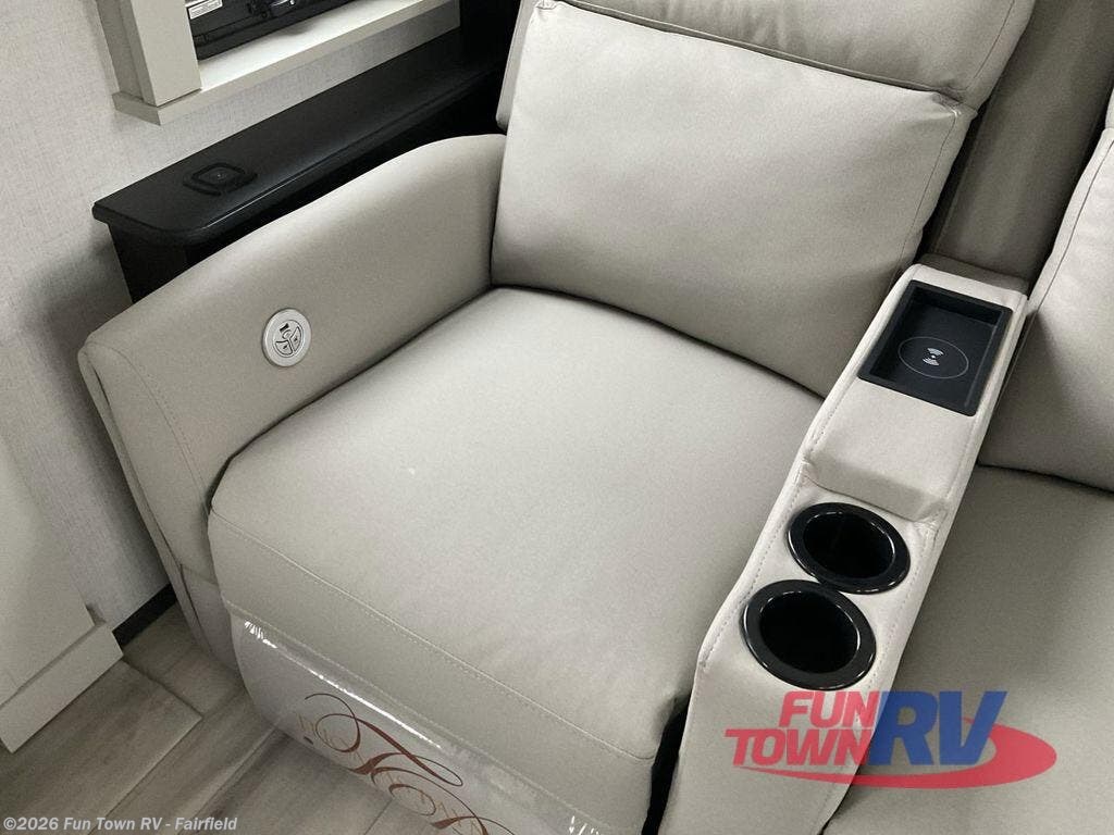 This fifth wheel is decked out in luxuries! The full rear bathroom has a walk-in shower to freshen up in each morning, a dual sink vanity for two to get ready at once, plus washer and dryer prep. You will enjoy a good night's rest on the king bed slide inside the private bedroom and others can sleep on the opposing tri-fold sofa sleeper slides in the living room. There is also a theater seating here, along with a fireplace and 50" LED TV for movie nights. The front kitchen is where it's really at in this fifth wheel; ample counter space, a bar top with stools, pull-out drawers, plus a pantry and closet for even more storage!