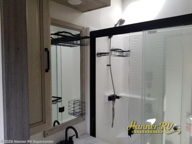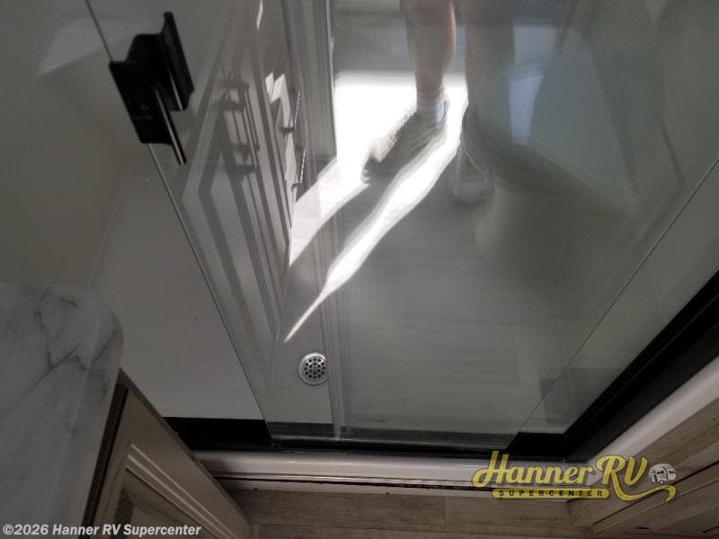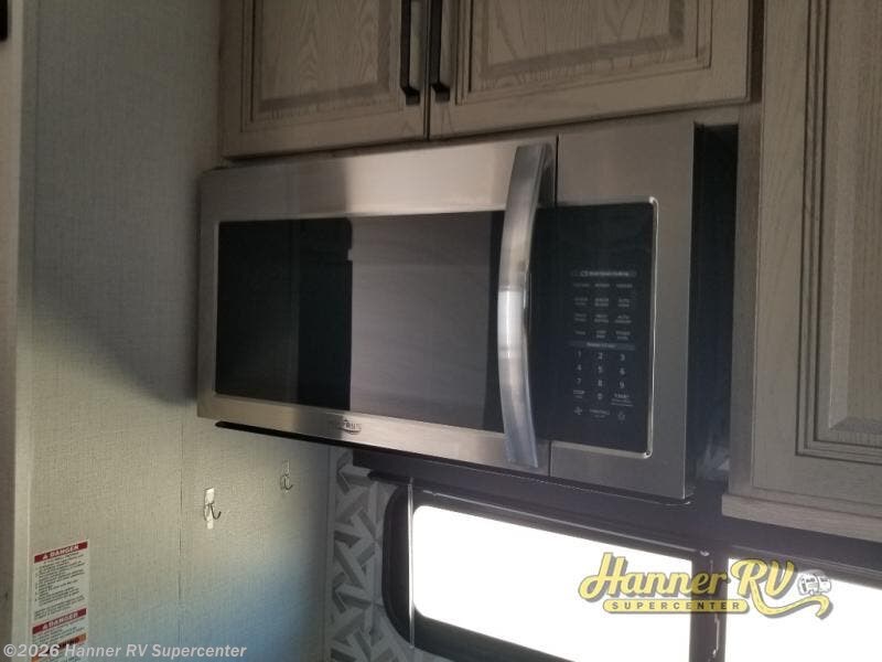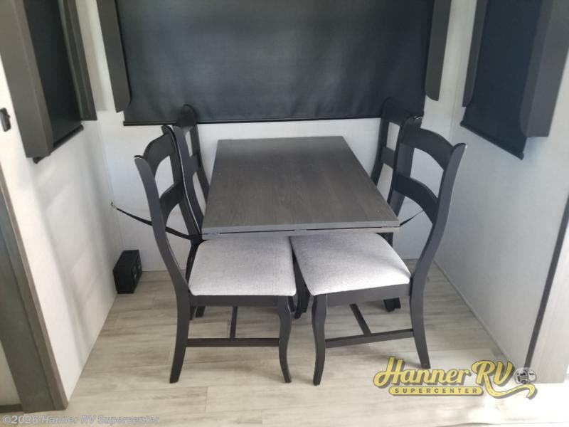 Enjoy traveling with your family and friends in this fifth wheel featuring quad slides providing space for everyone! The front living area offers two of those slides each with a tri-fold sleeper sofa for family or overnight guests. A full wall entertainment center with 65" Smart HD TV and fireplace, plus a theater seat sets this space up as a great gathering place for all to enjoy. Step down to the spacious kitchen and dining area with free standing table and four chairs, a coffee station, plus a refrigerator and range with residential microwave overhead. At the rear of this amazing coach, you will find a raised private master bedroom featuring a king bed slide with storage beneath for extra blankets and such, plus under the entire bedroom area on the outside you will find colossal storage for all sorts of things! The master bedroom offers a master closet, dresser, and a space prepped for a stackable washer and dryer if you choose to add. This unit also features a convenient bathroom located just inside the main entry allowing easy access from outside.