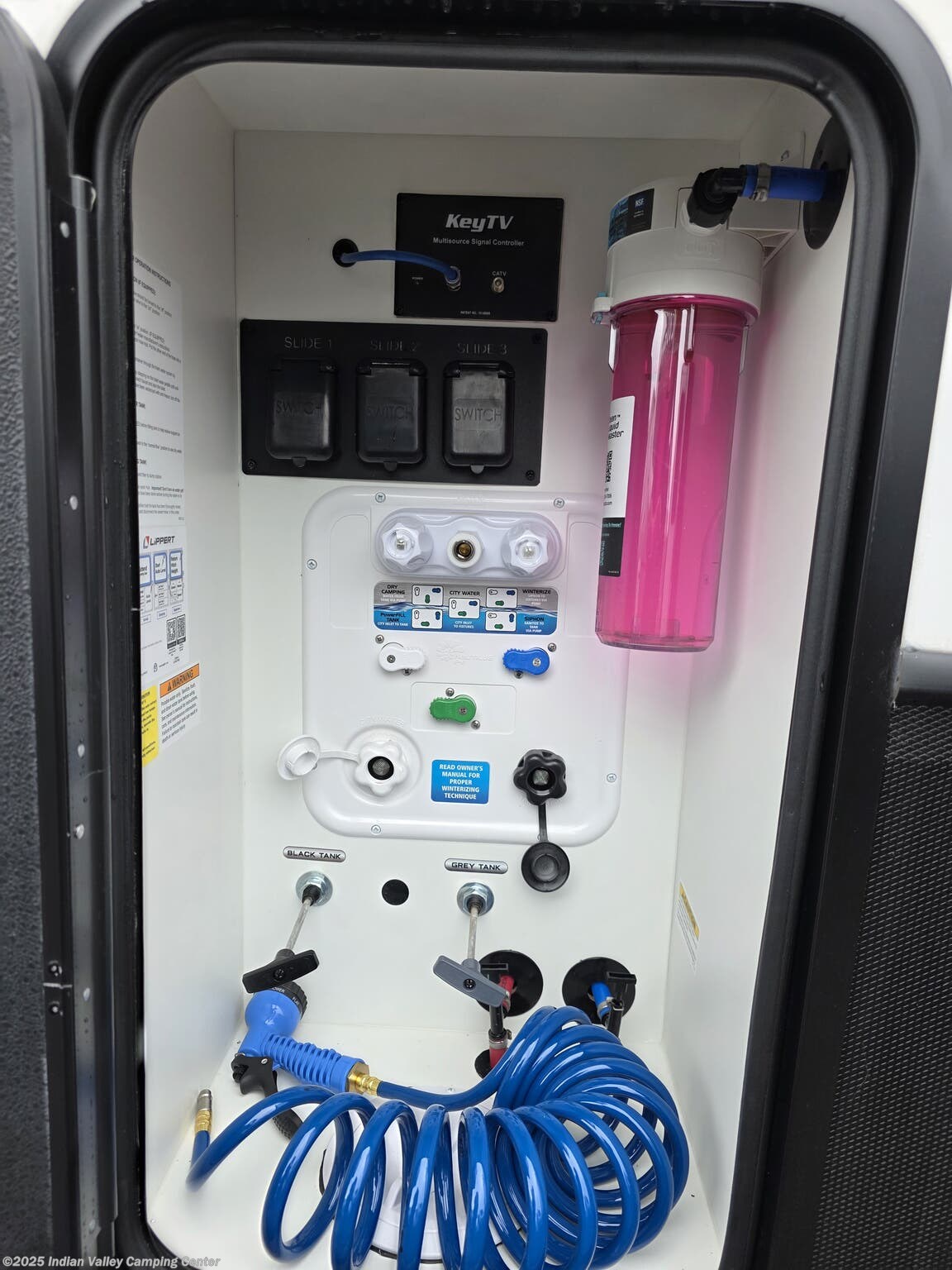 Prepare meals easily with a fully equipped kitchen that includes a refrigerator, microwave, oven, and a stove top burner. The shower and toilet facilities provide convenience, while the exterior features like an external shower and an external speakers system add to the outdoor entertainment options. The water heater ensures hot water on demand, and the RV's multiple slideouts enhance livable space inside.