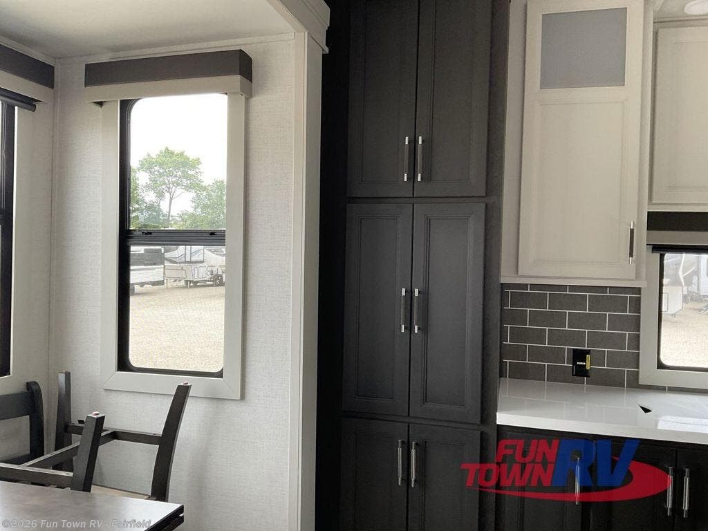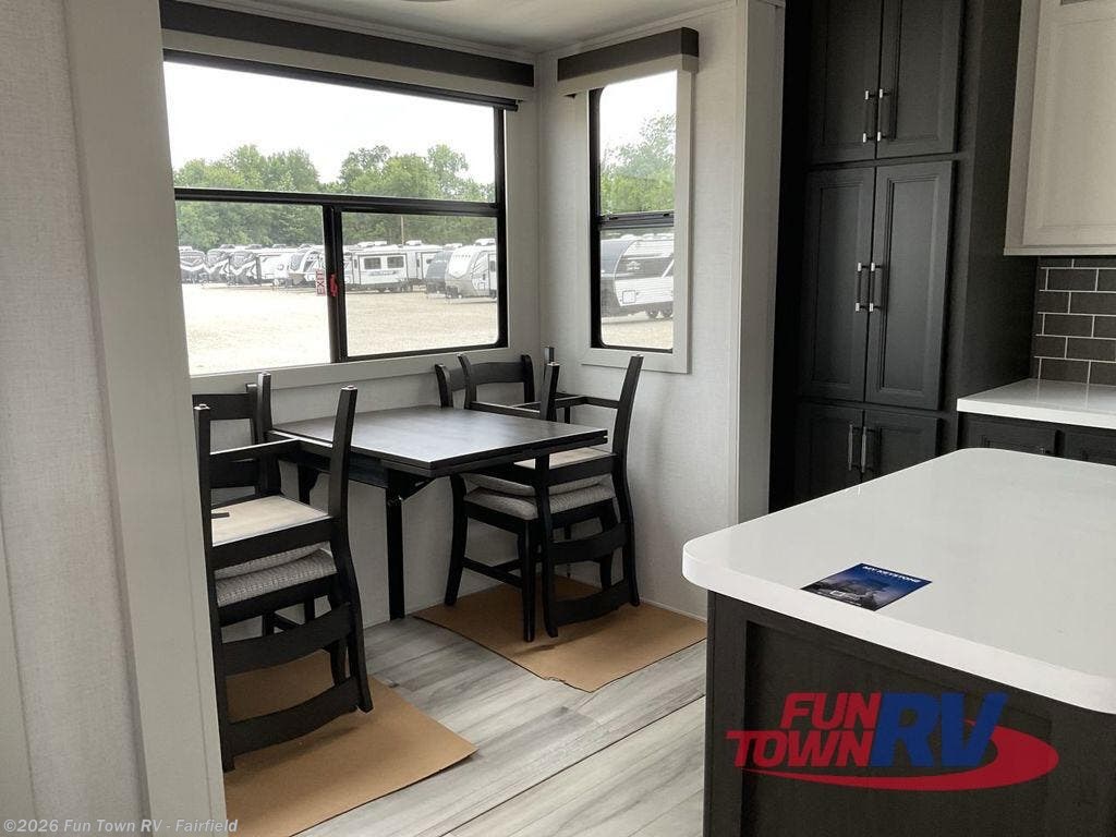 This rear kitchen fifth wheel makes extended stays or weekend trips to the lake enjoyable! The chef of your group will find plenty of counter space with the included kitchen island, plus there is a pantry and 18 cu. ft. residential refrigerator for food storage. A free-standing dinette provides a place to dine together, and the largest L-shaped sofa with recliners will be the perfect spot to relax with a movie. If you have guests, they could sleep here or on the hide-a-bed sofa sleeper. The dual entry bath includes a shower with a seat for added comfort, and the front master bedroom will feel just like home with its king bed slide out and master closet. There is also a dresser and stackable washer and dryer prep if you want to add those appliances!