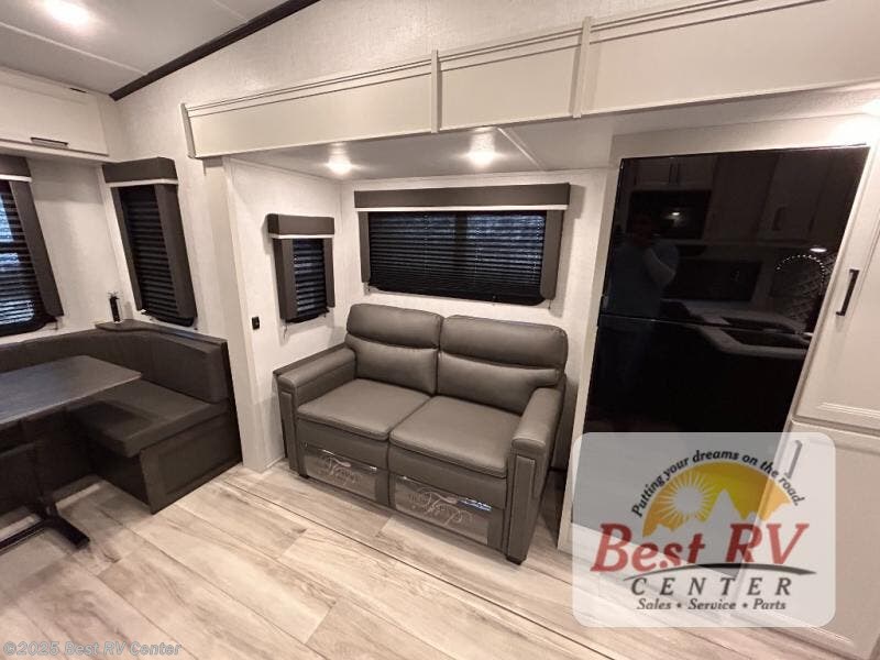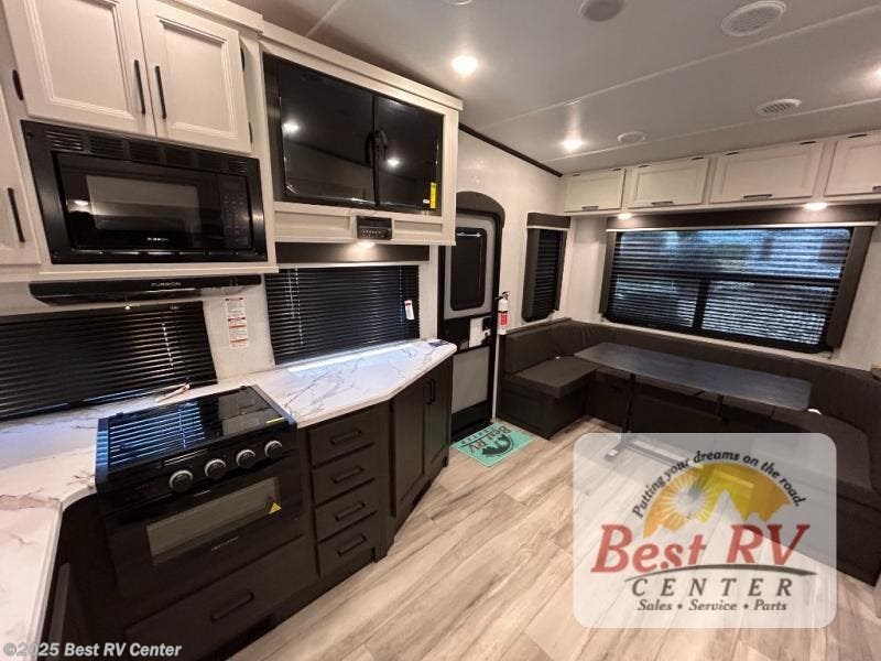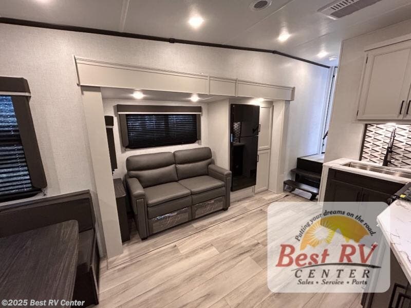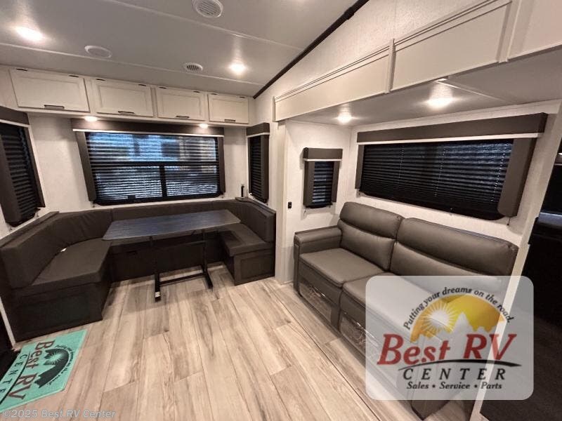Trips to the lake are made complete in this spacious fifth wheel that can sleep six each night. You'll enjoy your own private bedroom up front that includes a queen bed, a wardrobe, plus bedside wardrobes and nightstands for your things. After you've made dinner on the cooktop, you can dine around the rear U-shaped dinette. There is additional seating on the tri-fold sofa, and both of these areas can double as sleeping space for guests. If you're wanting a little more comfort, just choose the optional theater seating in place of the sofa.
