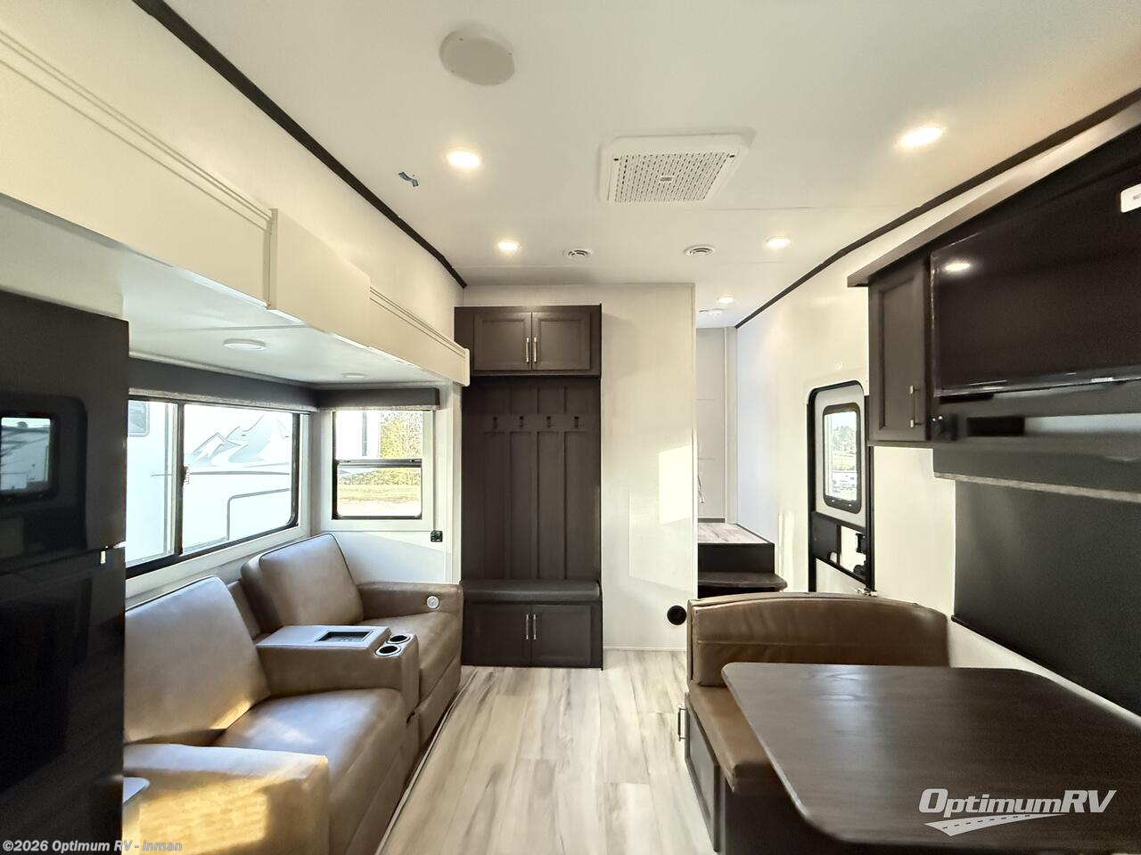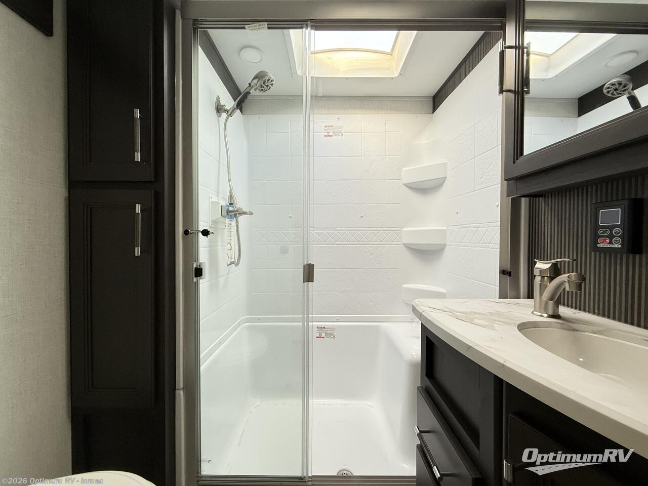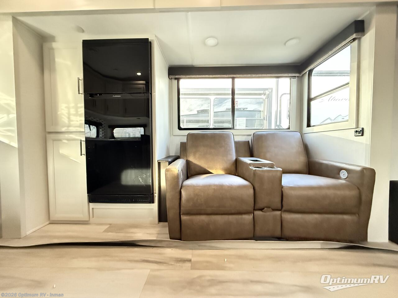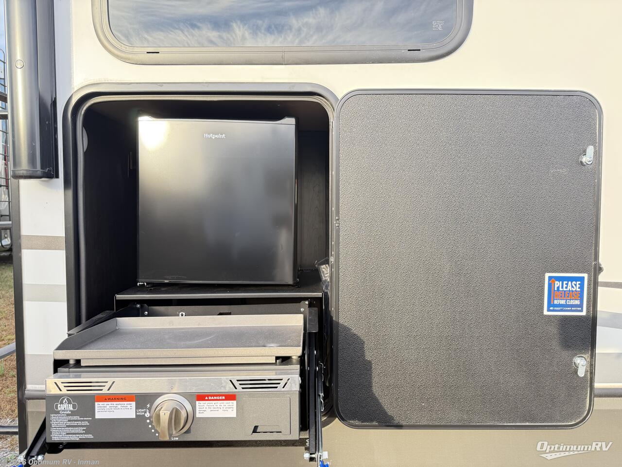 This rear kitchen fifth wheel is packed with features to make each trip memorable! Once you've arrived at the campground and set up the 21' electric awning, you can start lunch on the Grill-N-Chill outdoor kitchen before heading inside. If the weather isn't cooperating, you'll find a 21" Furrion range and microwave oven in the rear kitchen to whip up a meal. There is also a pantry and 10 cu. ft. 12V "Solar Friendly" refrigerator for food storage. The theater seating will provide a place for you to relax in the evenings, and the full bath with a spacious shower means you can clean up before bed. Speaking of bedtime, the front private bedroom includes a queen bed for a great night's rest. There are also dual nightstands and a wardrobe slide to keep your space tidy!