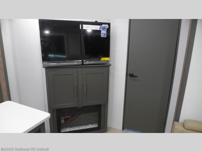 This travel trailer is one the whole gang will love! There is a rear private bunkhouse suite for your guests or the kids, plus a front master bedroom for you. The bunkhouse includes a tri-fold sofa with a flip-up bunk across from a second bunk, plus there is a half bath with its own exterior entry door! The full walk-through bath leads into the front bedroom where you'll find a queen bed, dual wardrobes and a laundry chute so you can throw clothes directly into the pass-through. A super slide in the combined living area and kitchen will provide ample space to move about, and you will find comfy seating on the tri-fold sofa and Do-More dinette table. There is even a fireplace and an entertainment center!