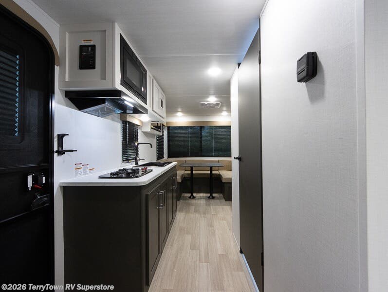 Simple and lightweight, this travel trailer is the unit you've been searching for! Once you arrive at your destination, unload the pass-thru storage, then head inside to start lunch in the full kitchen. Here, you'll find a cooktop and microwave to cook meals on and an 8 cu. ft. refrigerator for perishables. The rear U-shaped dinette can serve as dining and sleeping space for your guests, while you take the front corner queen bed. Don't let this travel trailer slip away!