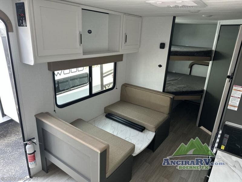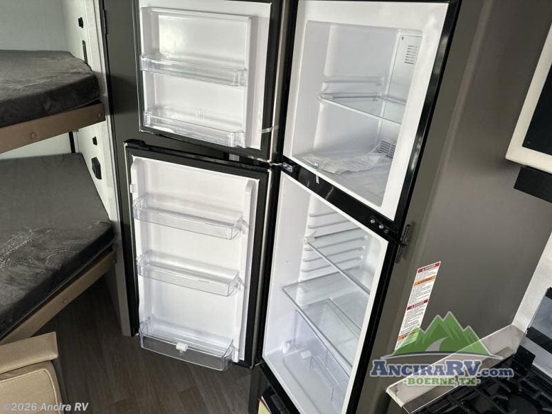You'll love trips to the campground in this travel trailer that can sleep seven each night. The double-size bunks feature a flip-up bunk for added storage, and the bunks are right next to the full bath for easy nighttime use for the little ones. A front Murphy bed can be folded away during the day so you can enjoy added space and the sofa, and there is a Do-More dinette table to dine together or play a board game. The chef of your group will have a full kitchen with a cooktop and microwave oven plus an 8 cu. ft. refrigerator and pantry for food storage. Head outside to enjoy the 15' awning, LP quick connect, and pass-thru storage!