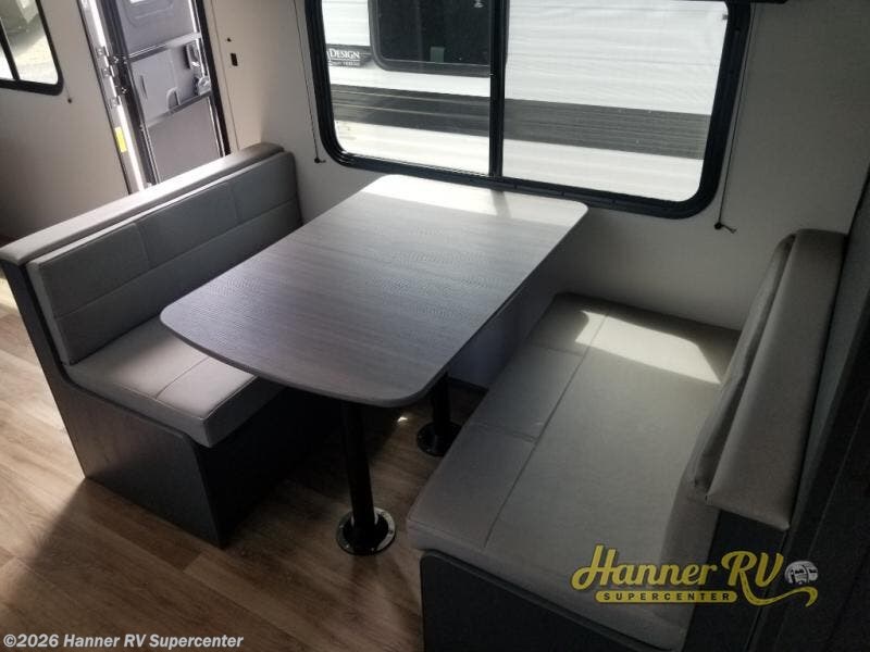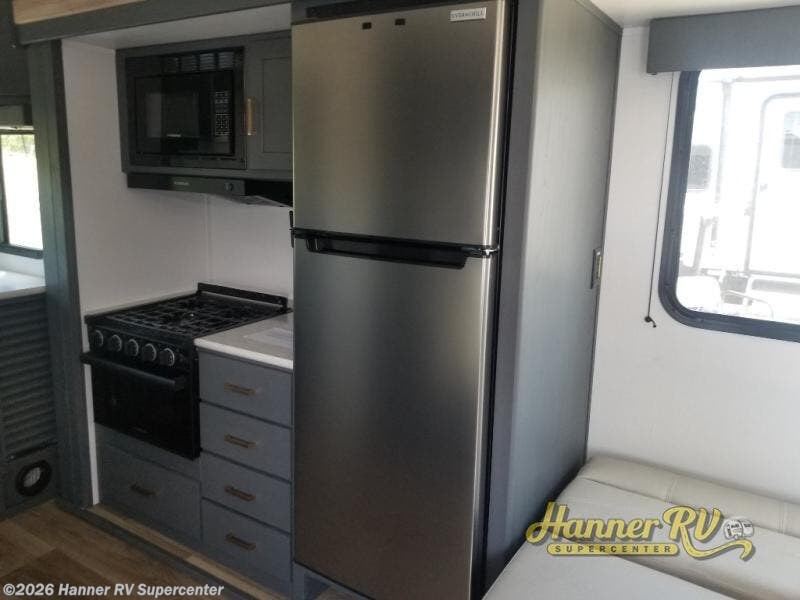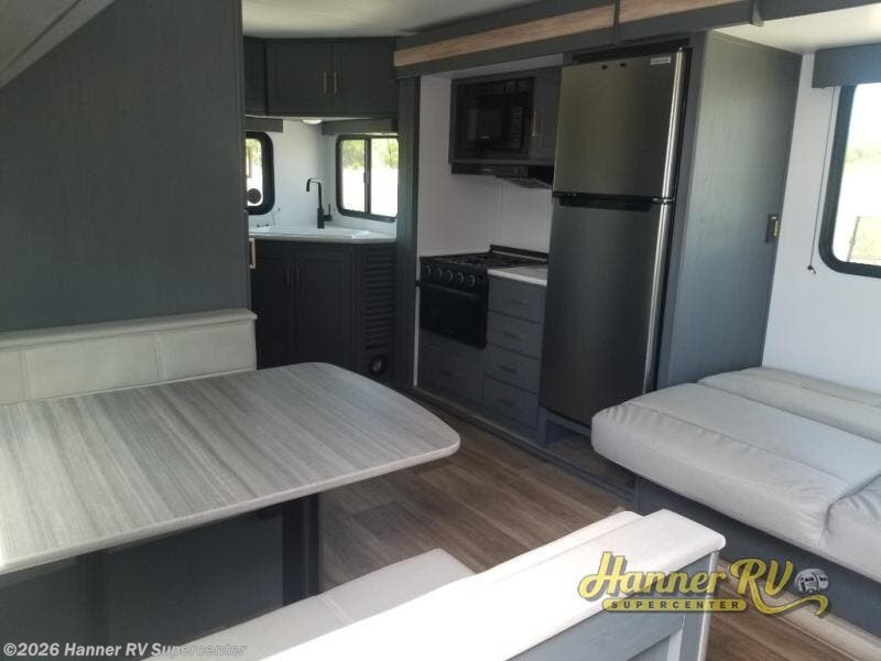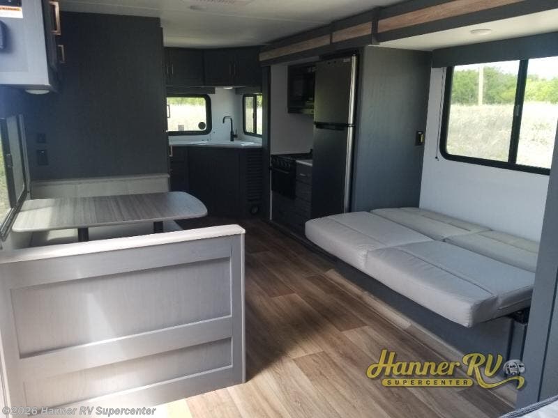 This travel trailer with a large slide out is sure to meet all your needs. When you arrive at the campground, you can put out the patio awning, unload the pass-thru storage, and relax in your camp chairs. The cooktop and microwave oven in the rear corner kitchen will let you make lunch for everyone, and the 8 cu. ft. refrigerator and pantry will help you keep food stocked. You will love having a queen bed to sleep on each night, and the booth dinette and jack knife sofa provide seating and sleeping space for guests!
