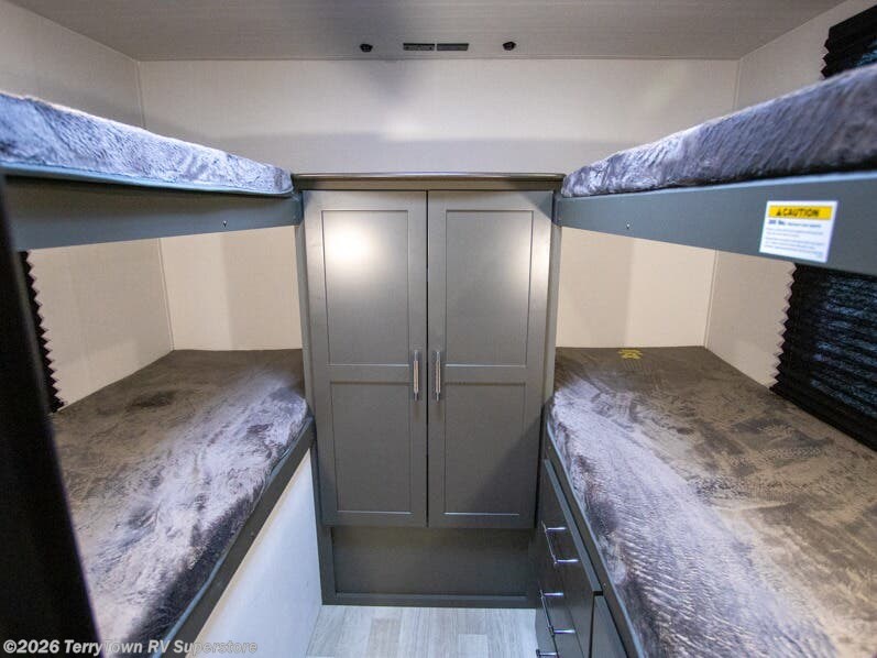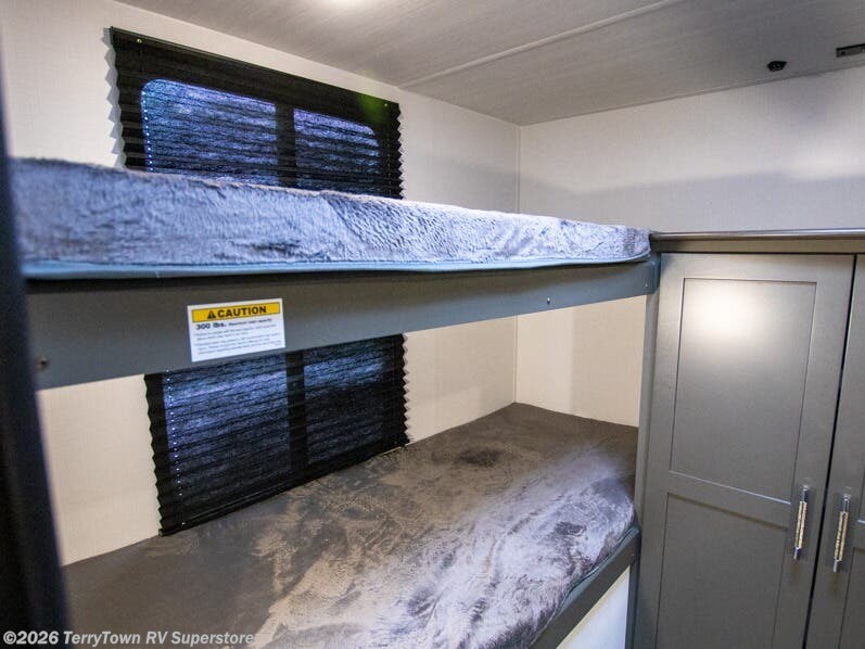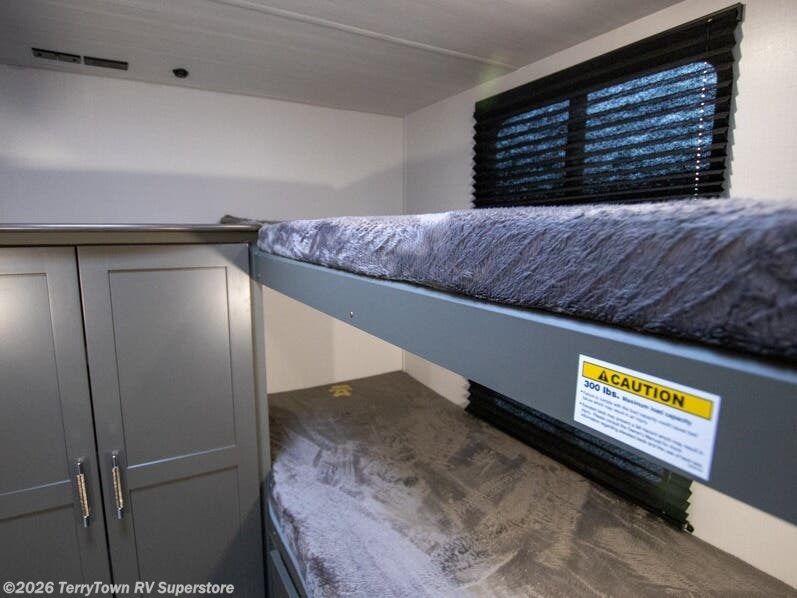 You're going to love this travel trailer with a front private bedroom for you and a rear private bunkhouse for your guests. There are four bunk beds, plus a wardrobe and additional storage to keep this space tidy. And the front bedroom includes a queen bed, dual wardrobes and dual nightstands to keep your phone and books on. Everyone can meet in the main living area that is made spacious by the large slide out. When your crew has worked up an appetite, you can make lunch on the two burner range or use the microwave oven. There is also a large 12V refrigerator to keep cold drinks stocked. Outside, you'll appreciate multiple pass-through storage compartments and a power awning to provide shade!
