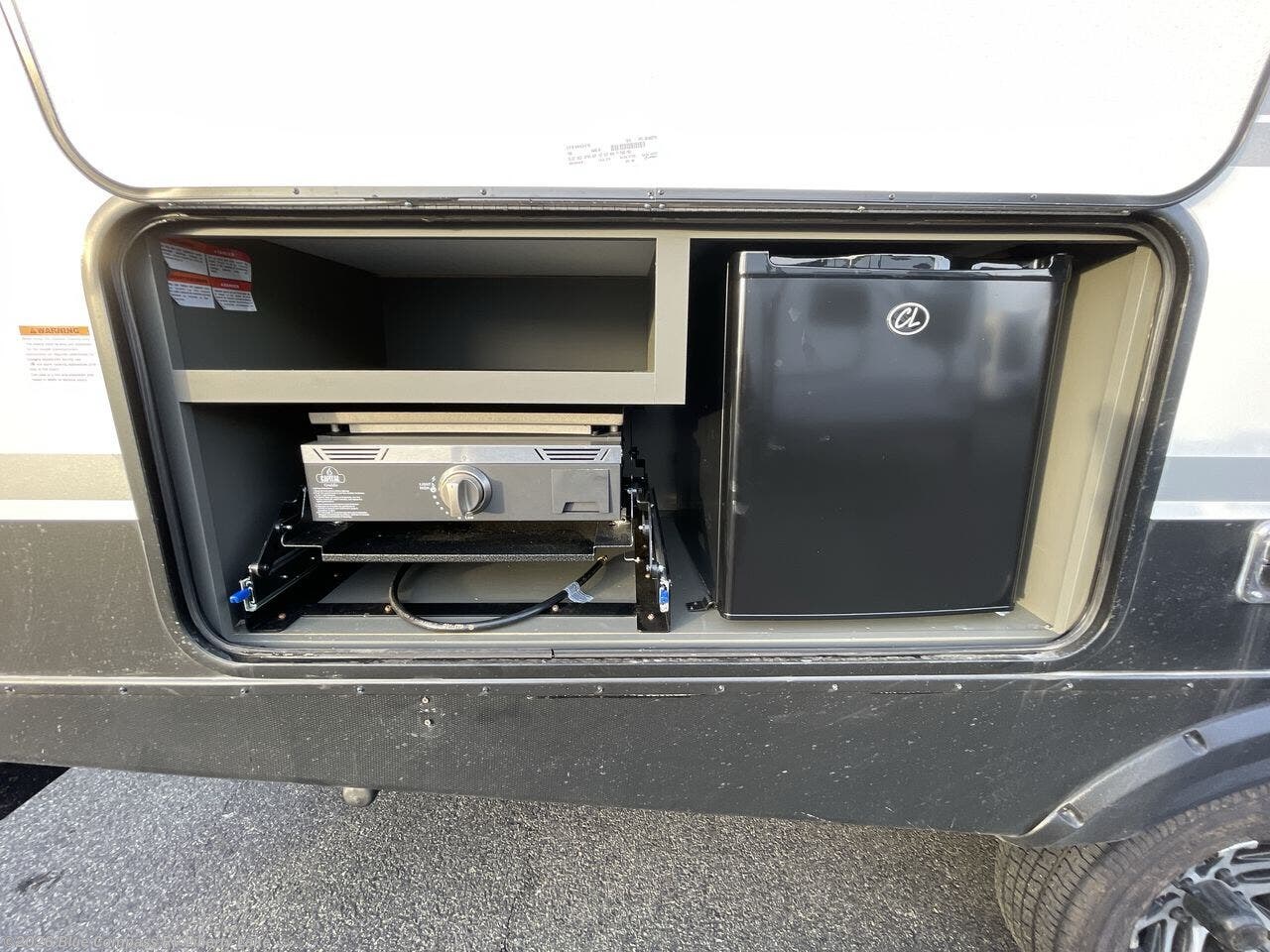 You can easily sleep eight in this travel trailer thanks to the 51" x 74" double-size bunks, the U-shaped Do-More dinette table, and the queen bed in the front bedroom. There is a laundry chute in the bedroom that will go straight to the pass-through storage for convenience. Whip up your best meals on the three burner cooktop, or use the microwave oven. You can dine around the dinette, or take your plate outdoors to sit under the 15' awning, plus there is an outdoor kitchen with a pull-out griddle and refrigerator.