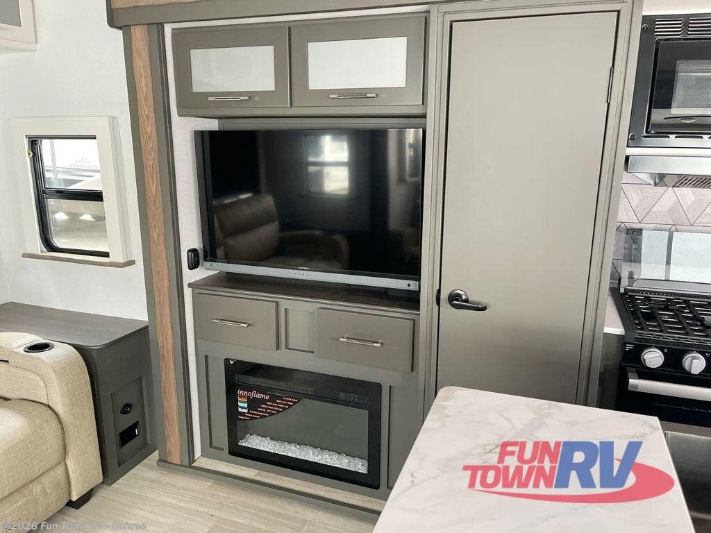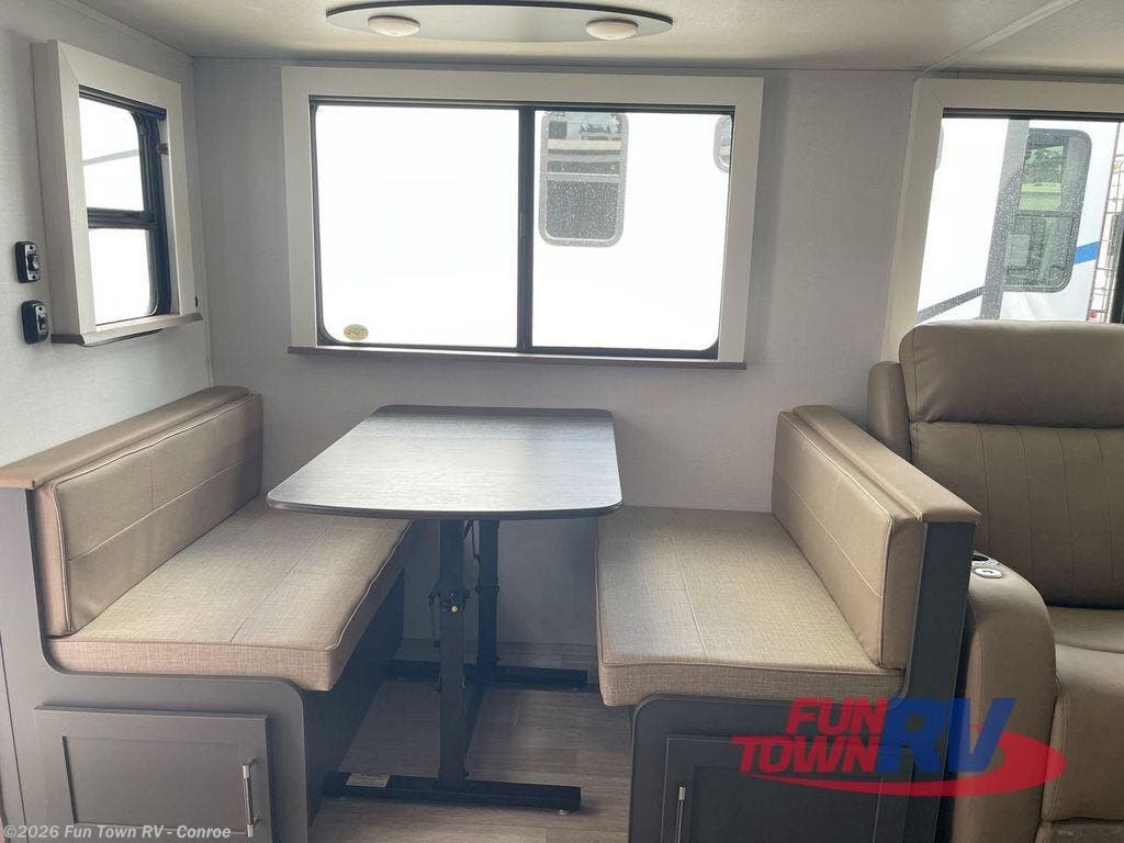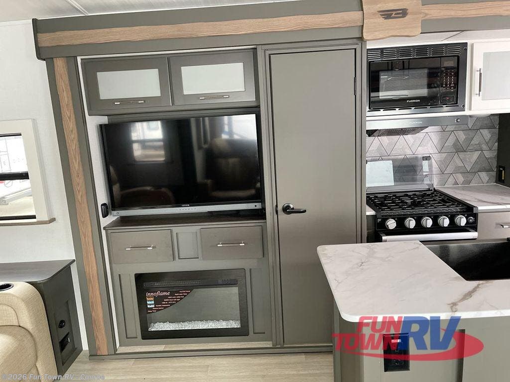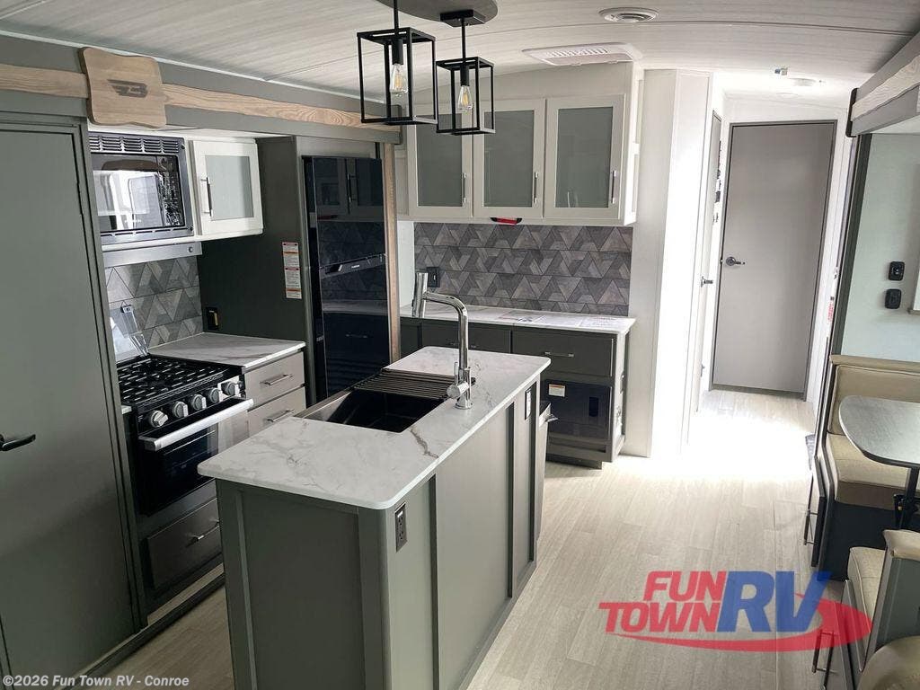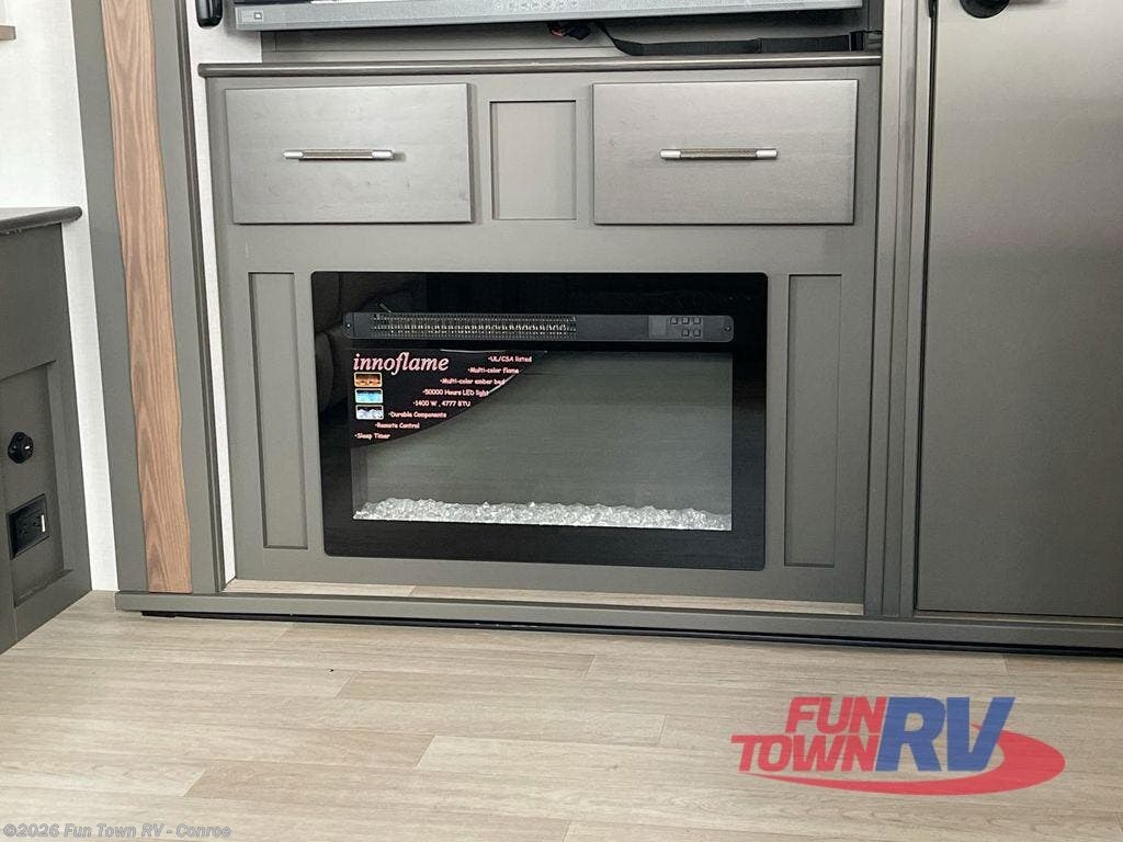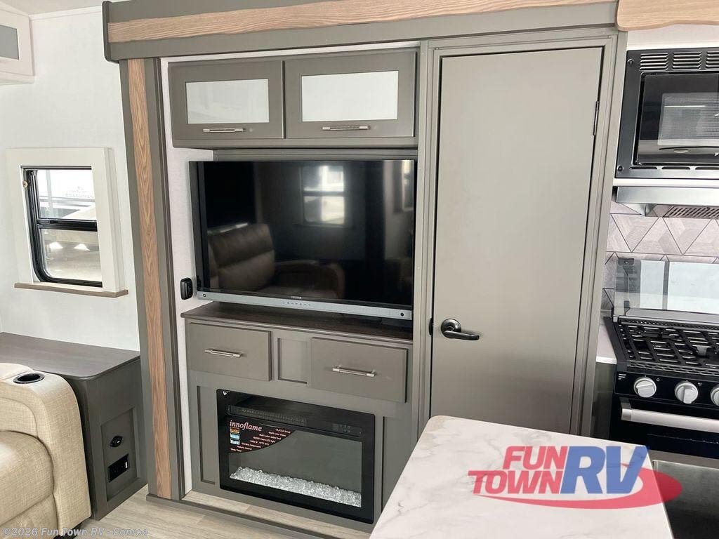 Weekend trips to the campground are made easy in this travel trailer! There are dual opposing slides in the combined kitchen and living area to provide you with ample space to stretch out. A kitchen island will come in handy when prepping meals, plus you'll have all the appliances needed to cook them. You will find comfortable seating on the rear tri-fold sofa sleeper, Do-More dinette table, and theater seats across from the entertainment center and fireplace. When you're ready to call it a night, the front private bedroom with a queen bed will be calling your name, and the full bath onboard will let you freshen up each day!