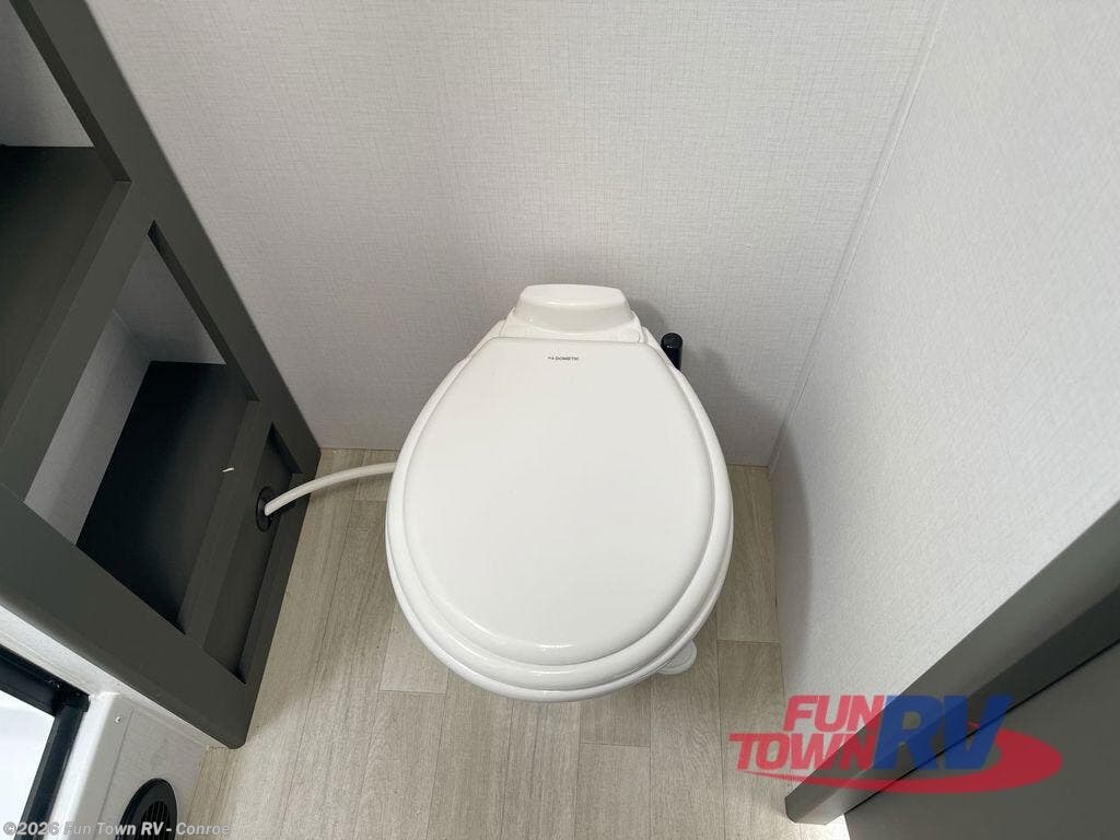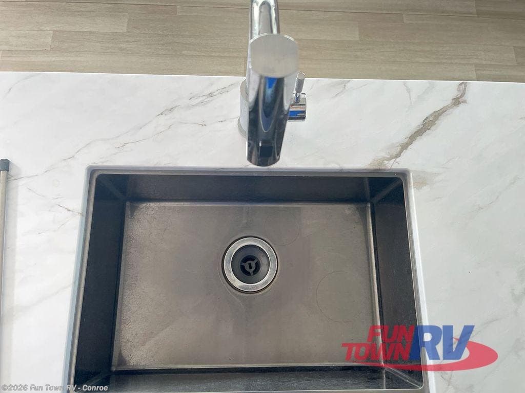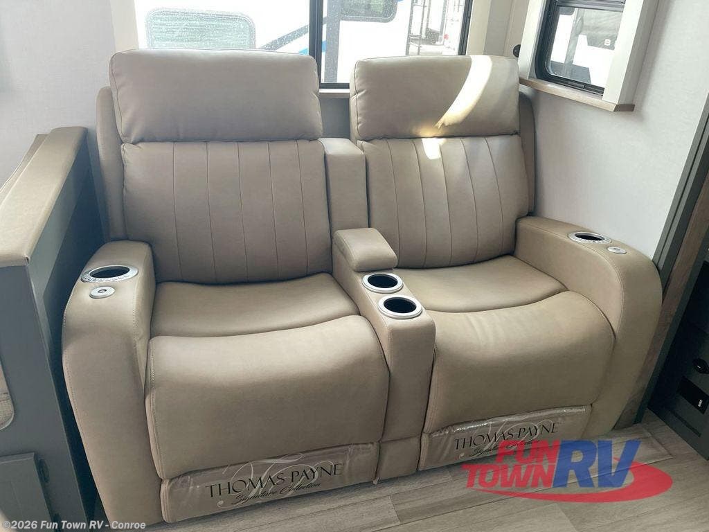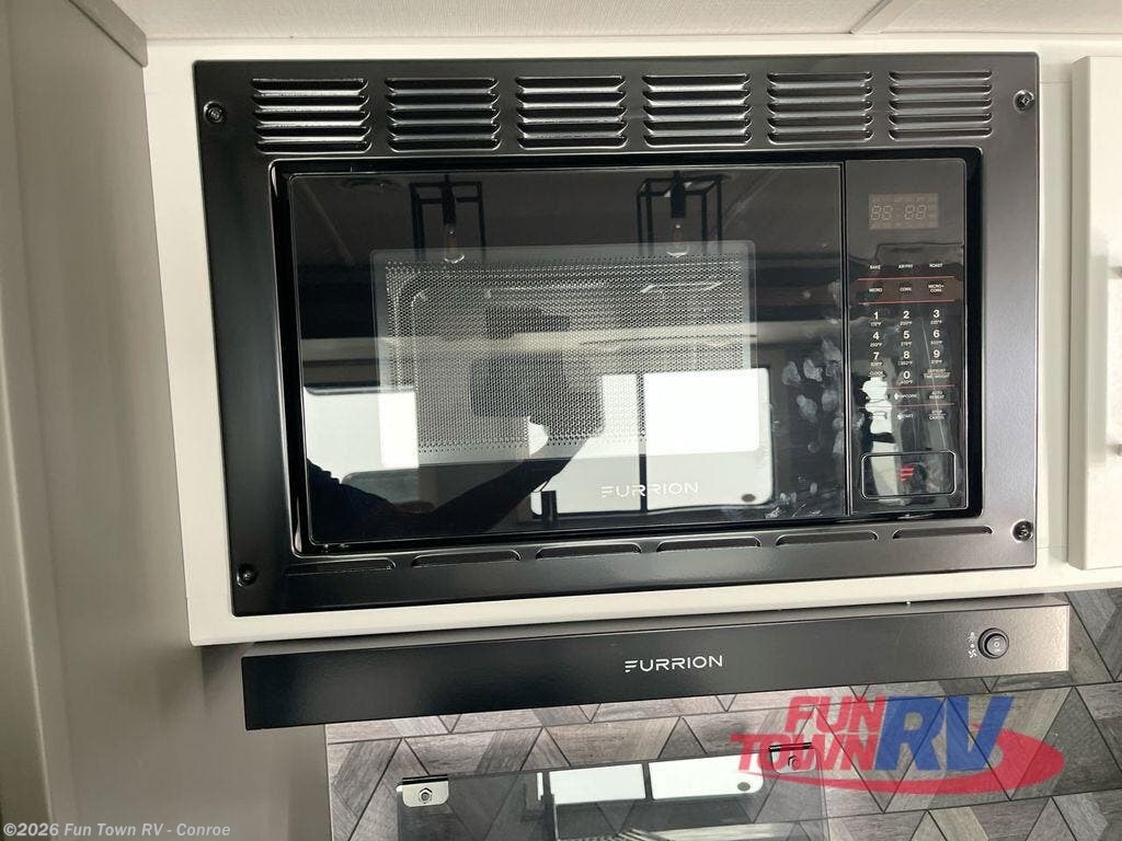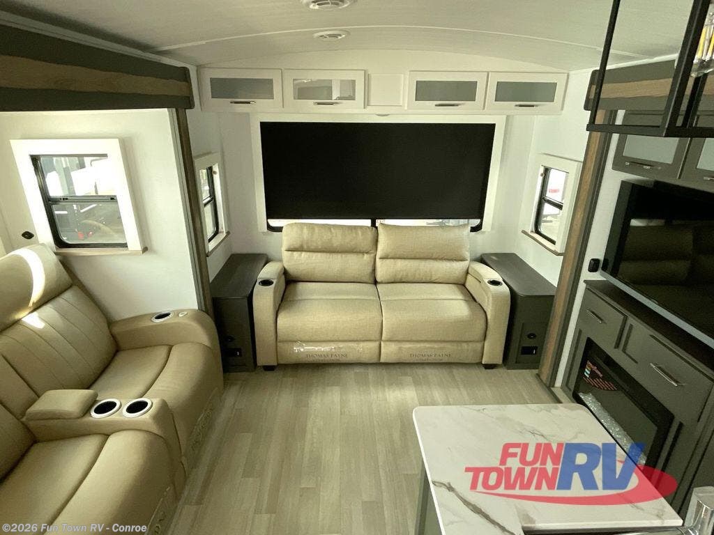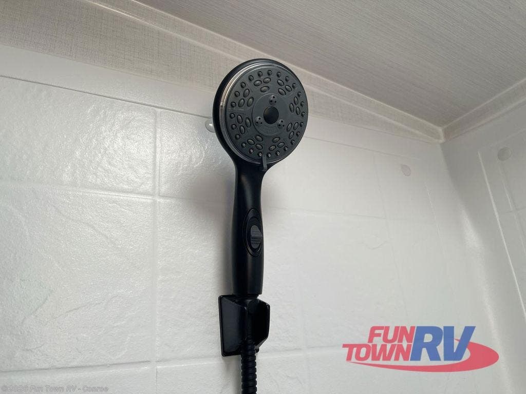 Weekend trips to the campground are made easy in this travel trailer! There are dual opposing slides in the combined kitchen and living area to provide you with ample space to stretch out. A kitchen island will come in handy when prepping meals, plus you'll have all the appliances needed to cook them. You will find comfortable seating on the rear tri-fold sofa sleeper, Do-More dinette table, and theater seats across from the entertainment center and fireplace. When you're ready to call it a night, the front private bedroom with a queen bed will be calling your name, and the full bath onboard will let you freshen up each day!