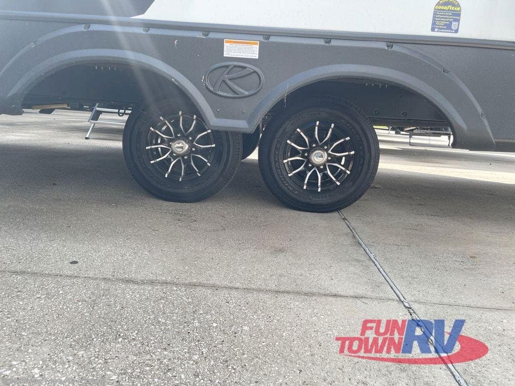 The Bullet Crossfire by Keystone are the perfect lightweight travel travel for rookie campers to seasoned RVers! Each one is built with a one-piece polypropylene underbelly, a fully walkable roof, and a high impact thermoset resin painted front cap for added durability. There is also a Dexter Torsion axle rubber ride suspension and Goodyear Endurance tires for a smooth tow plus a power tongue jack and power stabilizer jacks for easy set up. The interior will have you feeling right at home with deluxe night shades, updated Tranquil Timber decor, residential Beauflor vinyl flooring, and seamless kitchen countertops.