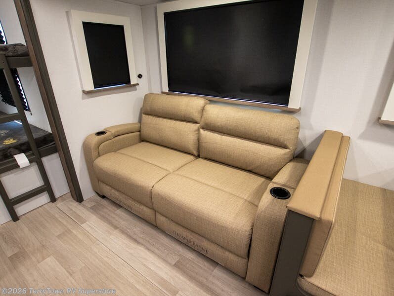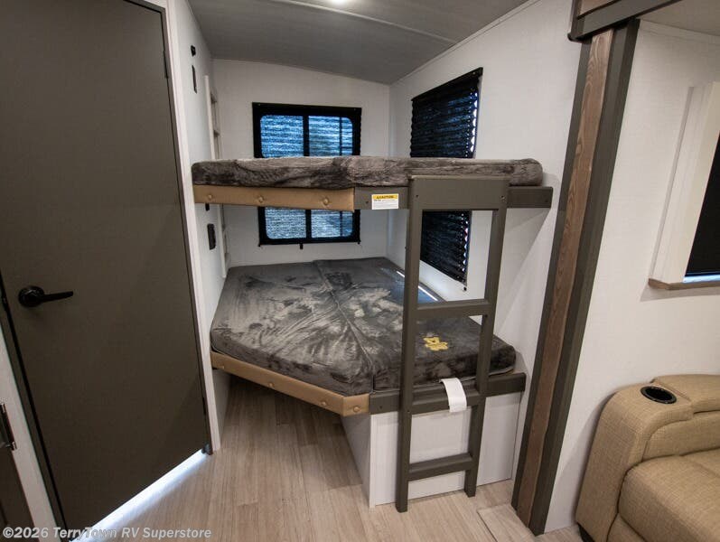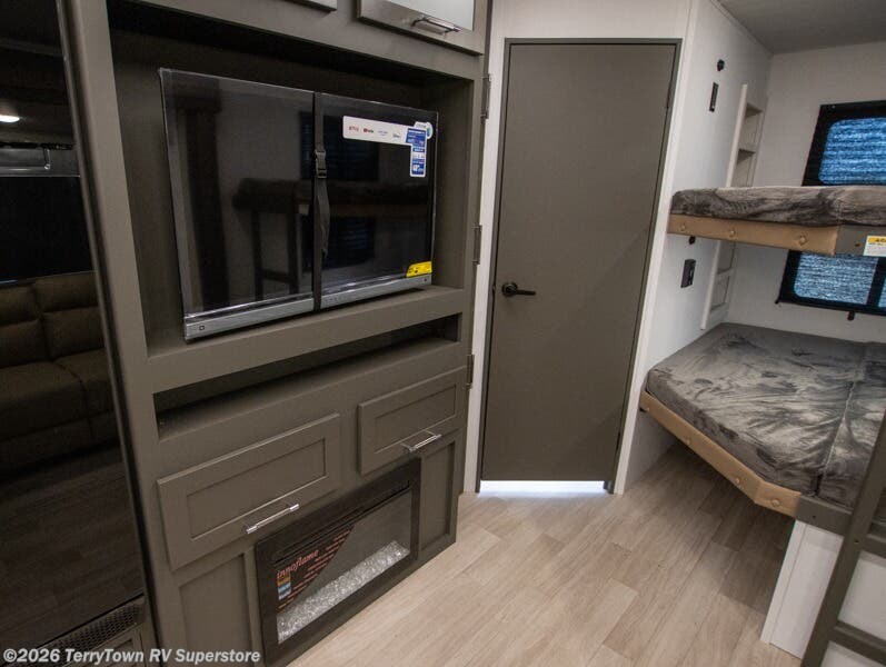 The whole gang will love camping in this travel trailer with double-size bunks, an outdoor kitchen, and a front private bedroom for the owners. You will find plenty of storage throughout, including storage under the flip-up bunk, a kitchen pantry, and an exterior pass-thru storage. Everyone can meet in the main living area to relax on the tri-fold sofa or play a game at the Do-More dinette table. There is even a fireplace across from the sofa for a cozy evening indoors. The chef of your group will have a fully-equipped indoor kitchen plus an outdoor kitchen to cook meals each day. And since there are dual entry doors, you can enter in through the kitchen or full bathroom for convenience!