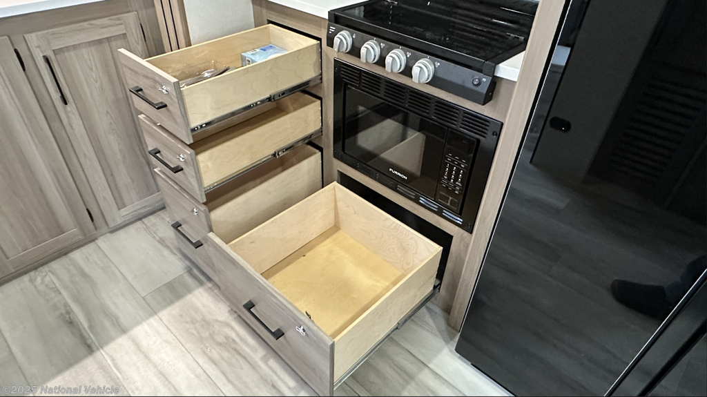 - Residential 16 cu. ft. 12-volt refrigerator, nearly double typical RV fridges; runs while towing so food stays cold on the road