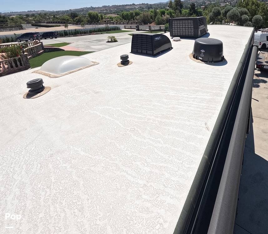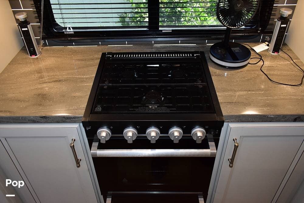 The gourmet kitchen includes solid surface countertops, an island, stainless steel appliances, and a residential-size refrigerator - perfect for extended trips or full-time living.