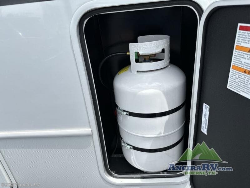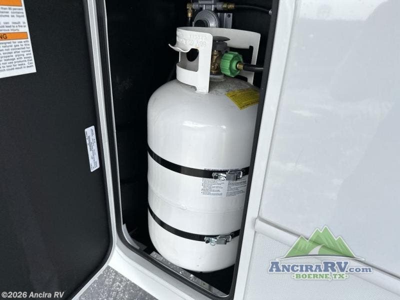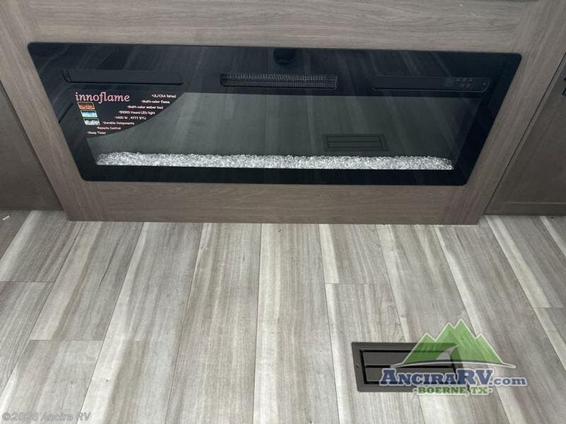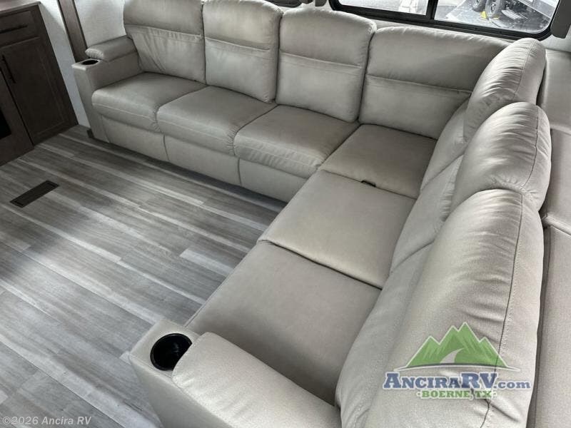 Time at the campground will be spent in comfort thanks to this fifth wheel that can sleep four to six people comfortably. The rear living area/den includes a huge L-shaped sofa with theater seats and a king tri-fold sofa, plus a free-standing dinette with an ottoman on one side, a fireplace, and an LED HDTV for movie nights. The chef of your group will love the additional counter space in the kitchen, along with a 21" Furrion range, plus a pantry and 16 cu. ft. 12V refrigerator. The full bath allows you to clean up each day and the front private bedroom will provide you with your own space at night. Here, you'll find a queen bed slide out that can optioned out for a king bed, plus a full height wardrobe, a second wardrobe with washer and dryer prep, and a dresser with a sliding top and hidden storage for valuables!