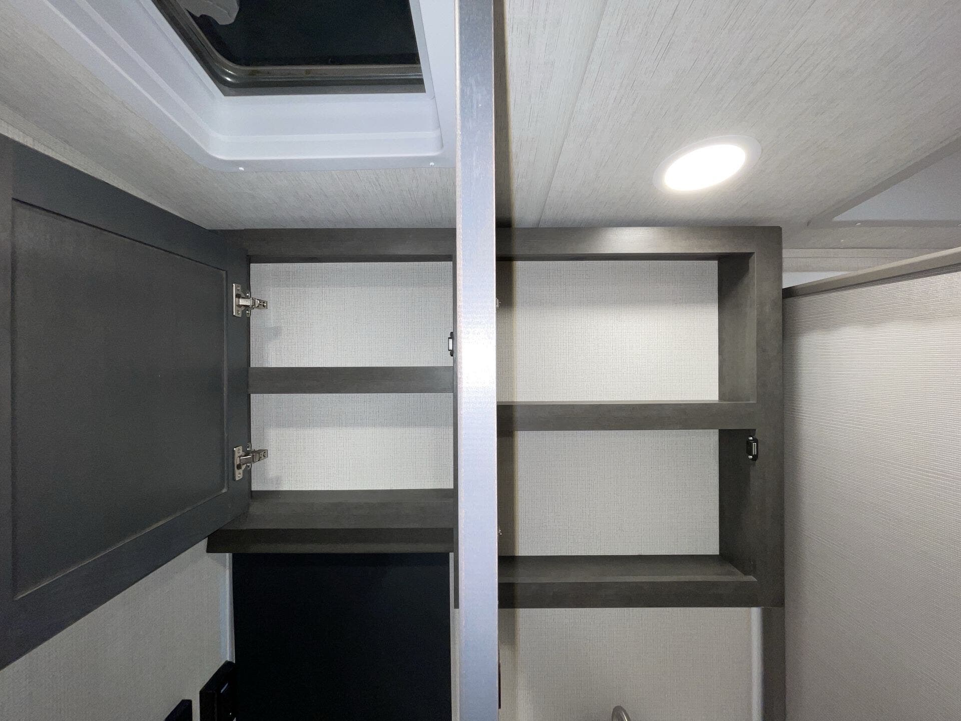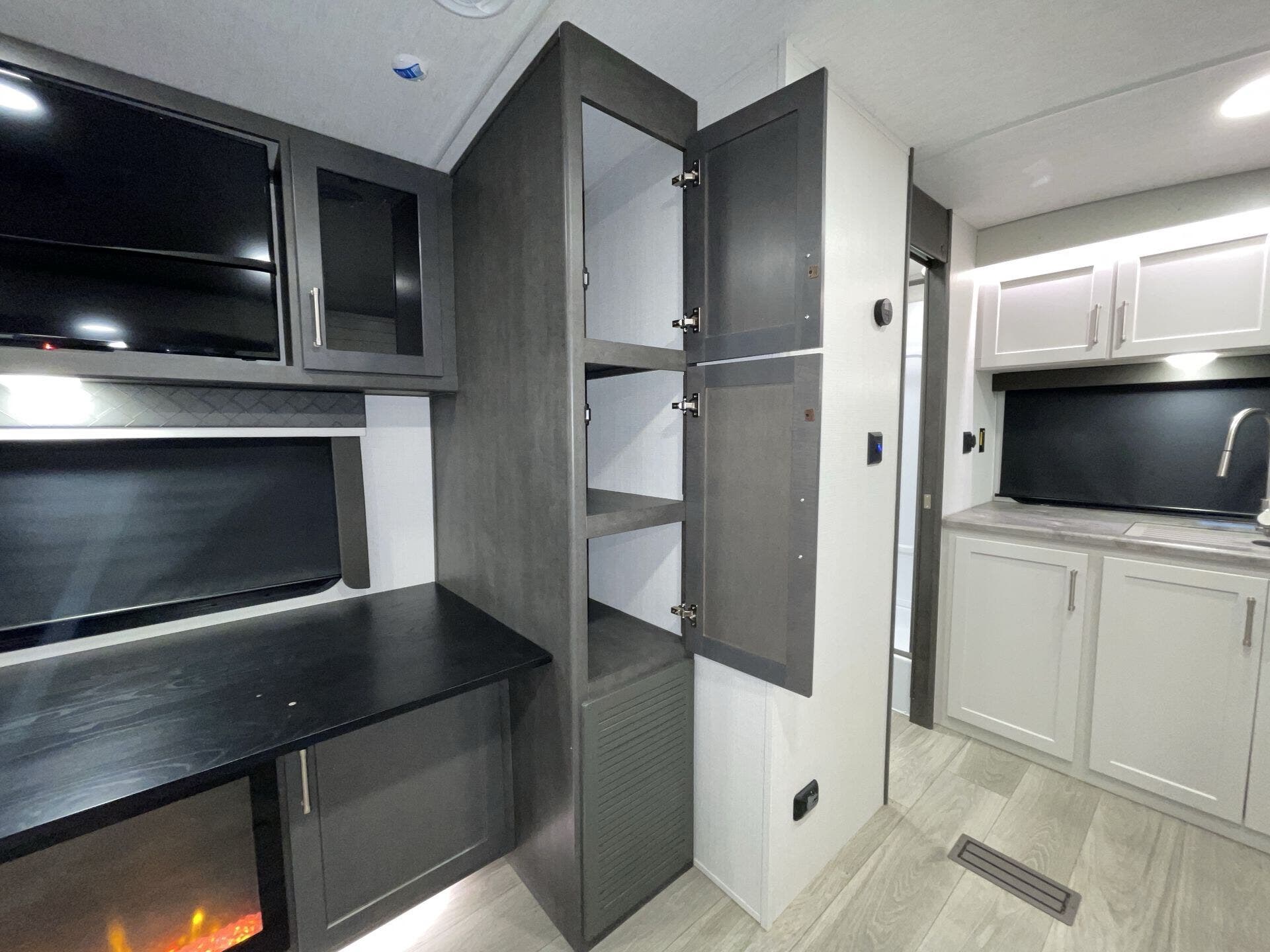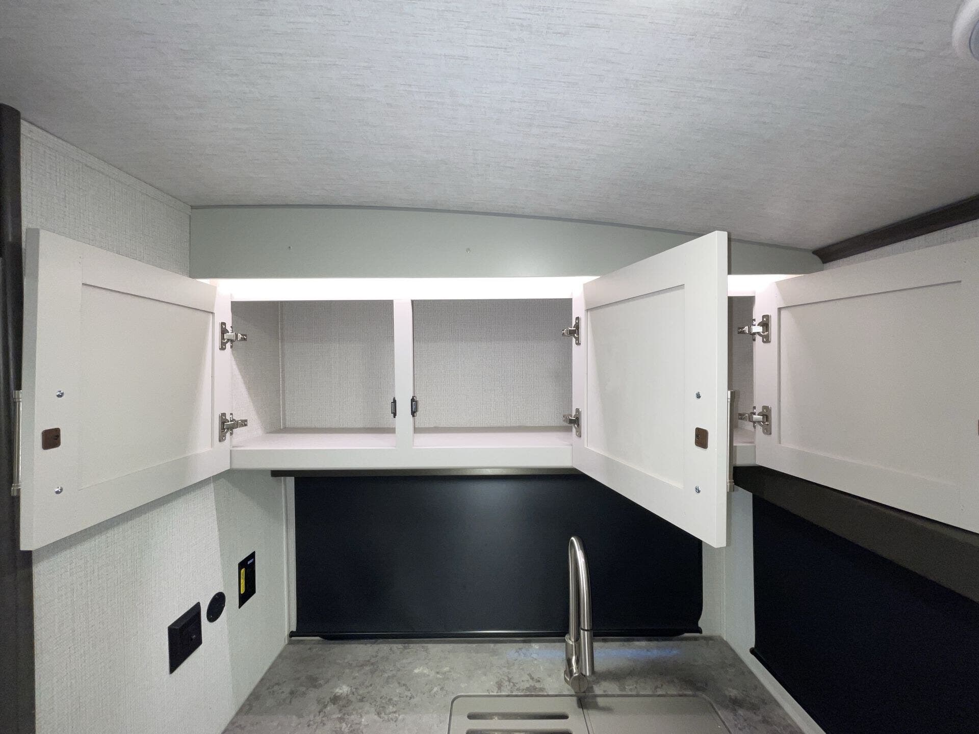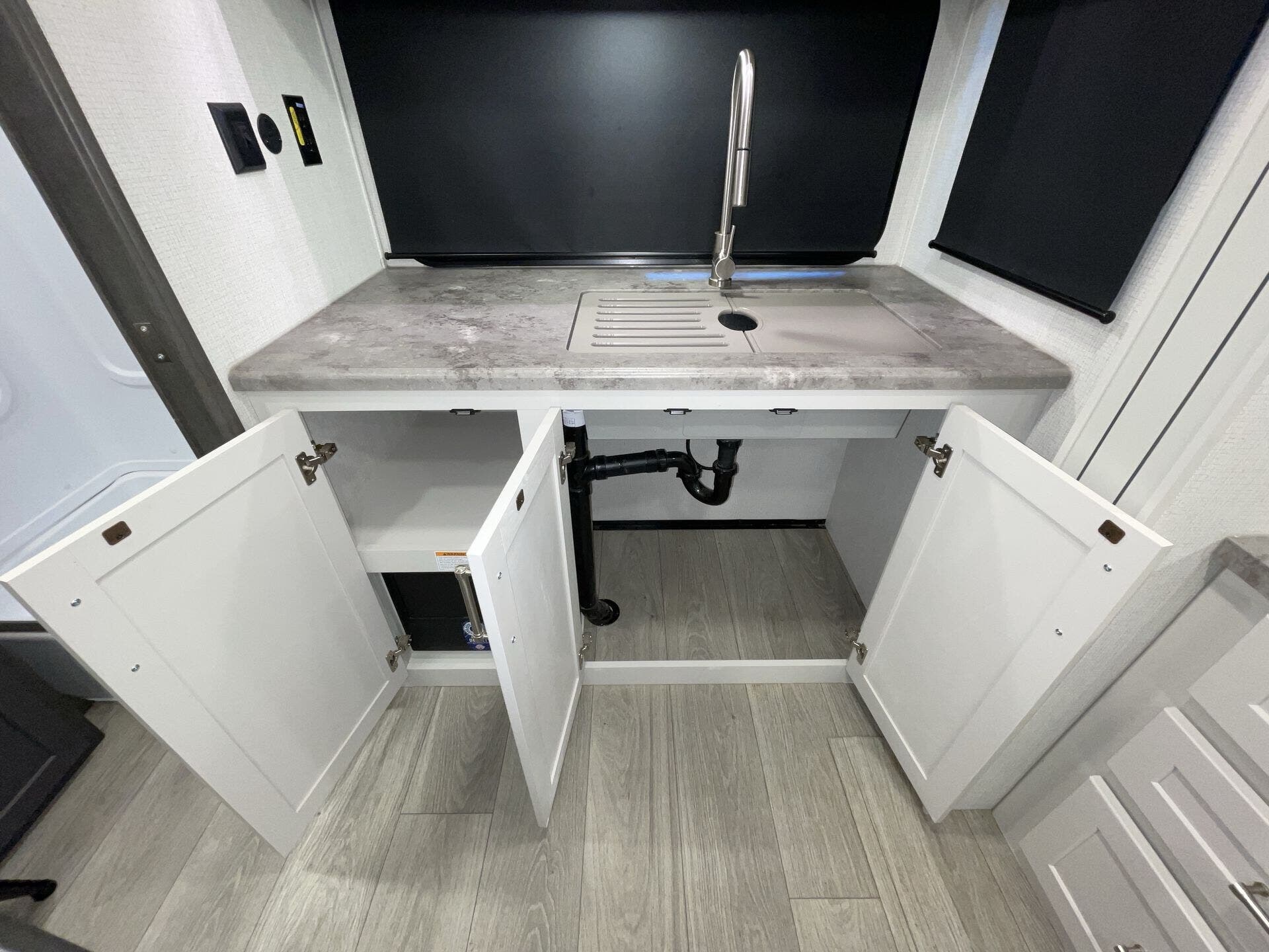 At the front, you’ll find a private bedroom with a king bed—a standout feature in this size class—plus bedside storage to keep essentials close at hand. The mid-living layout creates a comfortable space to relax, while the kitchen is set up for real camping meals with generous counter space and everyday convenience.