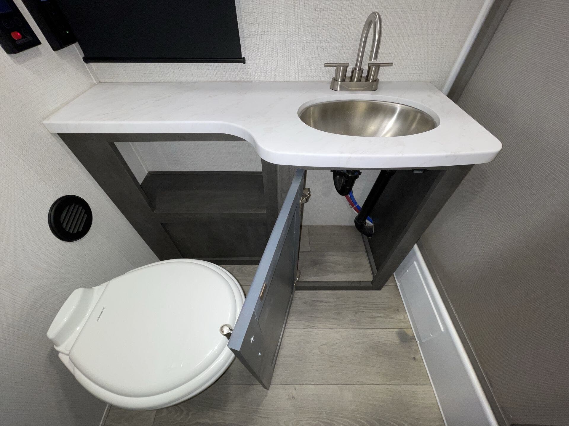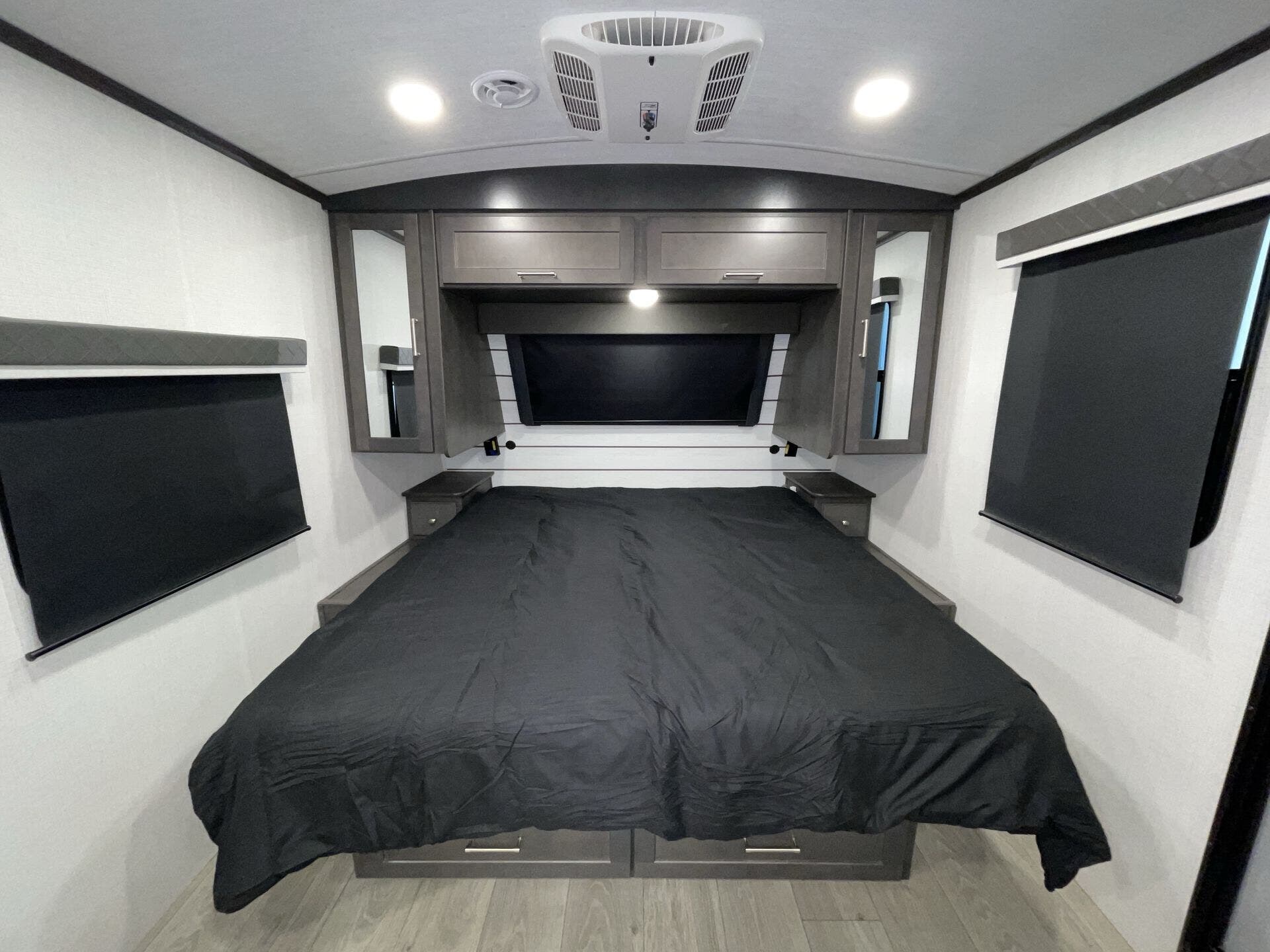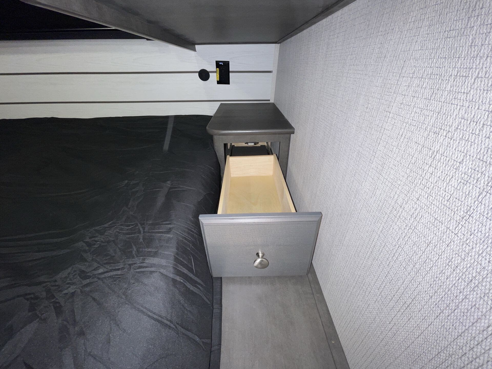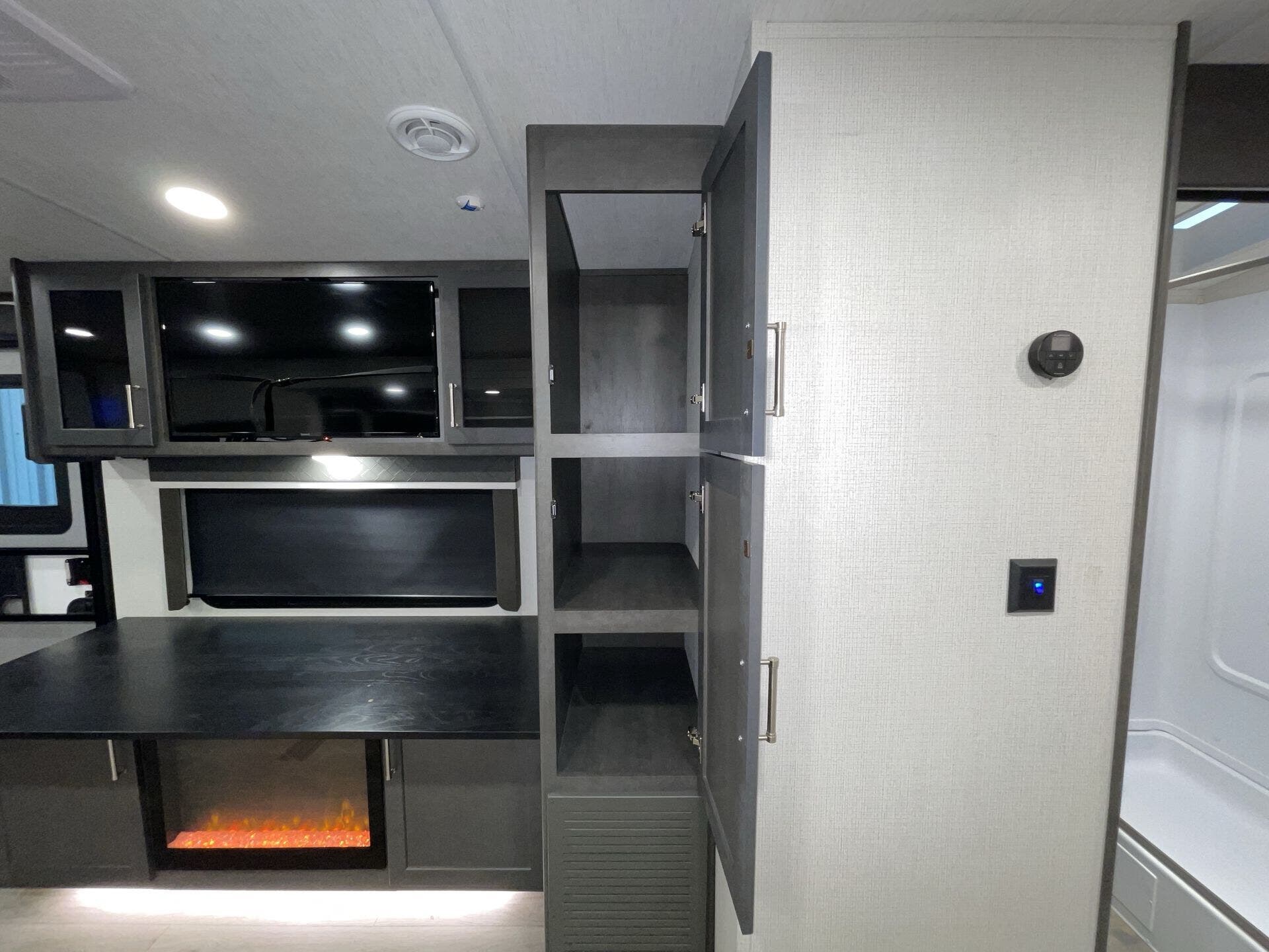 At the front, you’ll find a private bedroom with a king bed—a standout feature in this size class—plus bedside storage to keep essentials close at hand. The mid-living layout creates a comfortable space to relax, while the kitchen is set up for real camping meals with generous counter space and everyday convenience.