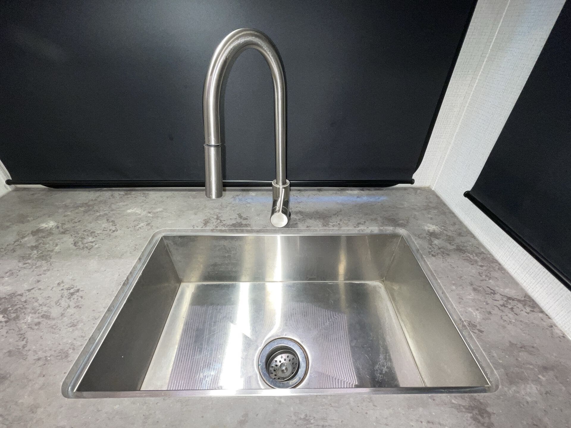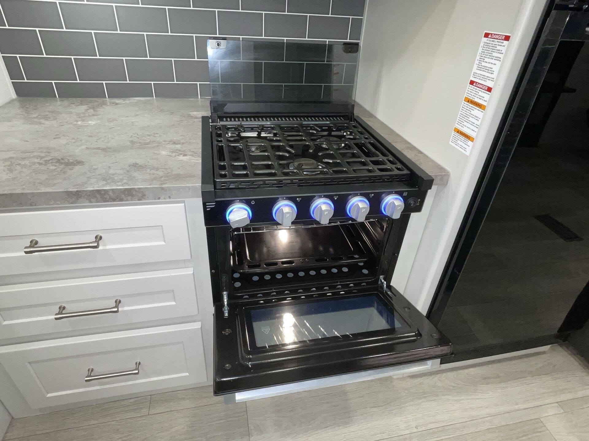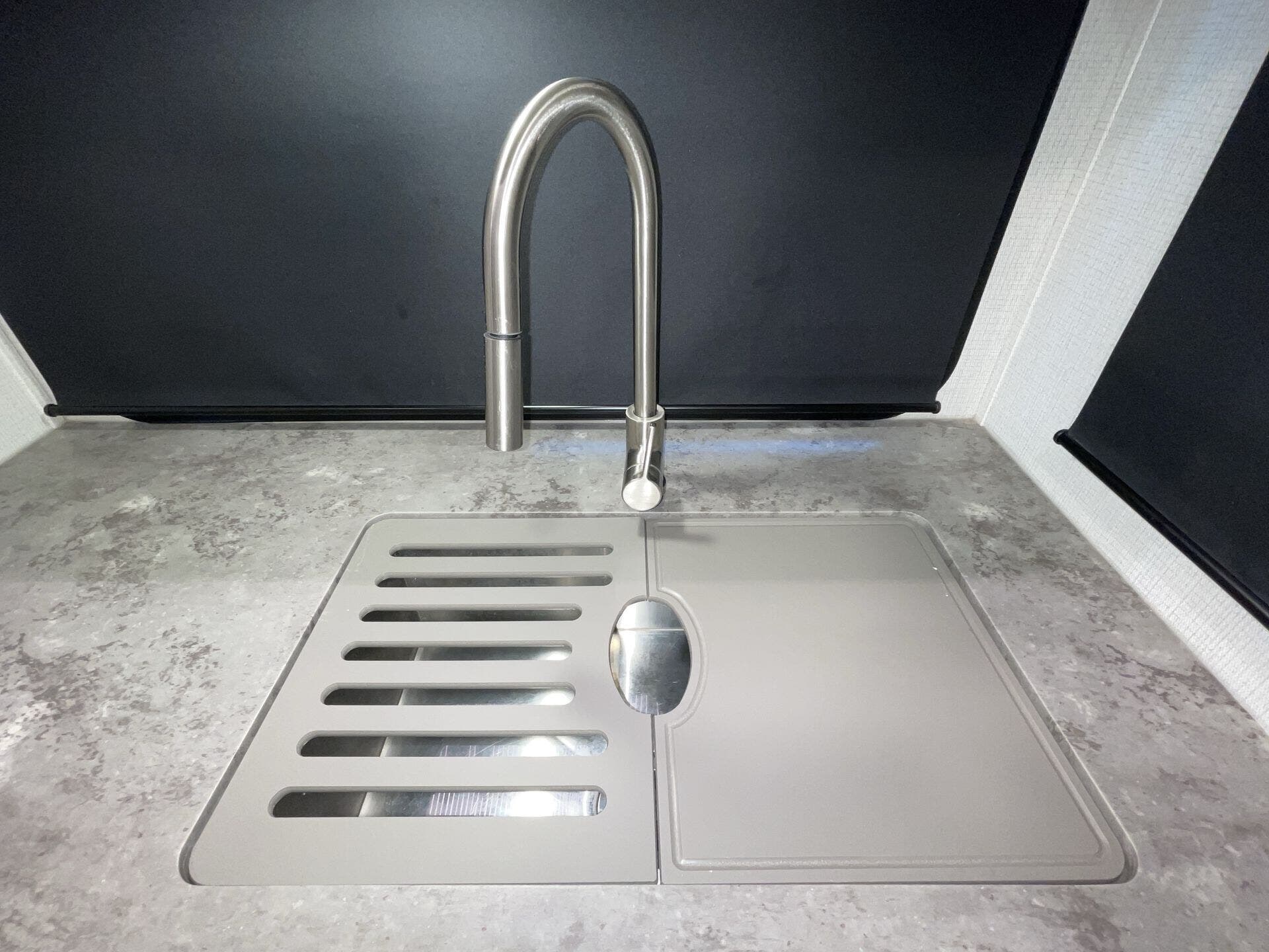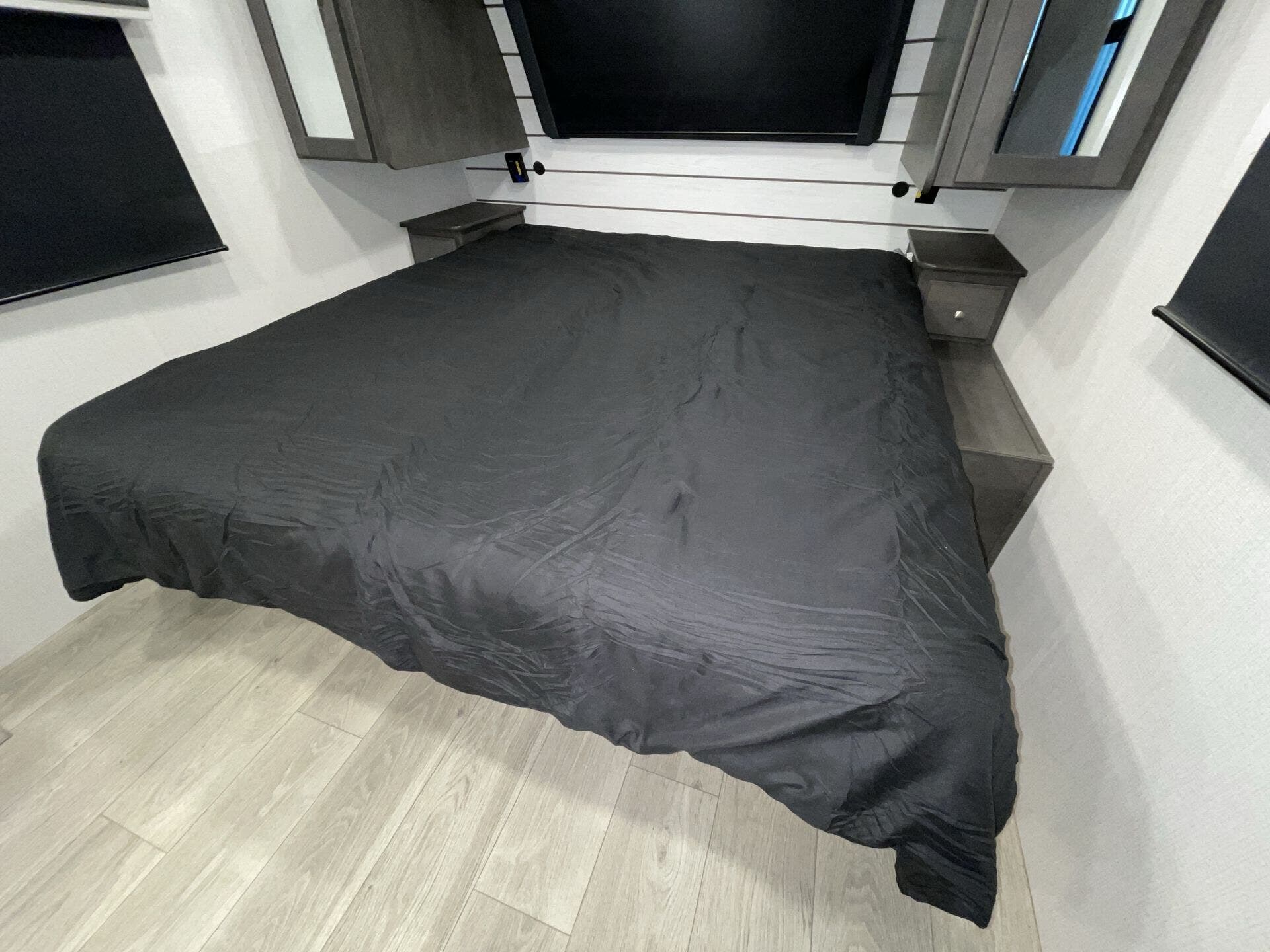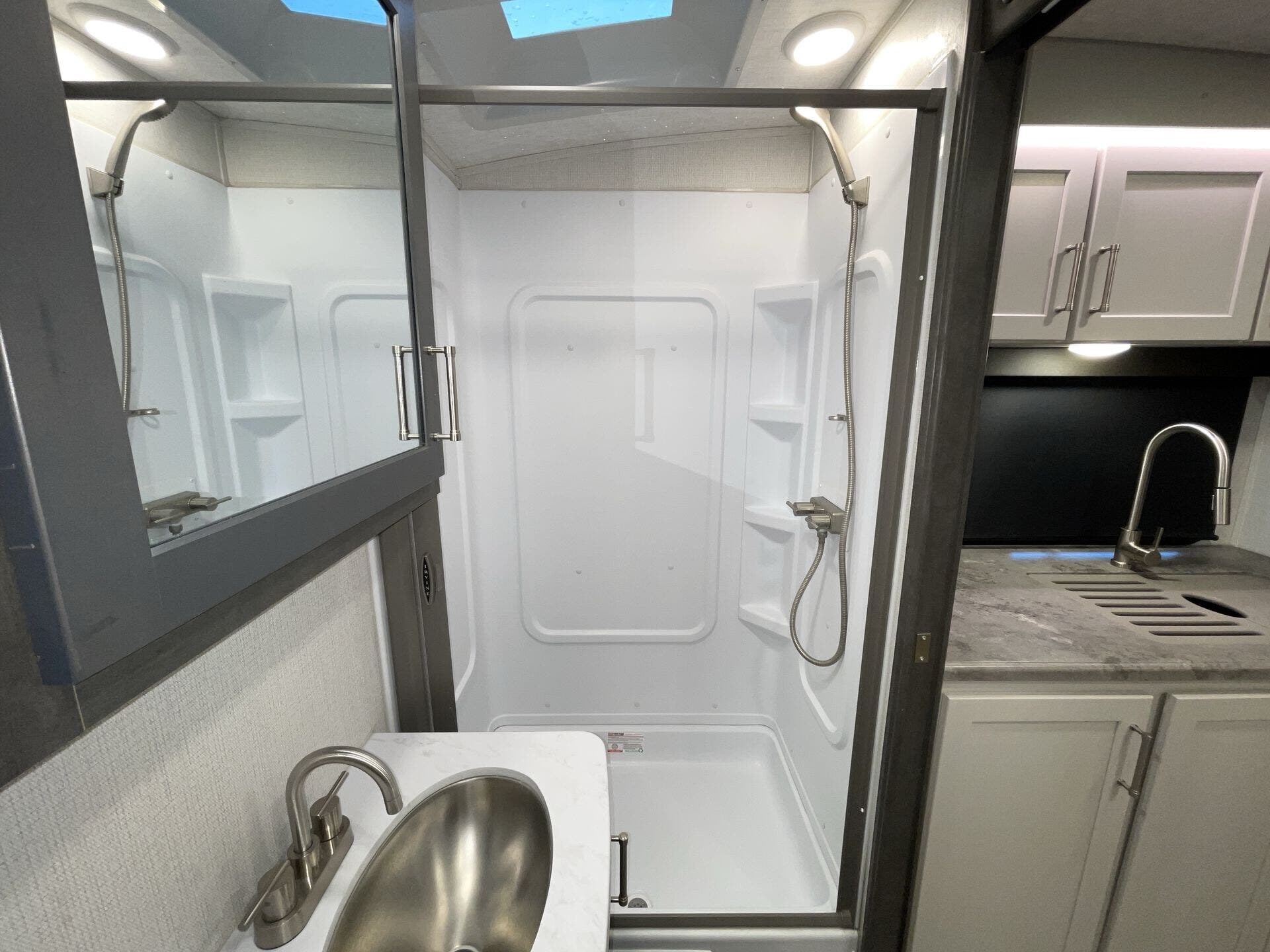 At the front, you’ll find a private bedroom with a king bed—a standout feature in this size class—plus bedside storage to keep essentials close at hand. The mid-living layout creates a comfortable space to relax, while the kitchen is set up for real camping meals with generous counter space and everyday convenience.