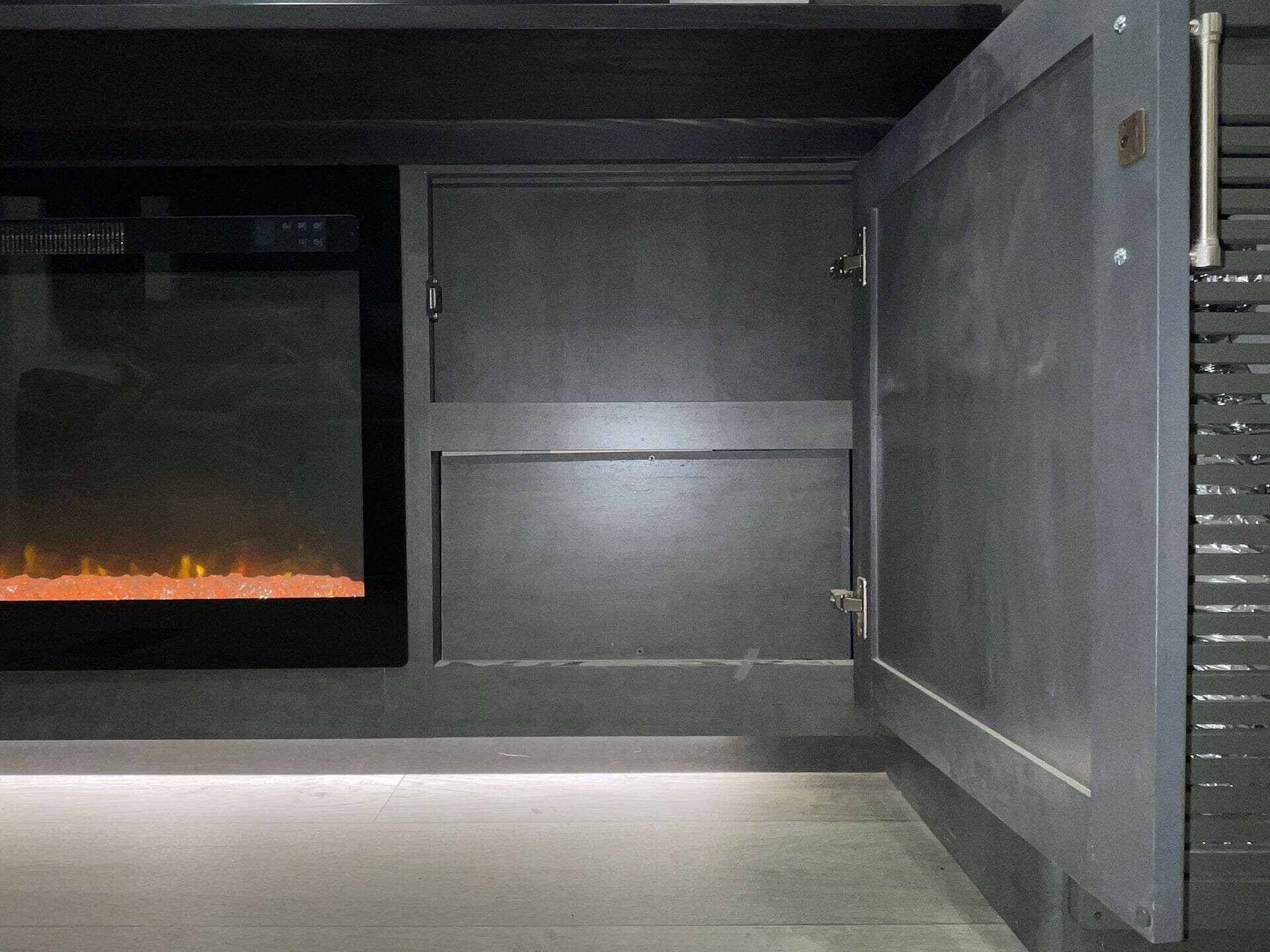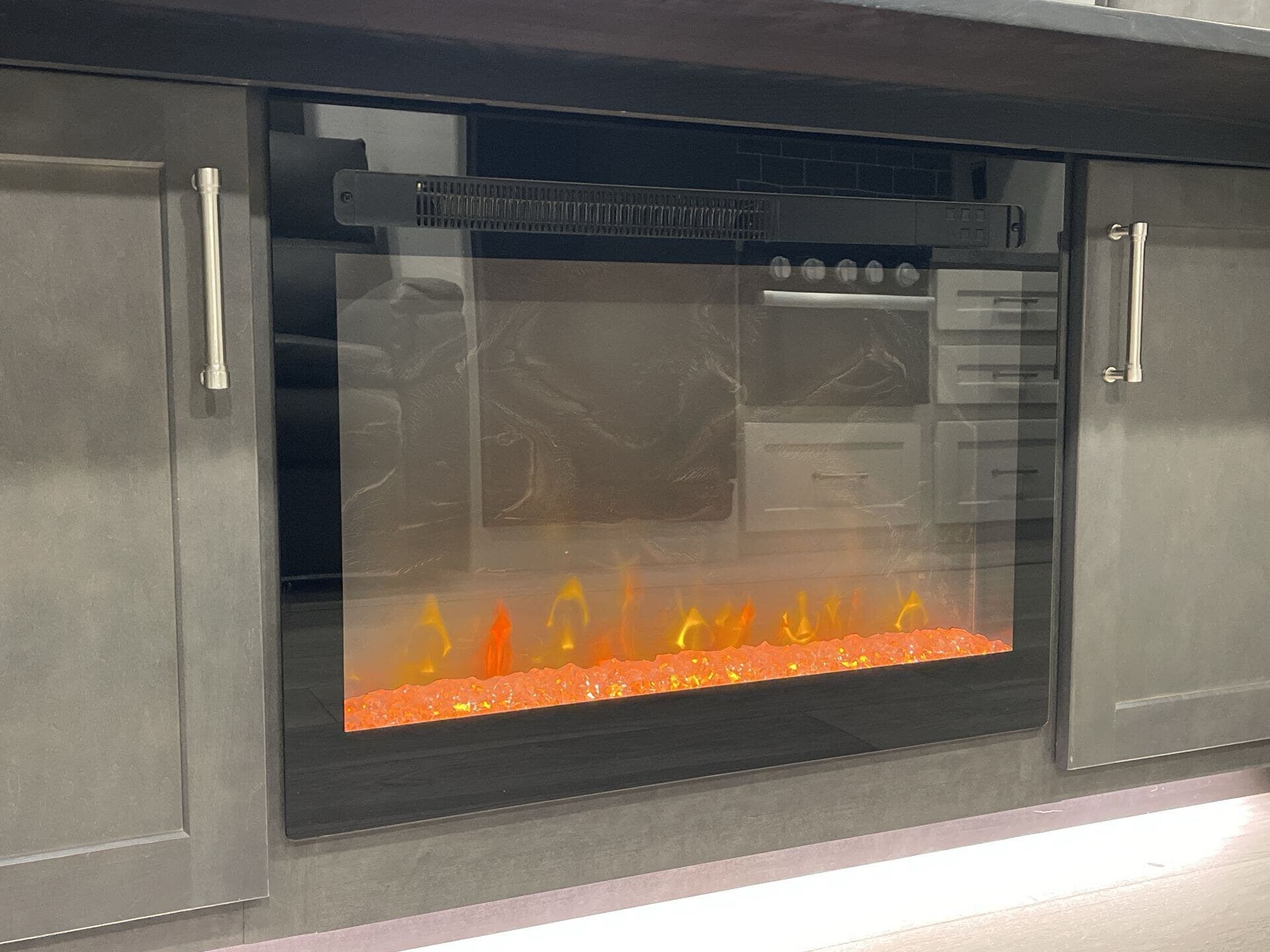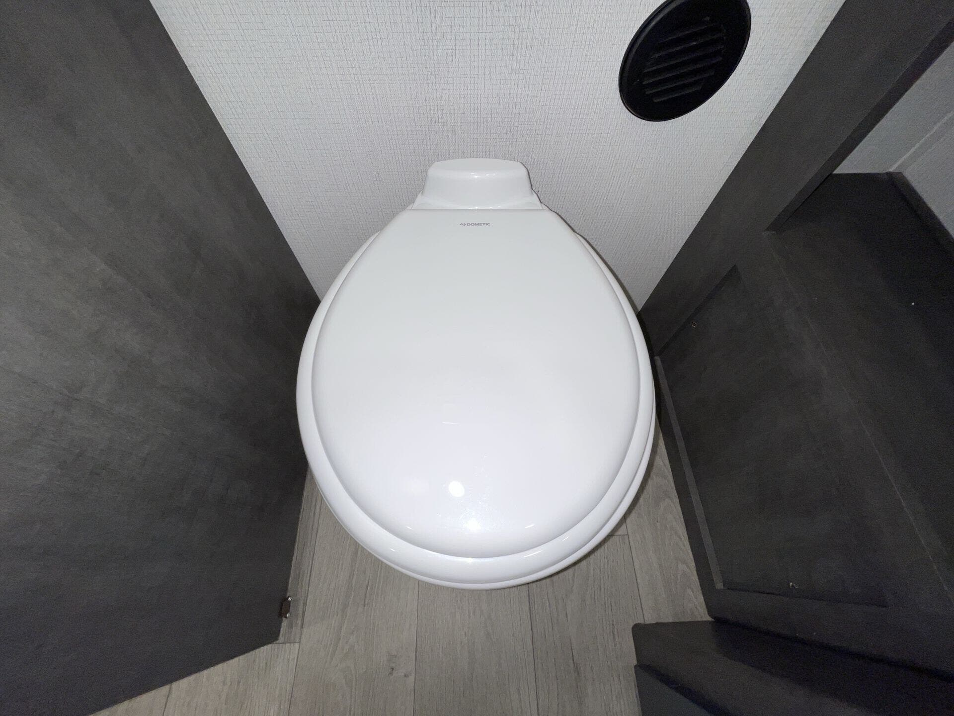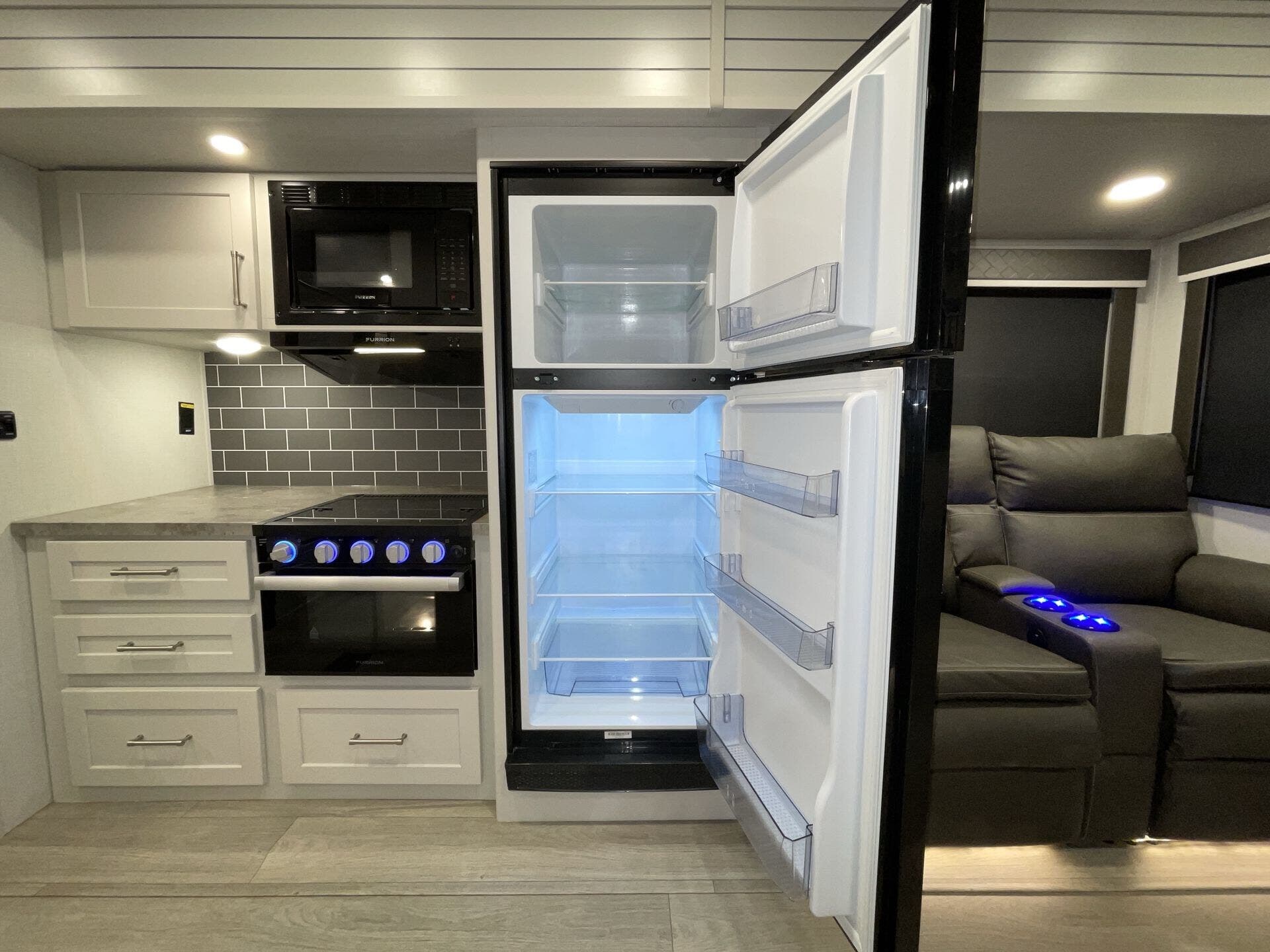At the front, you’ll find a private bedroom with a king bed—a standout feature in this size class—plus bedside storage to keep essentials close at hand. The mid-living layout creates a comfortable space to relax, while the kitchen is set up for real camping meals with generous counter space and everyday convenience.